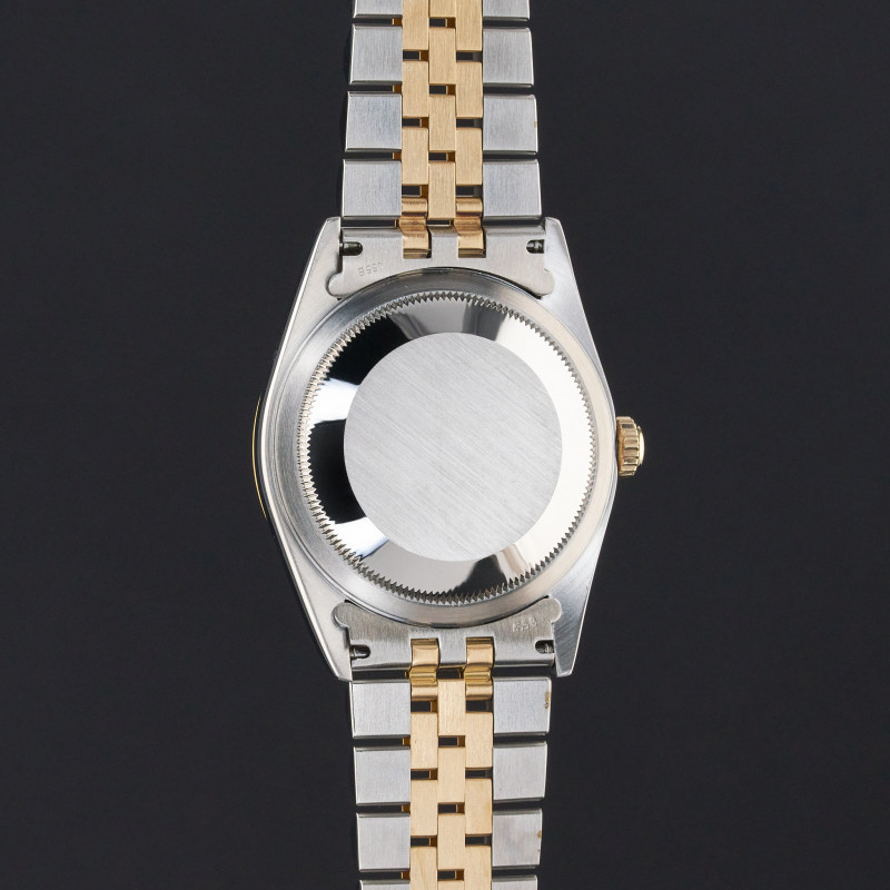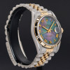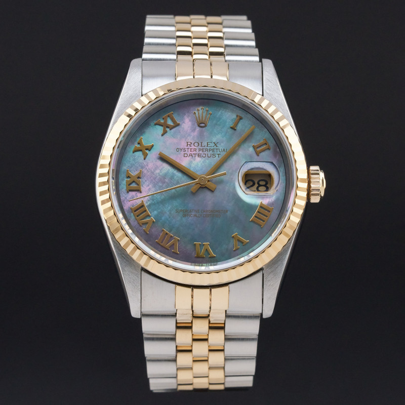 This Rolex Datejust 16233 features a Tahitian Mother of Pearl Roman dial and is crafted from 18K yellow gold and stainless steel, with a production year of 1996.