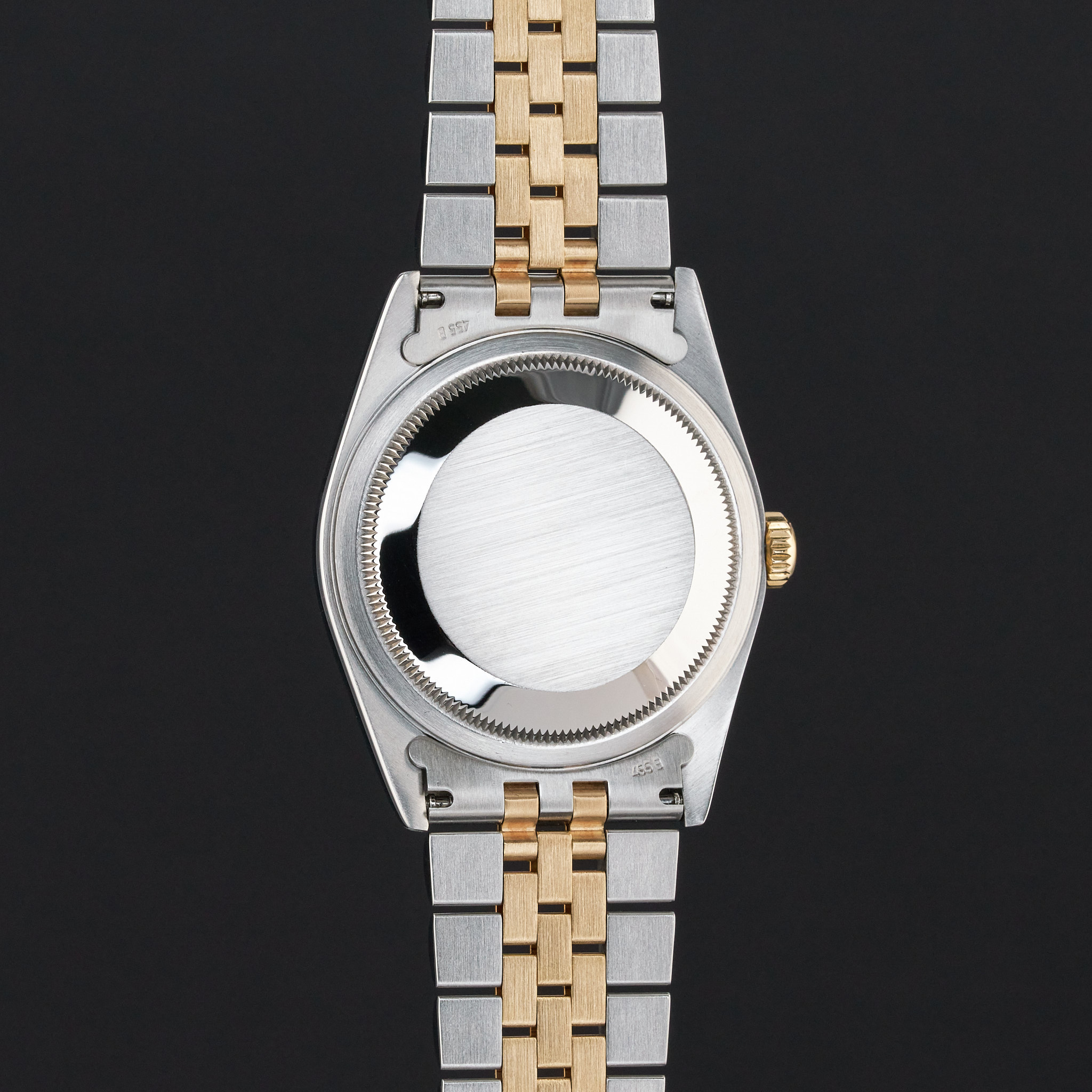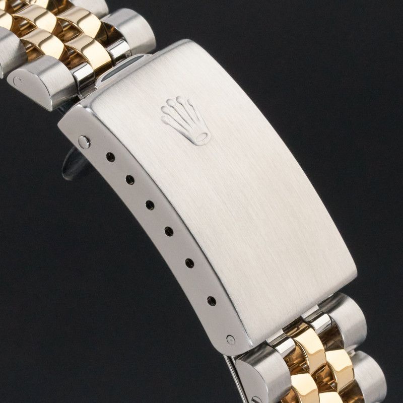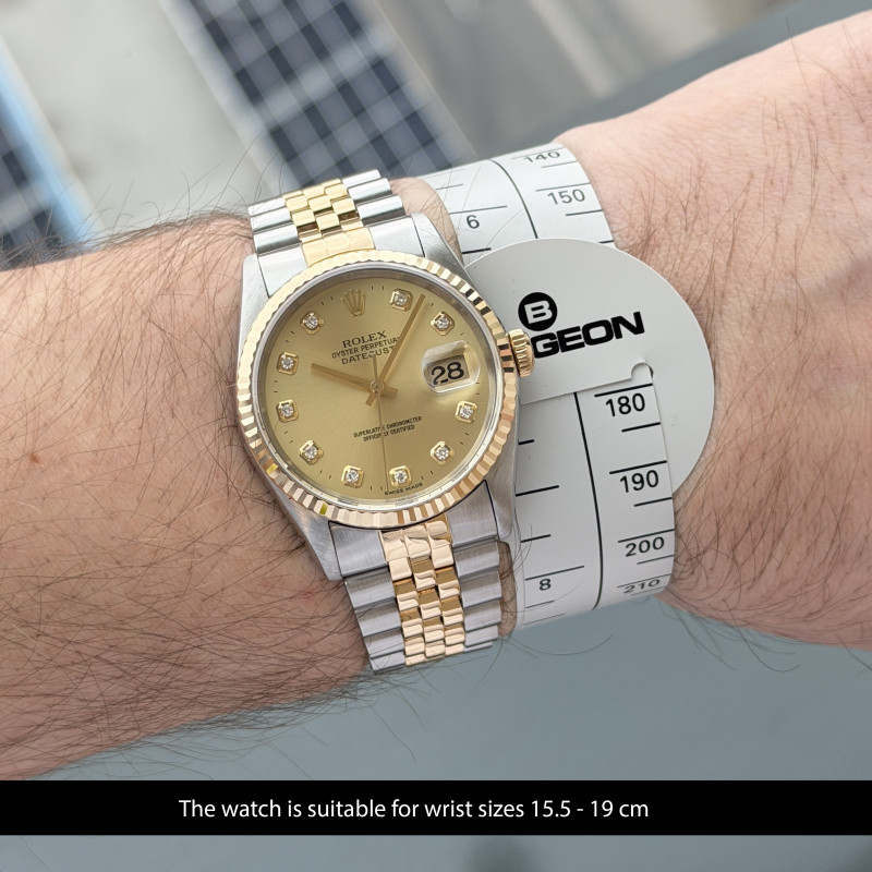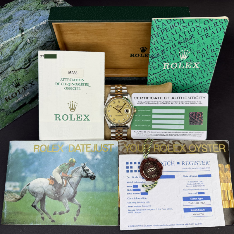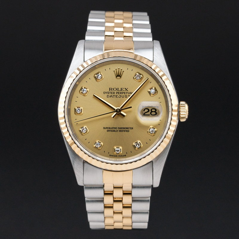 This Rolex Datejust 16233 features a Champagne big diamond dial and is crafted from 18K yellow gold and stainless steel, with a production year of 1998.