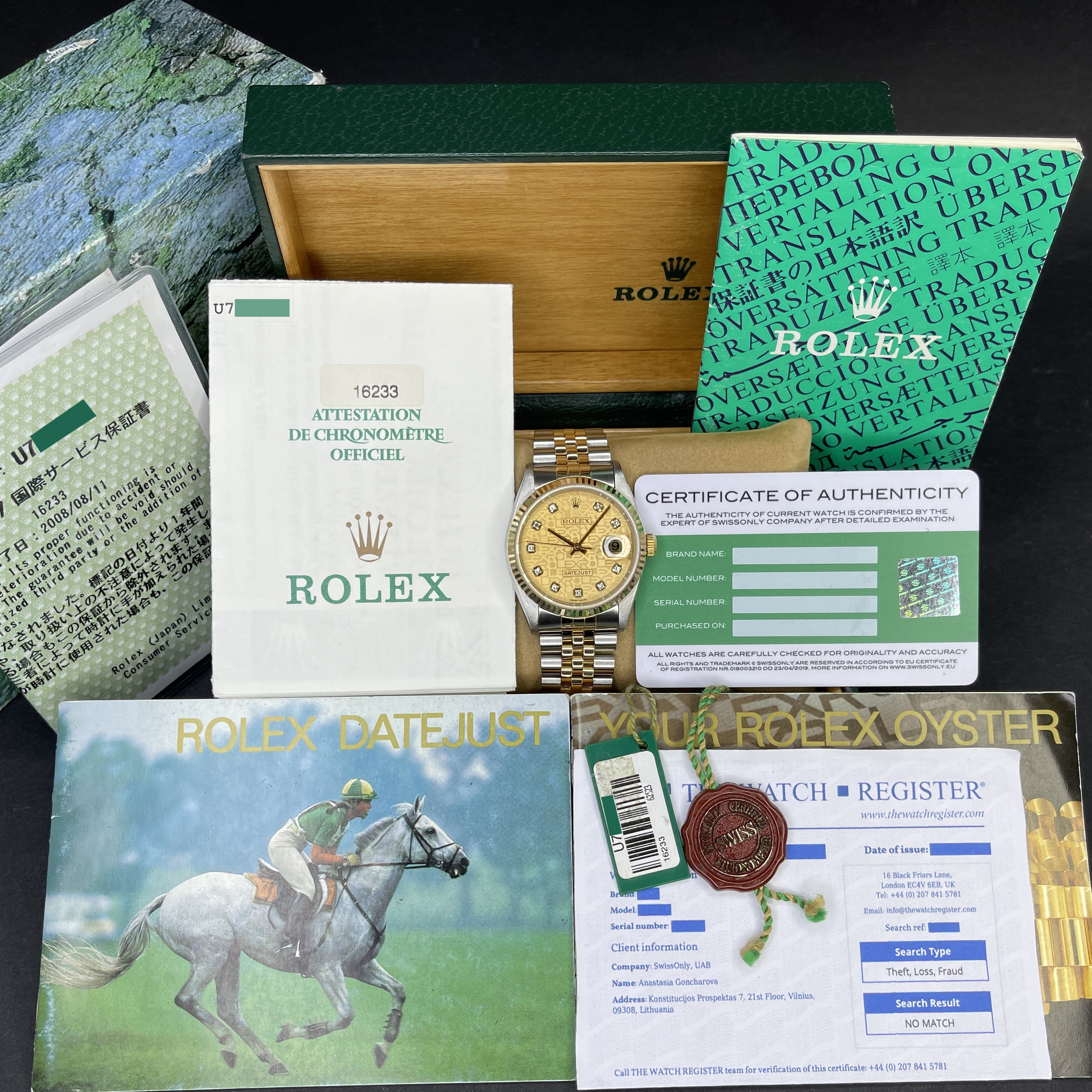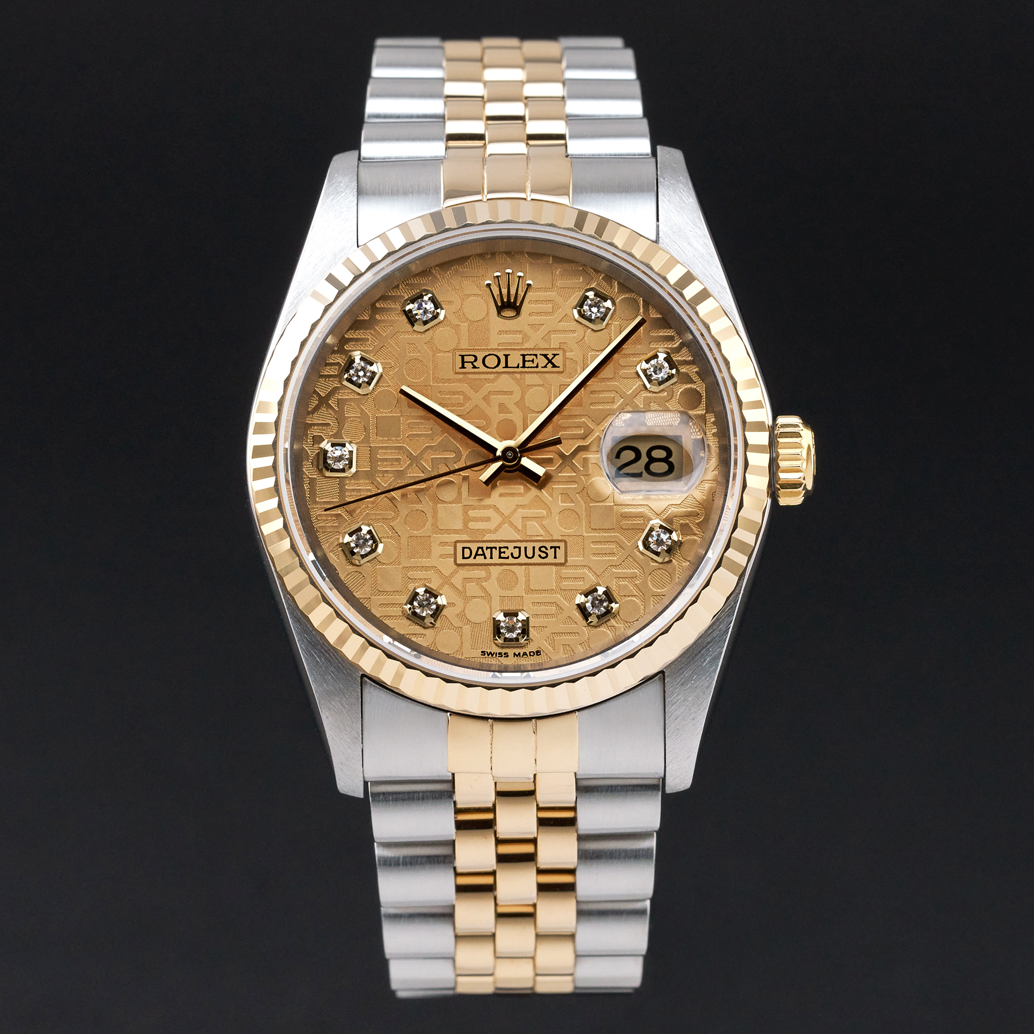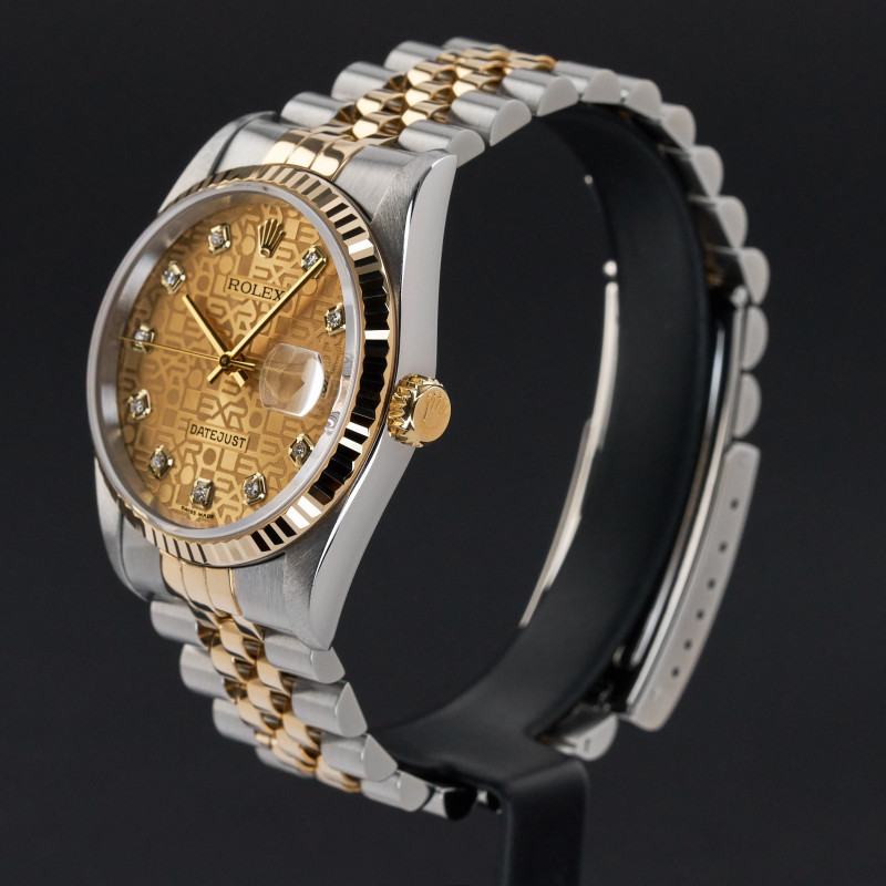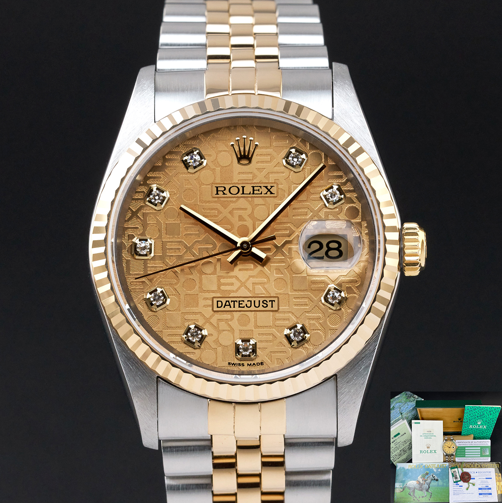 This Rolex Datejust 16233 features a Champagne jubilee big diamond dial and is crafted from 18K yellow gold and stainless steel, with a production year of 1998.