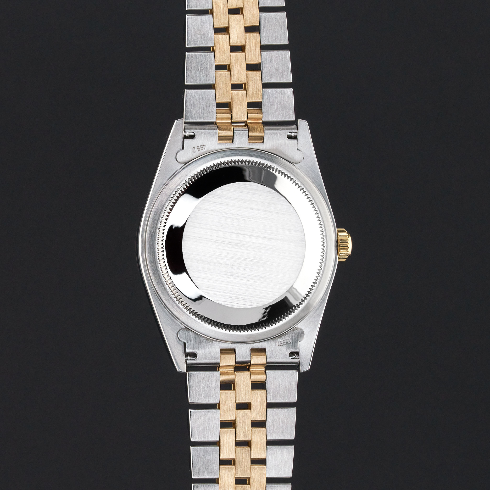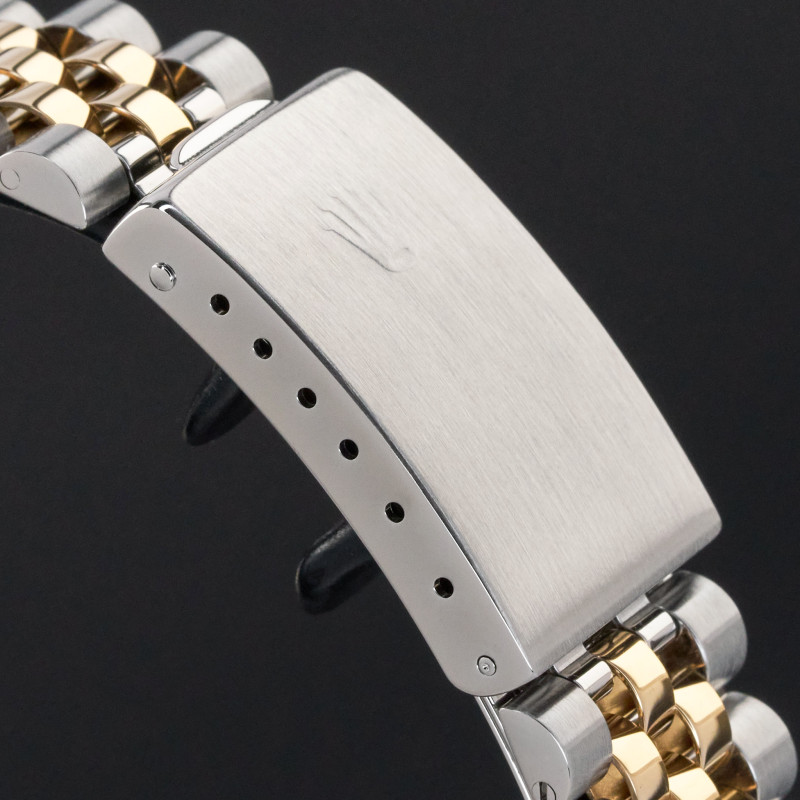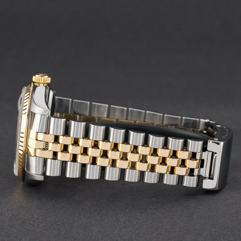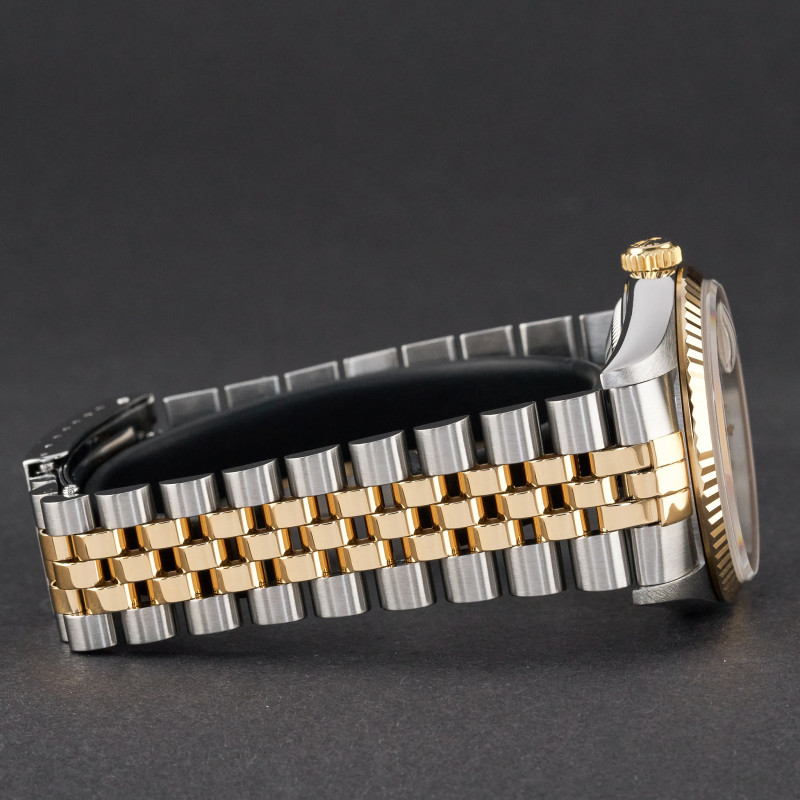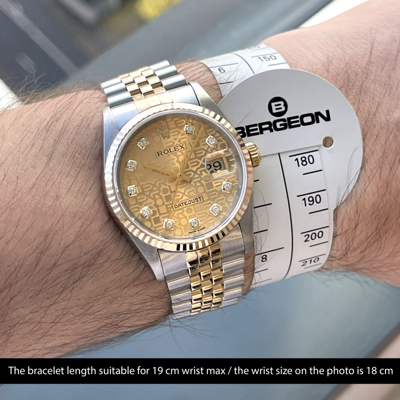 This Rolex Datejust 16233 features a Champagne jubilee big diamond dial and is crafted from 18K yellow gold and stainless steel, with a production year of 1998.