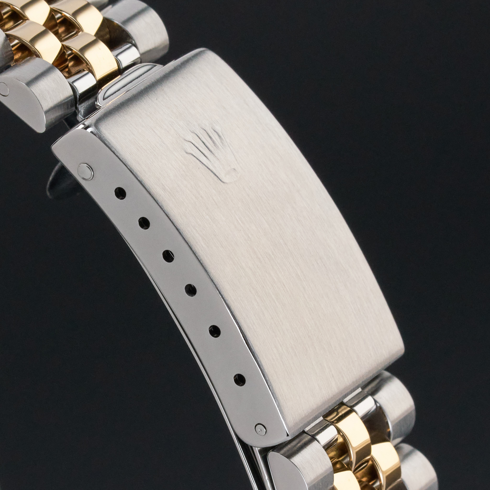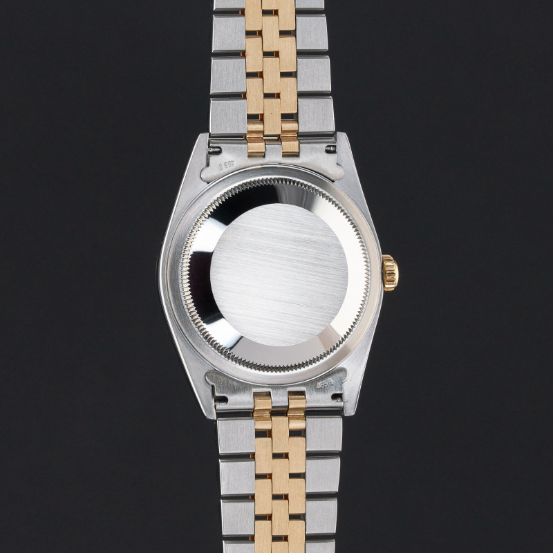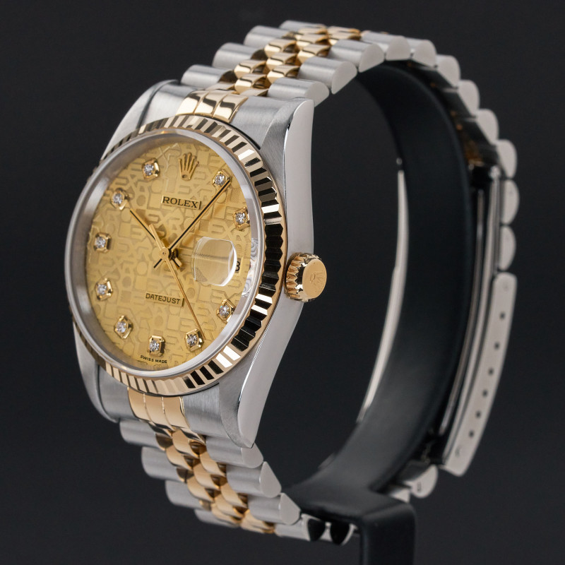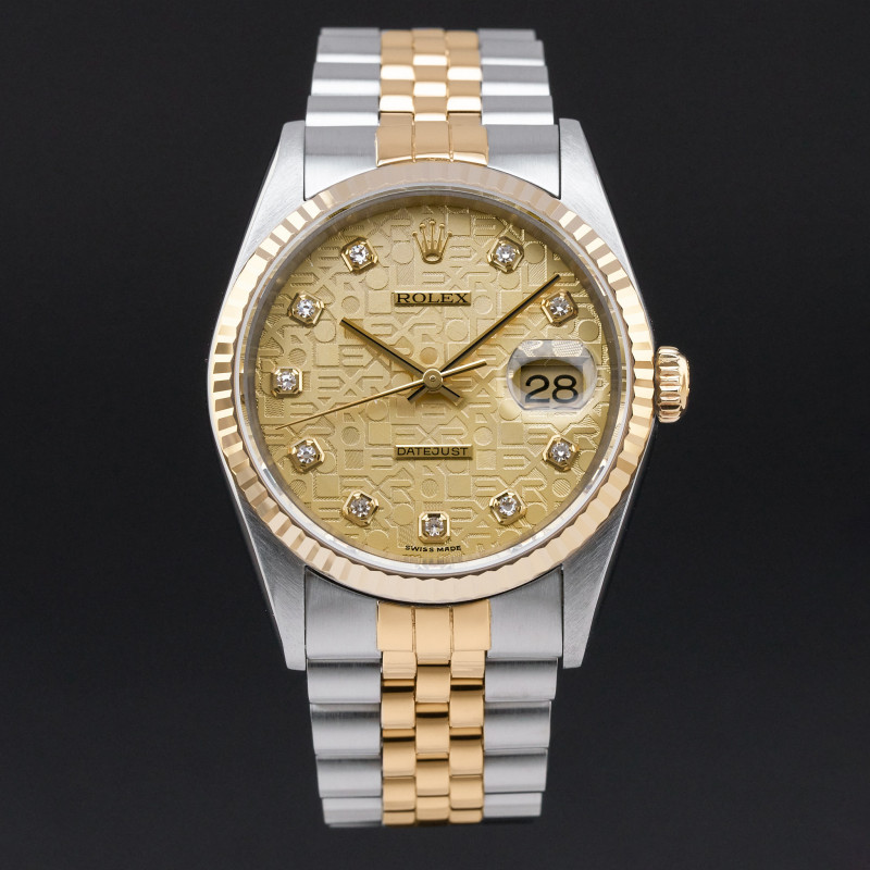 This Rolex Datejust 16233 features a Champagne jubilee big diamond dial and is crafted from 18K yellow gold and stainless steel, with a production year of 1999.