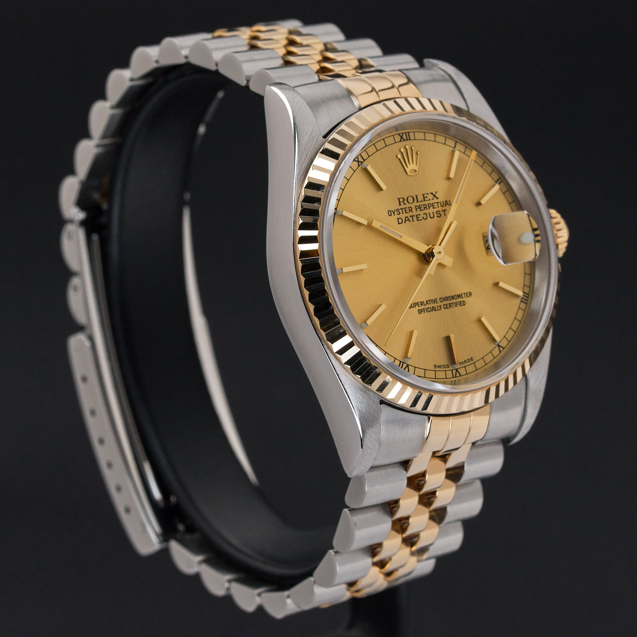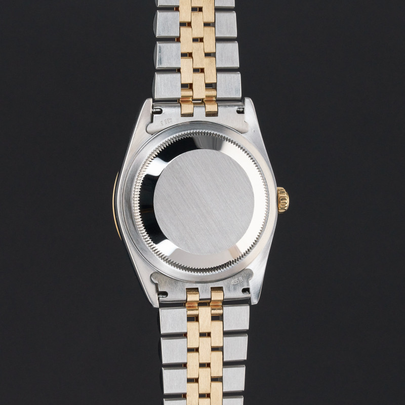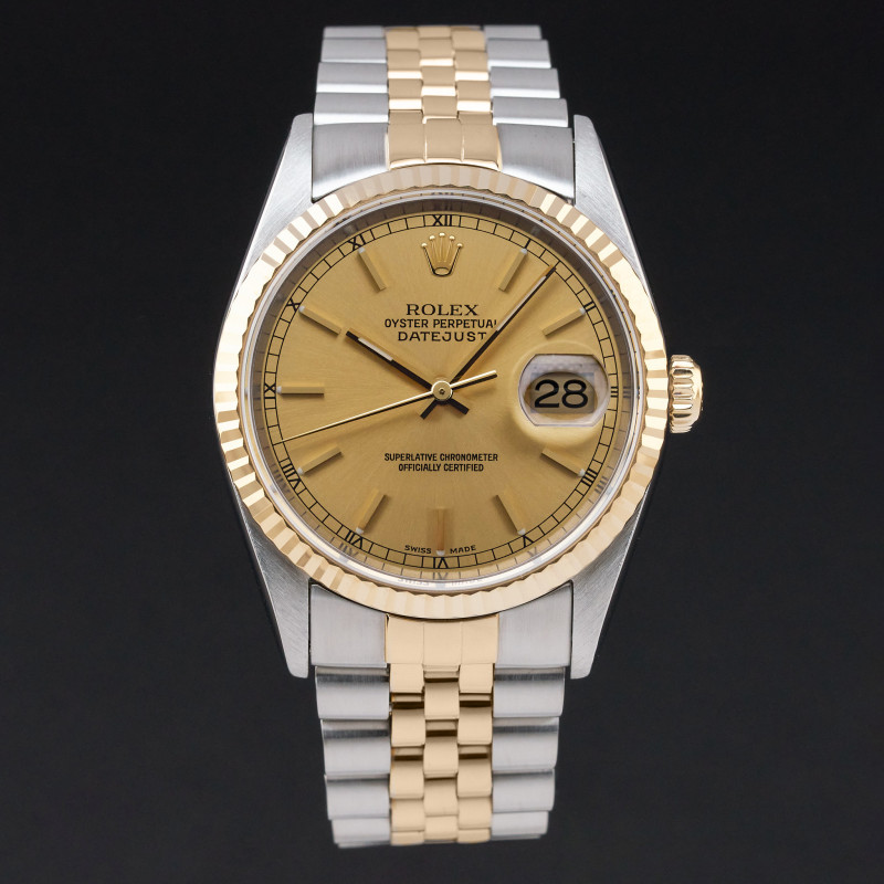 This Rolex Datejust 16233 features a Champagne dial and is crafted from 18K yellow gold and stainless steel, with a production year of 2000.