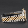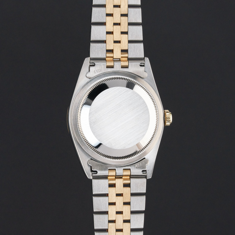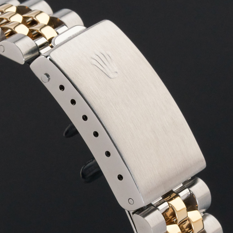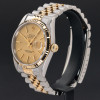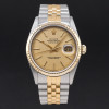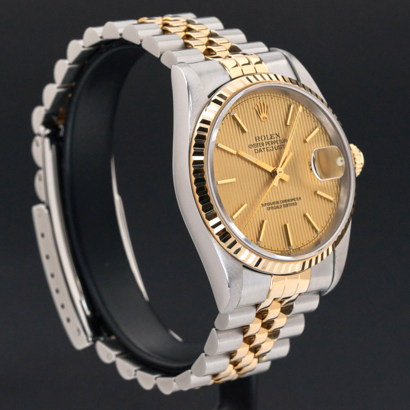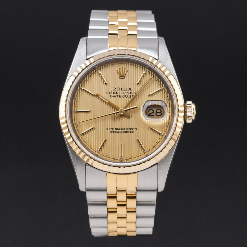 This Rolex Datejust 16233 features a Champagne tapestry dial and is crafted from 18K yellow gold and stainless steel, with a production year of 2000.