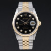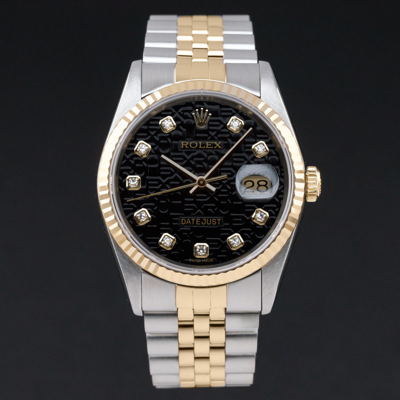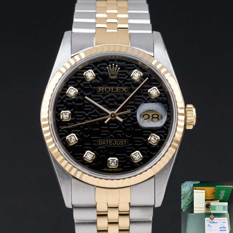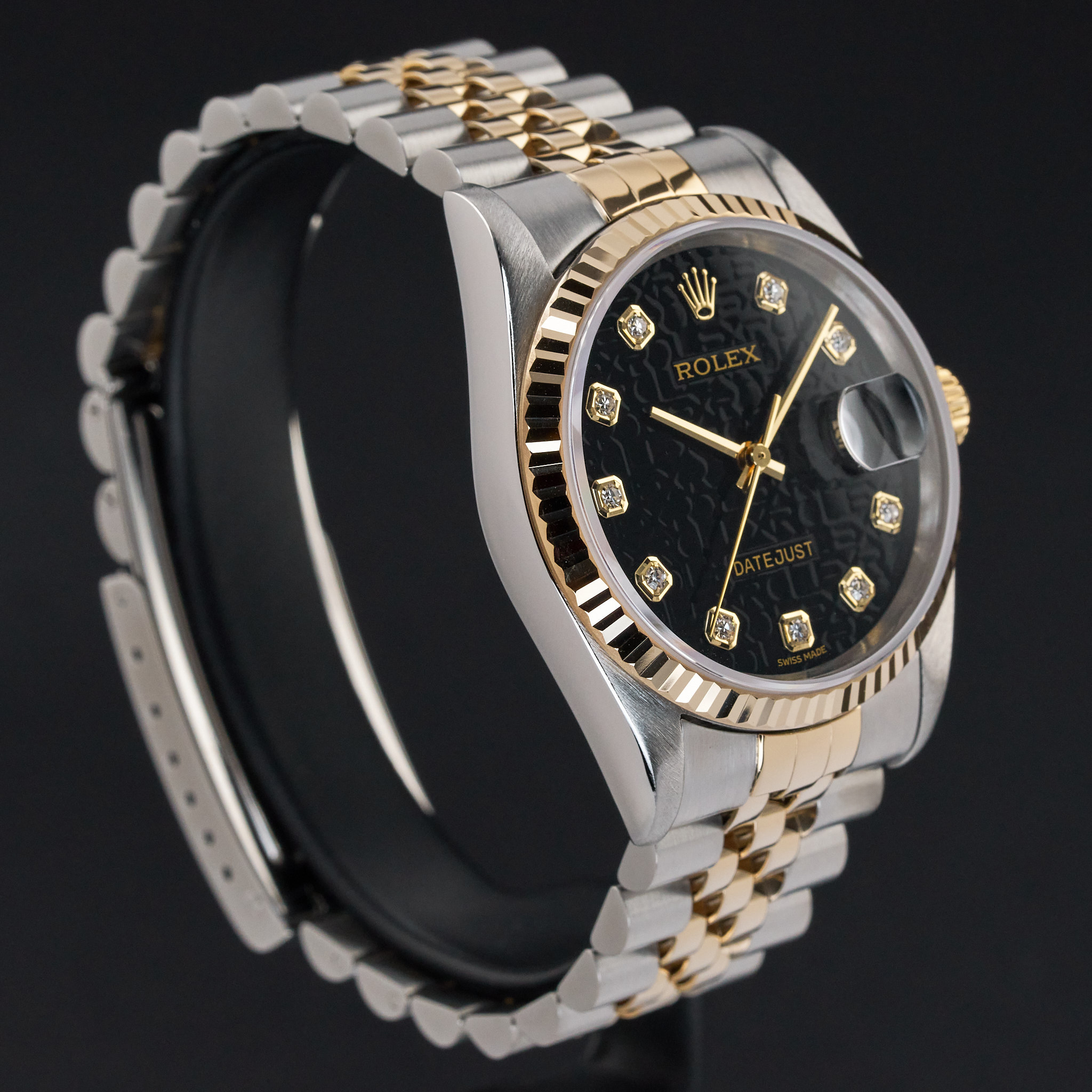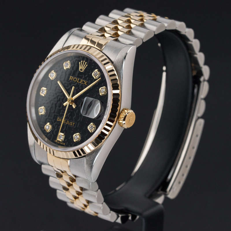 This Rolex Datejust 16233 features a Black jubilee diamond dial and is crafted from 18K yellow gold and stainless steel, with a production year of 2001.