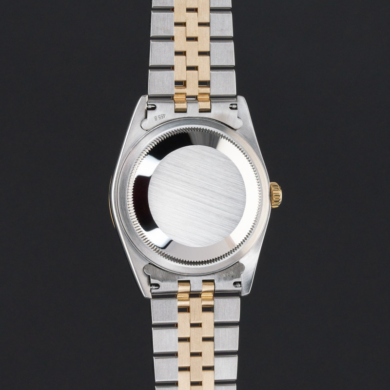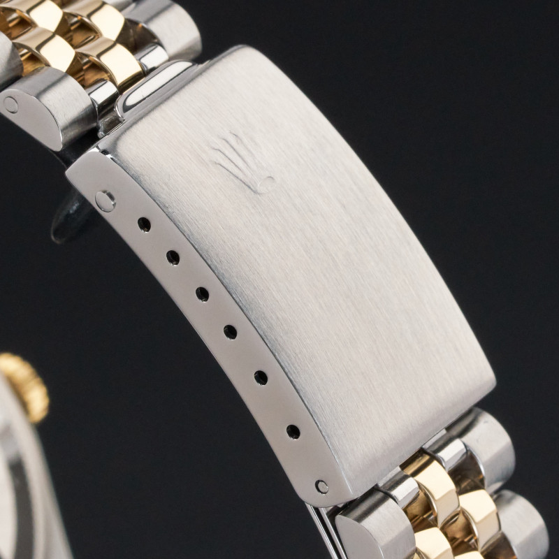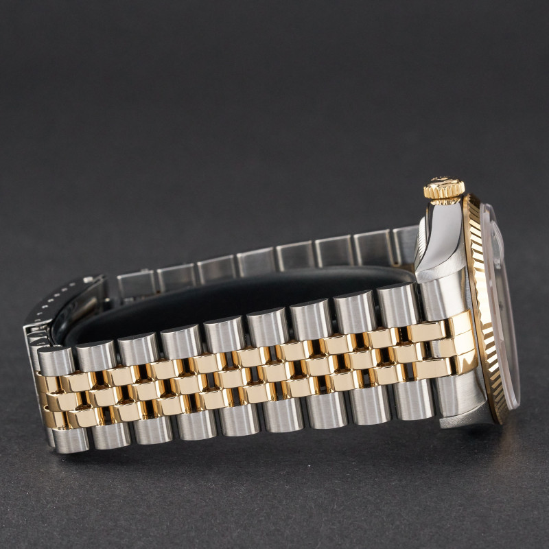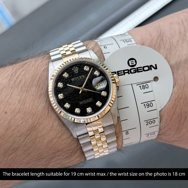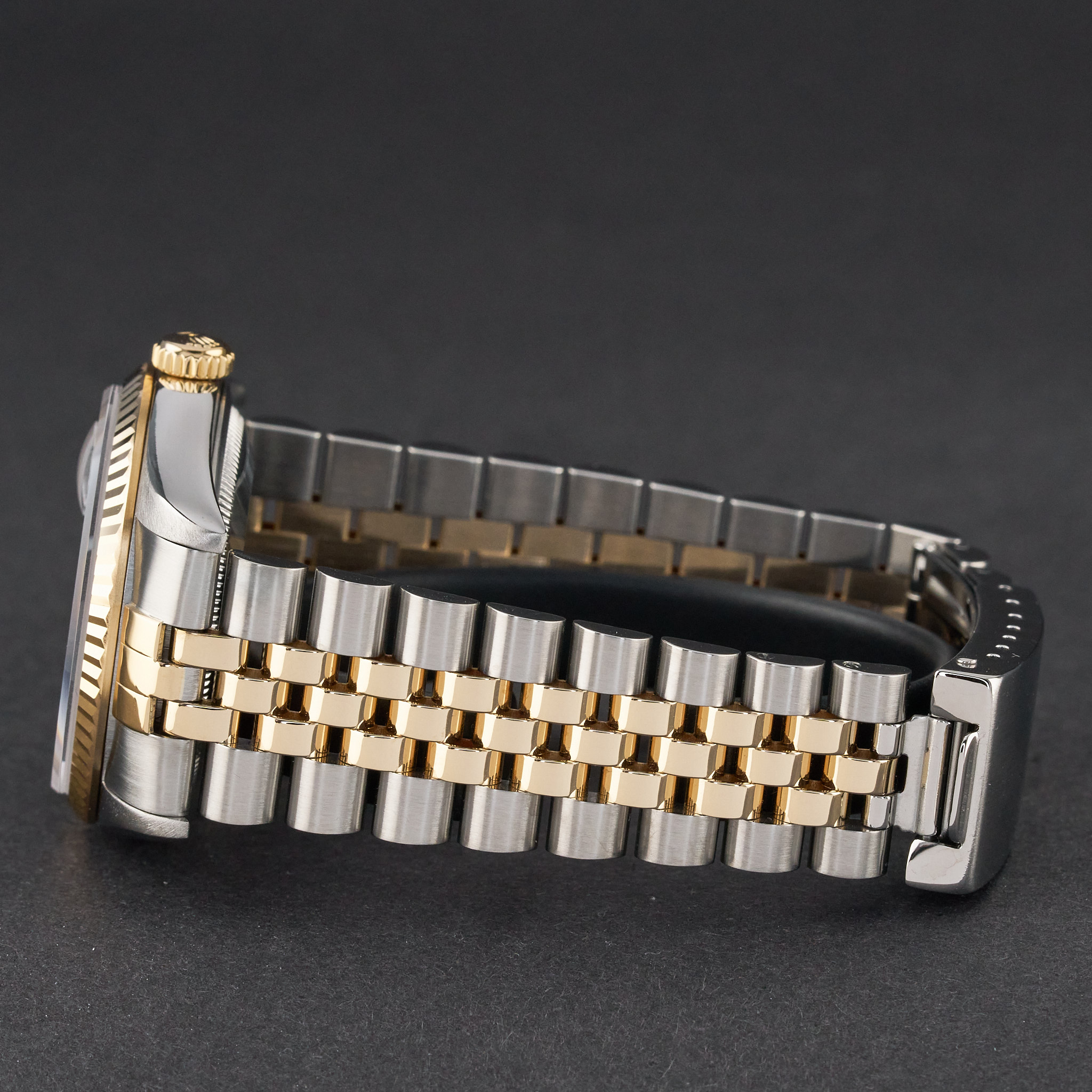 This Rolex Datejust 16233 features a Black jubilee diamond dial and is crafted from 18K yellow gold and stainless steel, with a production year of 2001.