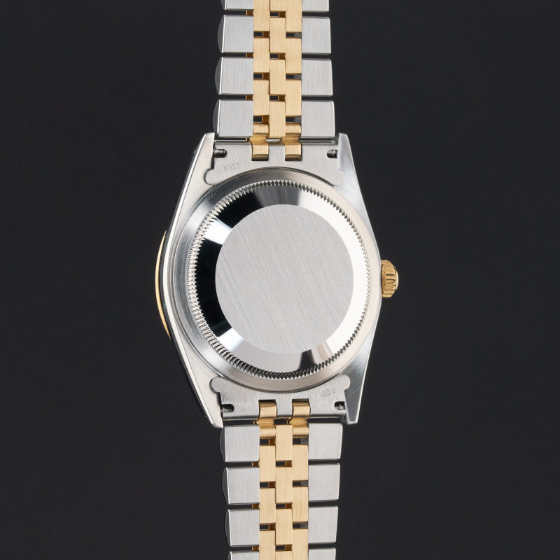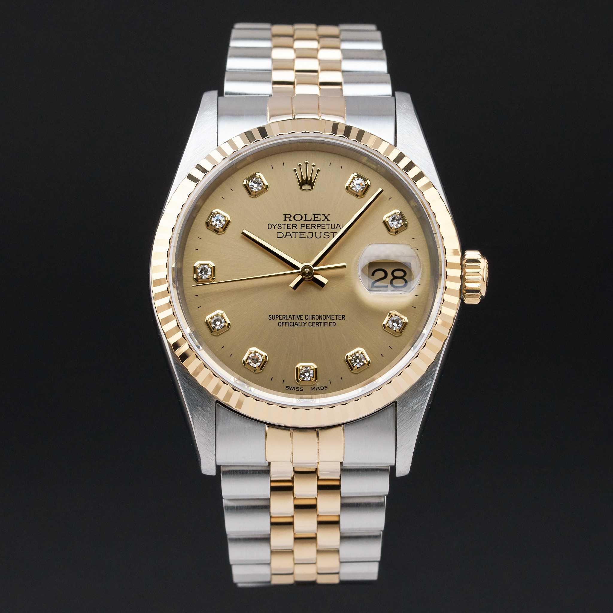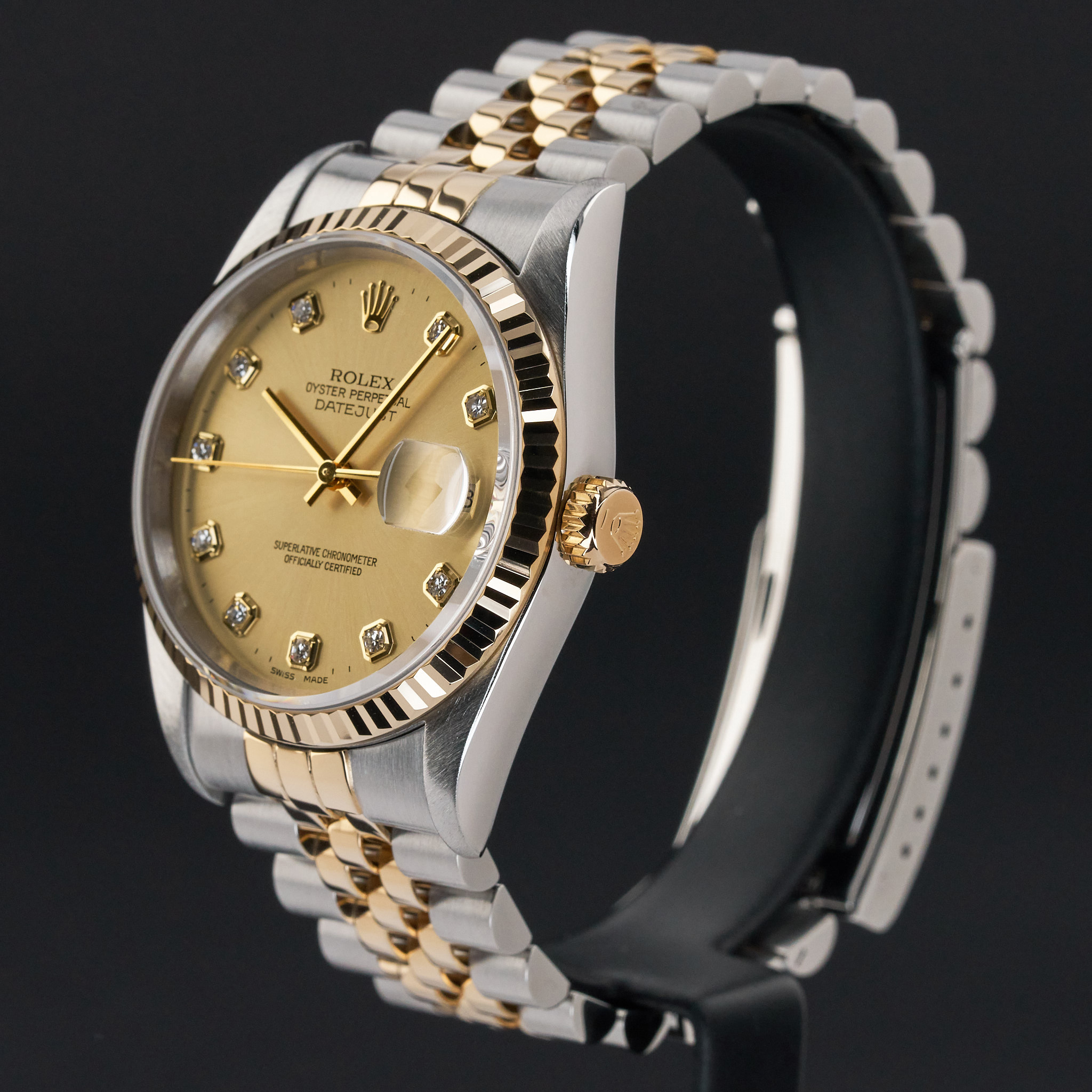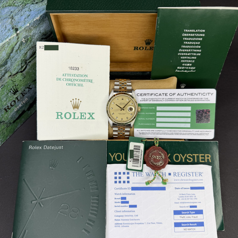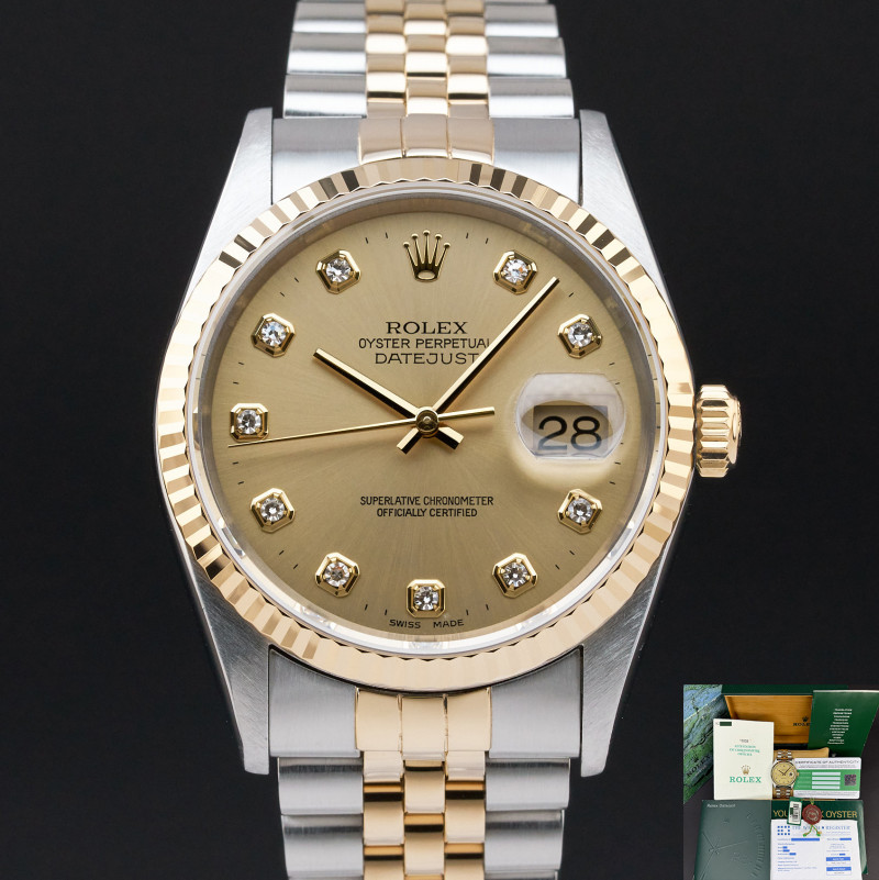 This Rolex Datejust 16233 features a Champagne big diamond dial and is crafted from 18K yellow gold and stainless steel, with a production year of 2001.