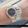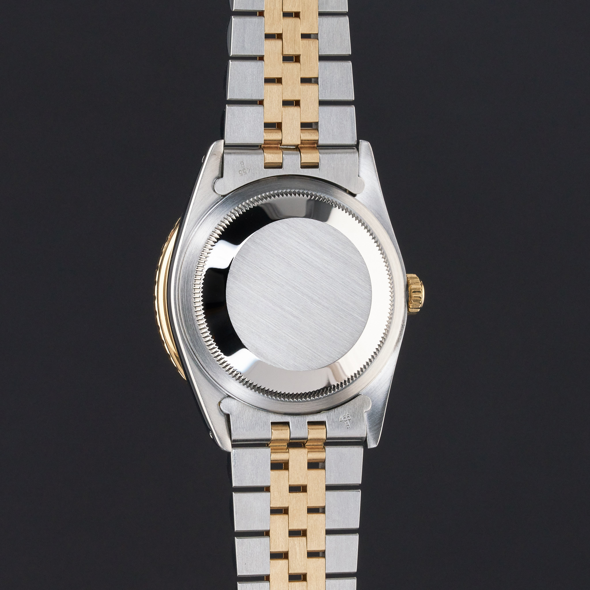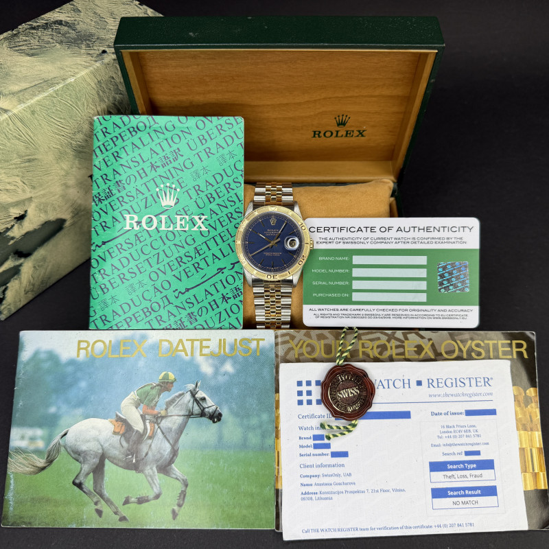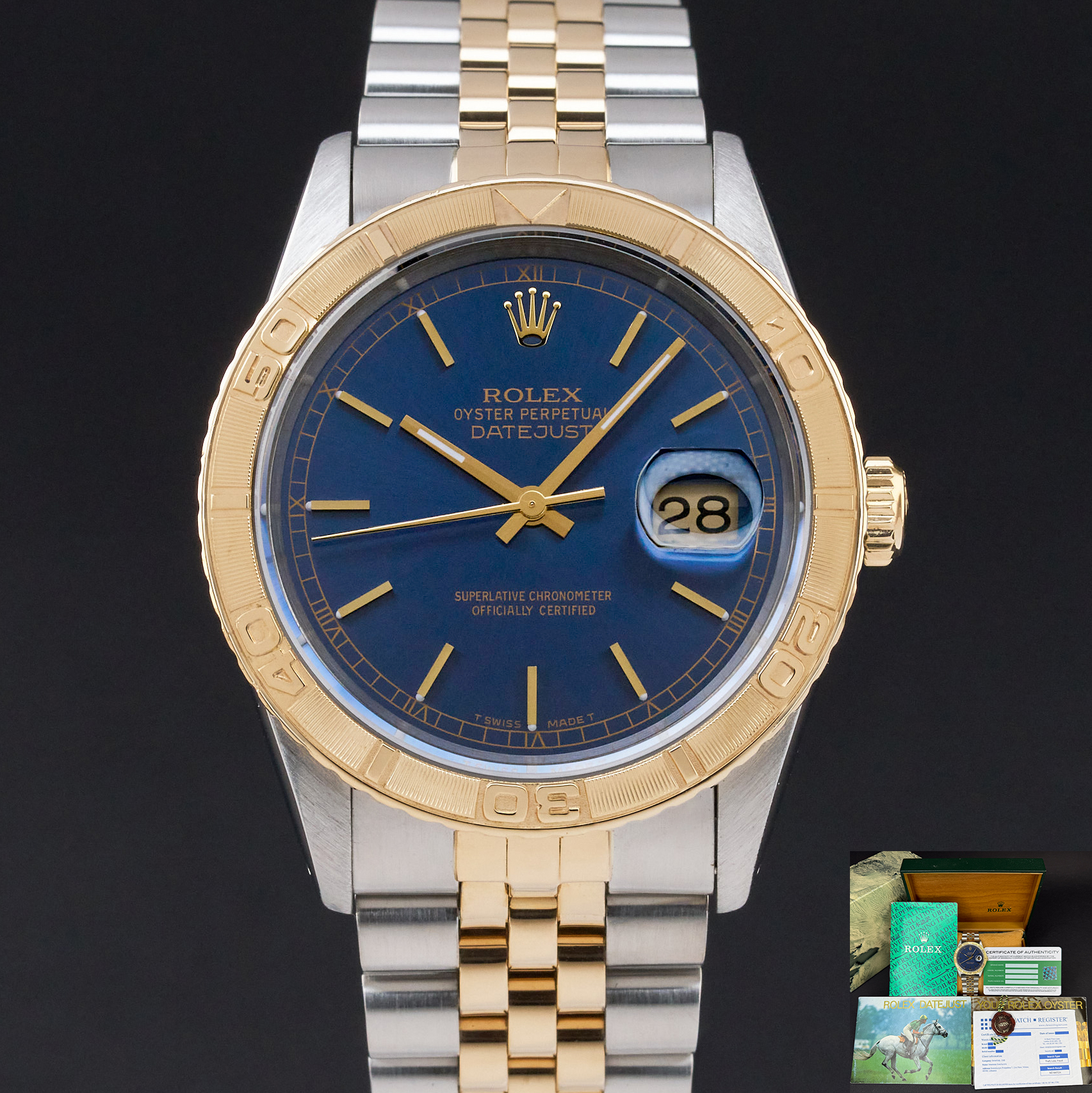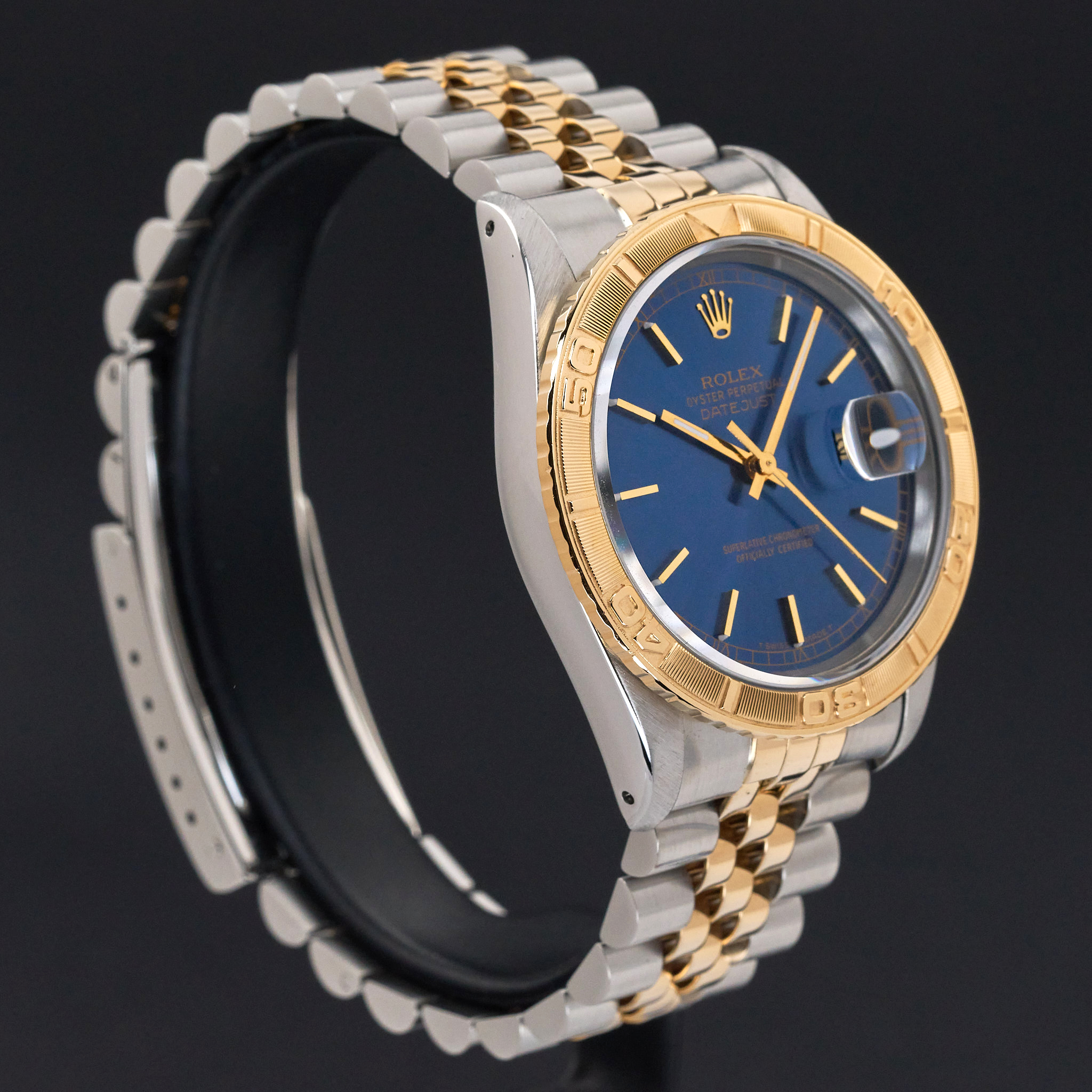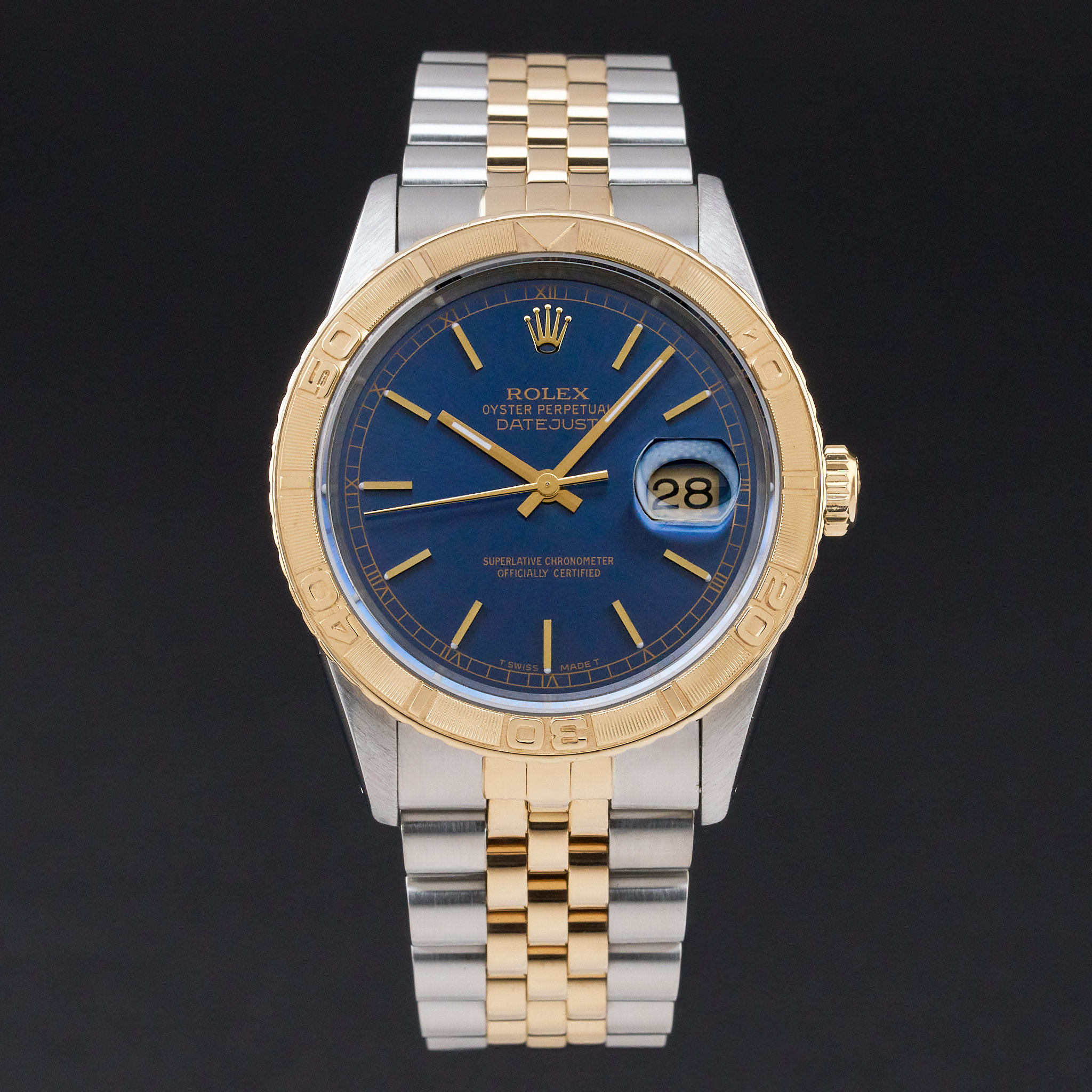 This Rolex Datejust Turn-O-Graph 16263 features a Blue dial and is crafted from 18K yellow gold and stainless steel, with a production year of 1991.