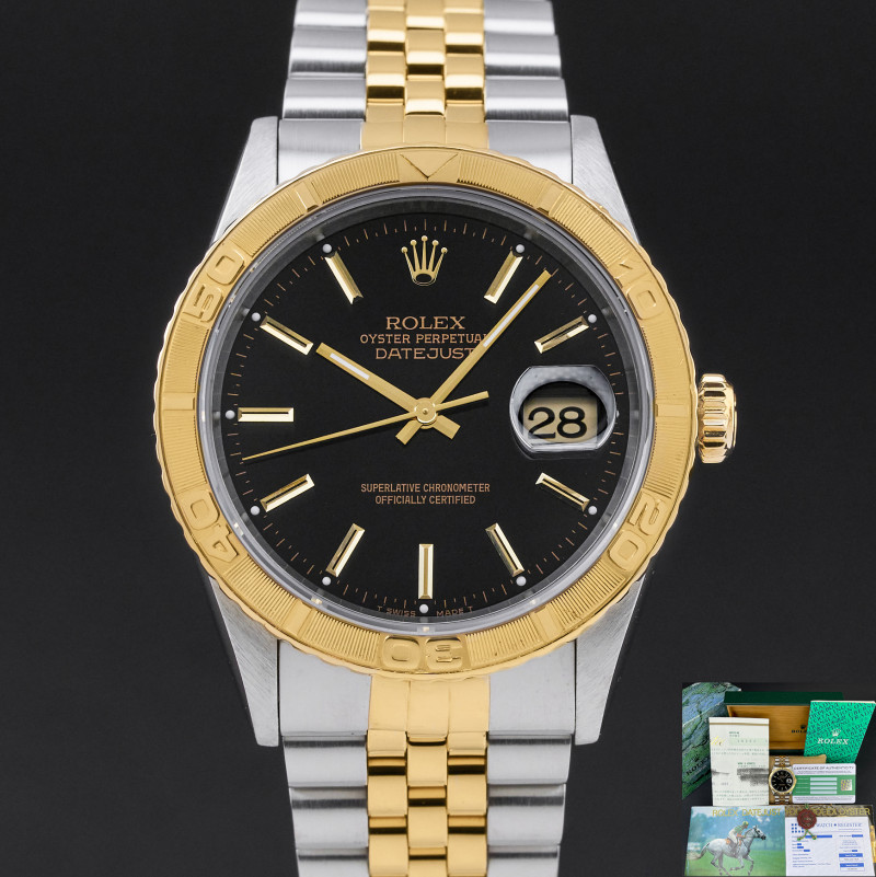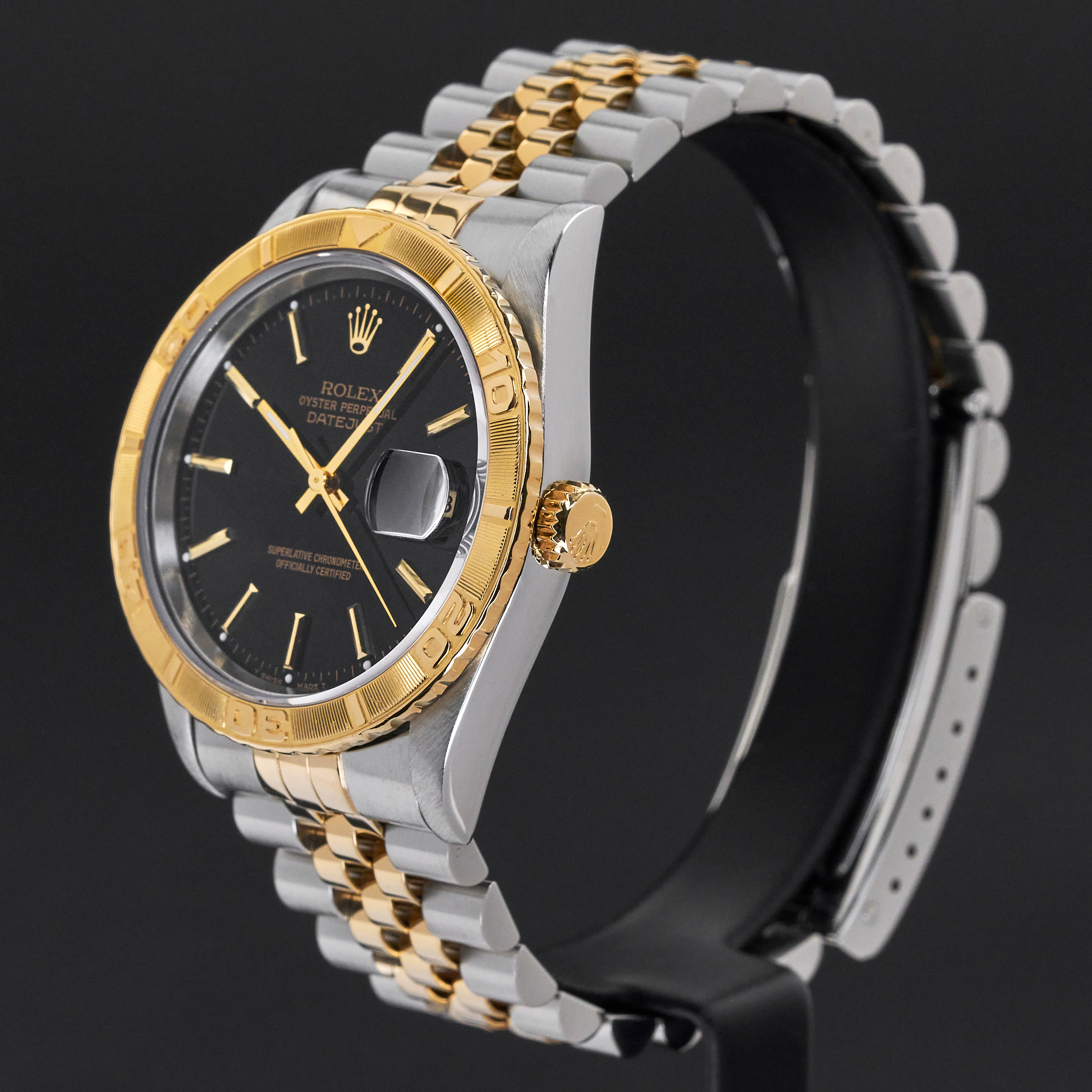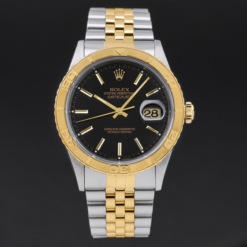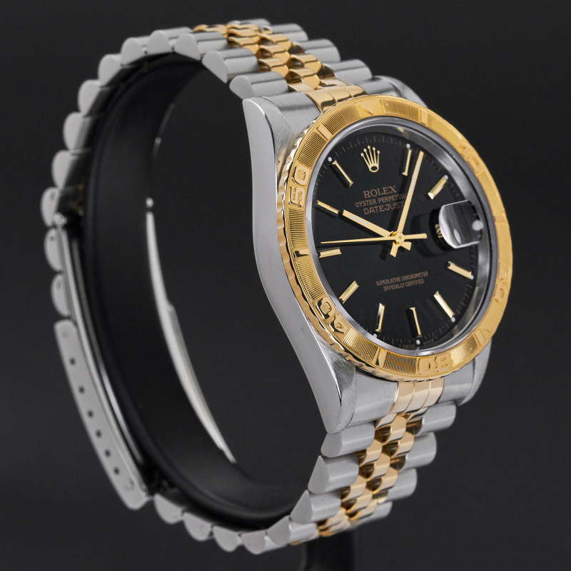 This Rolex Datejust Turn-O-Graph 16263 features a Black dial and is crafted from 18K yellow gold and stainless steel, with a production year of 1996.