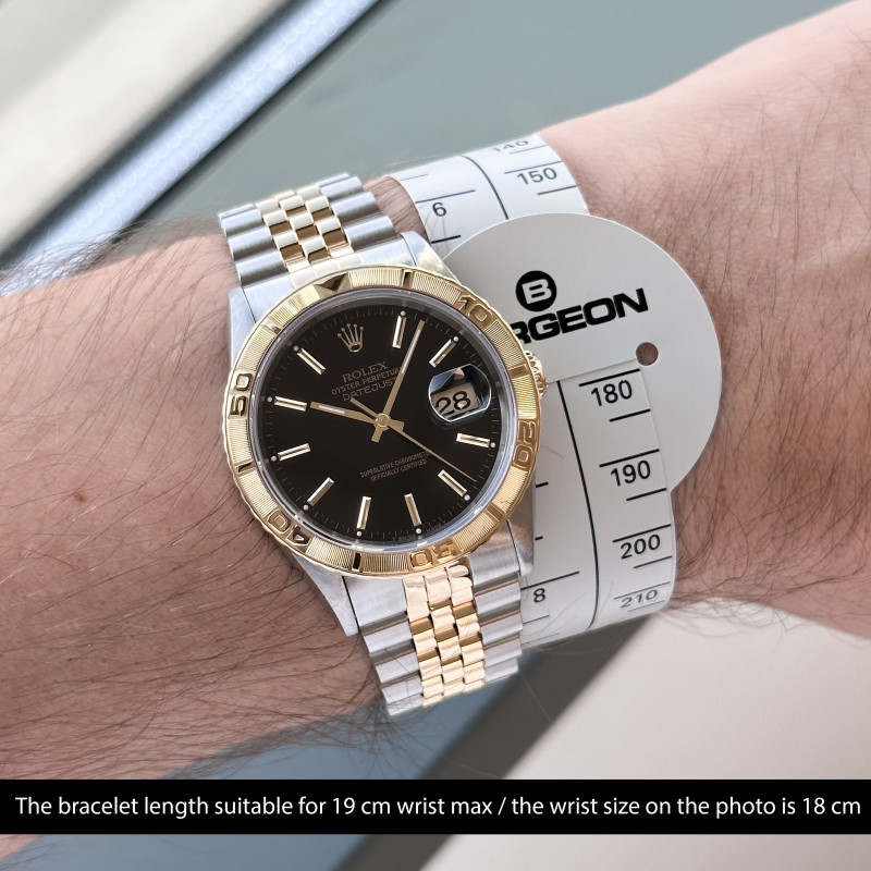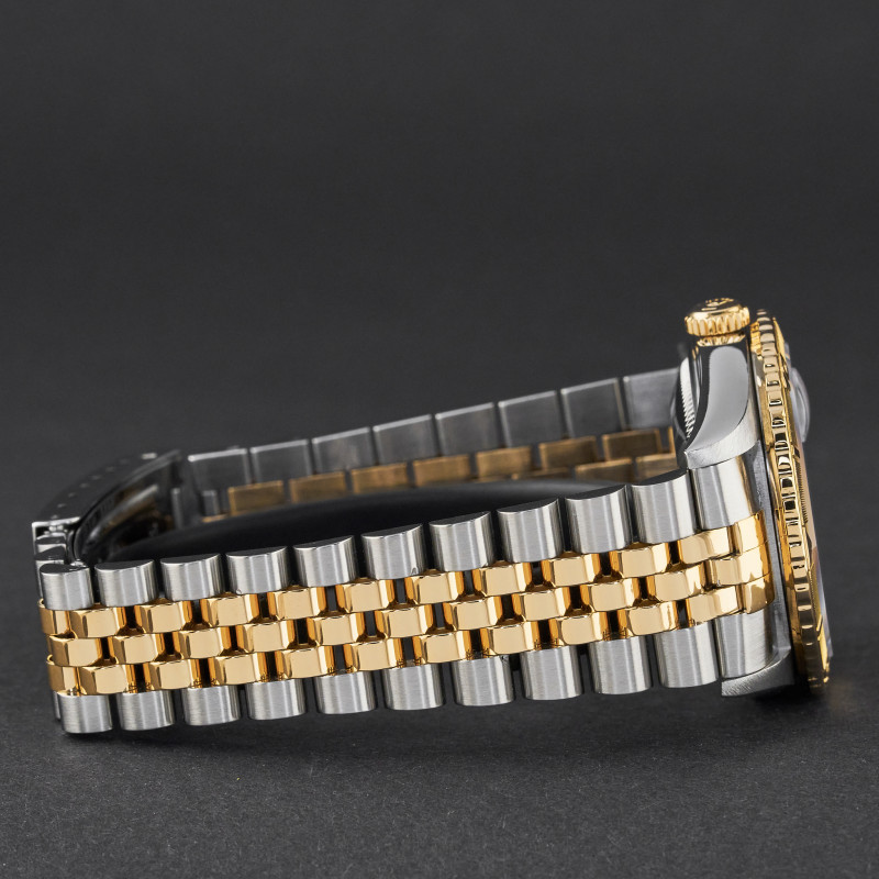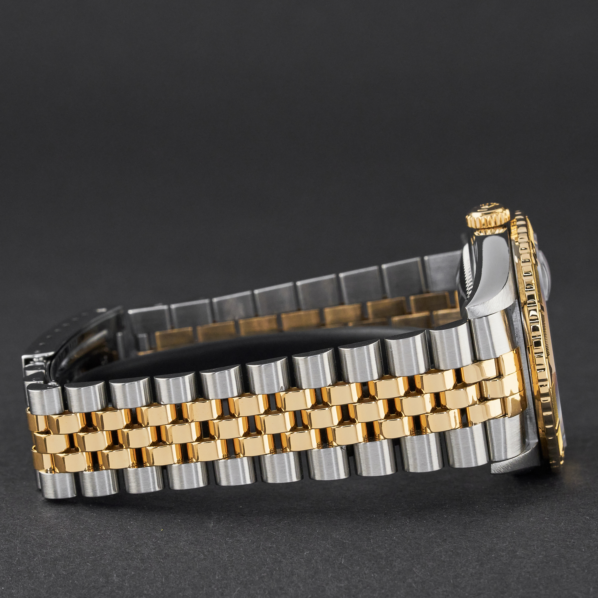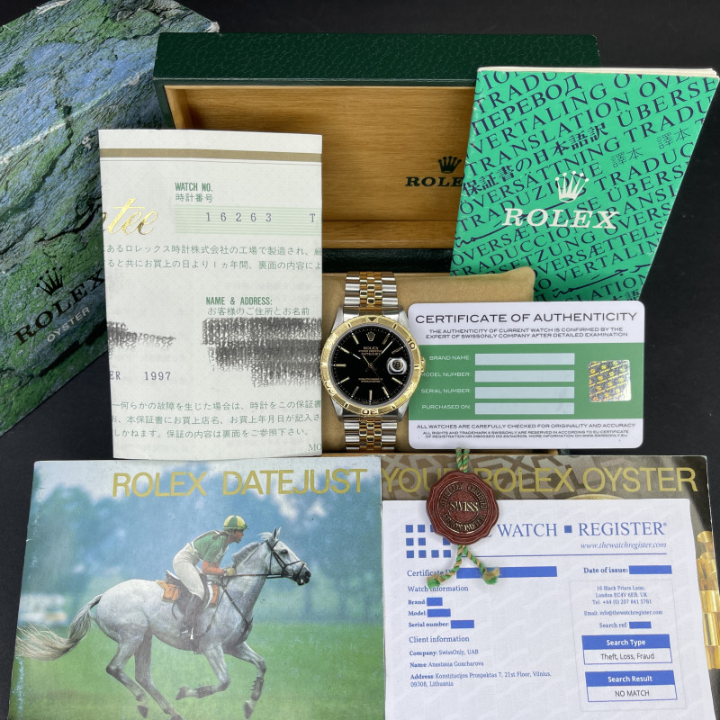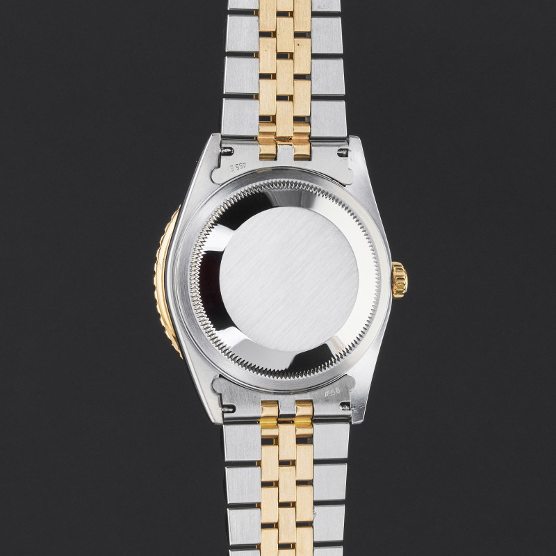 This Rolex Datejust Turn-O-Graph 16263 features a Black dial and is crafted from 18K yellow gold and stainless steel, with a production year of 1996.