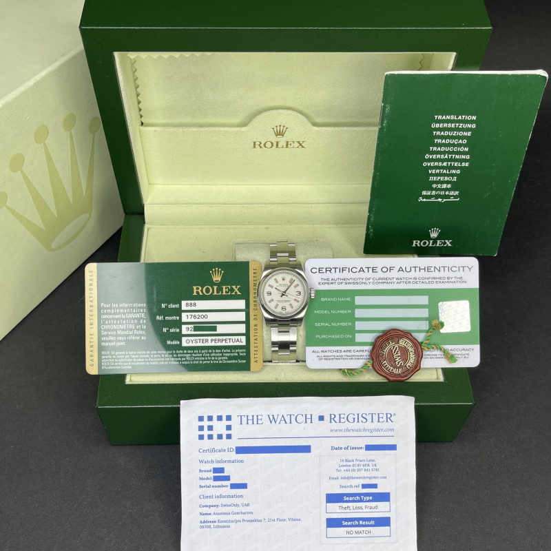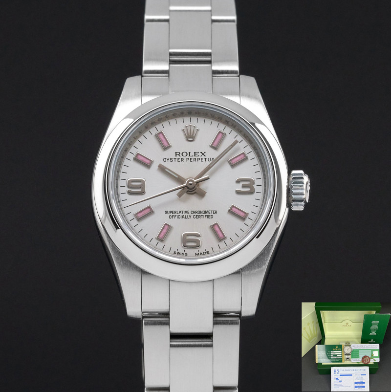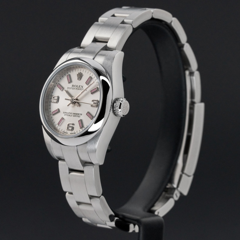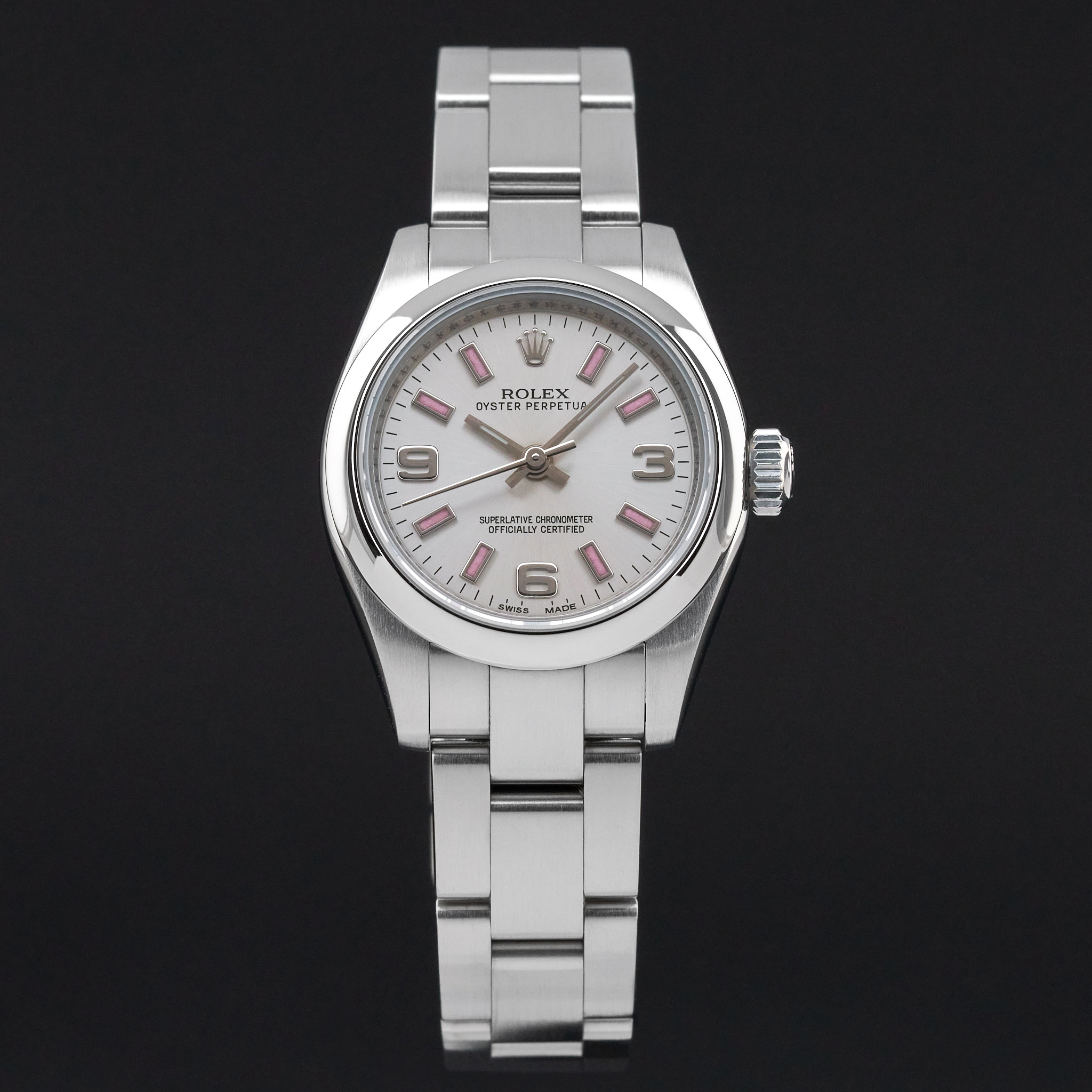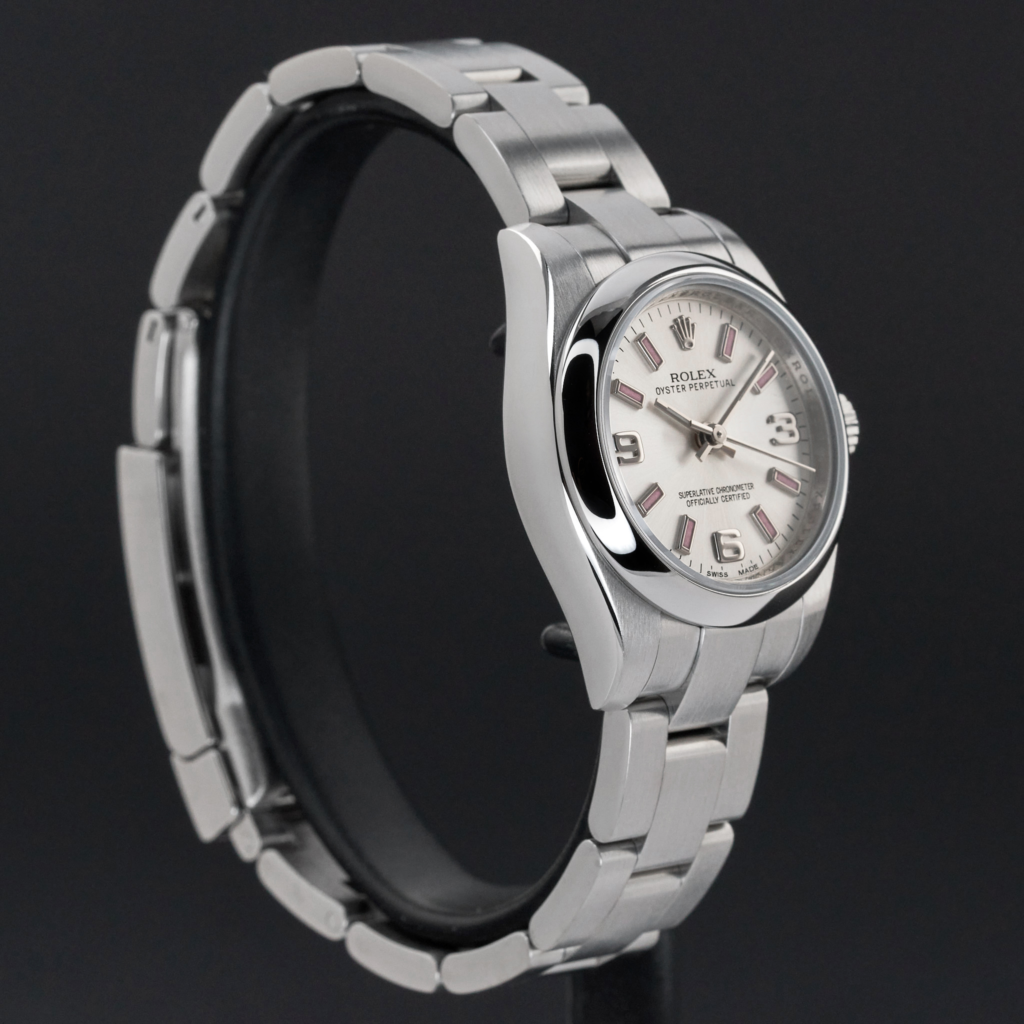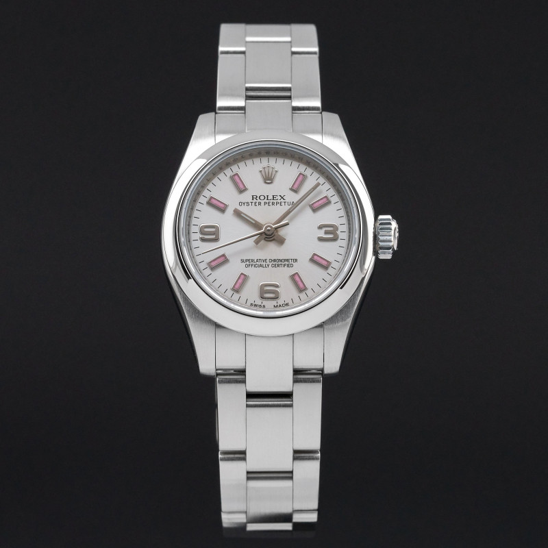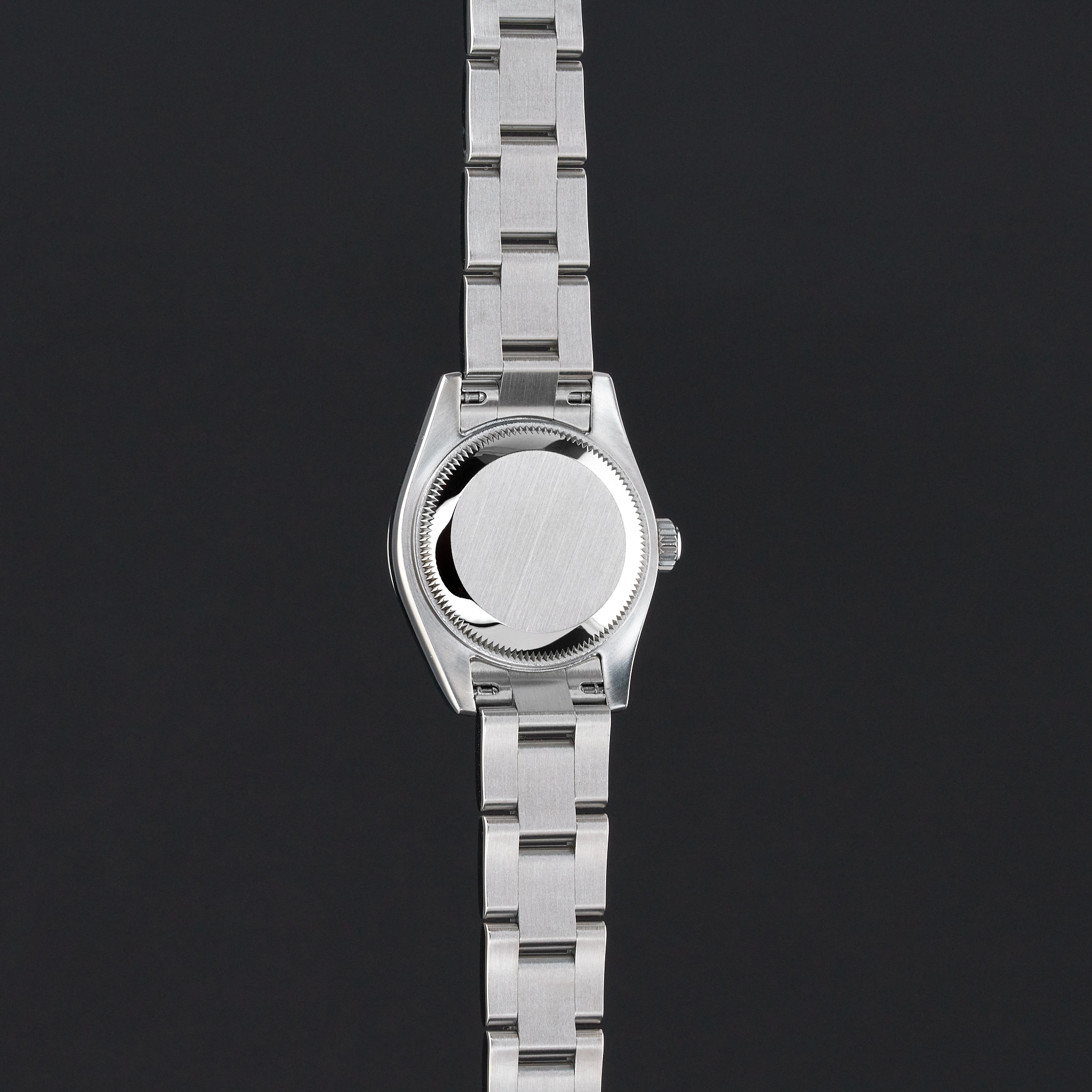 This Rolex Oyster Perpetual Lady 176200 features a Silver Arabic dial and is crafted from stainless steel, with a production year of 2011.