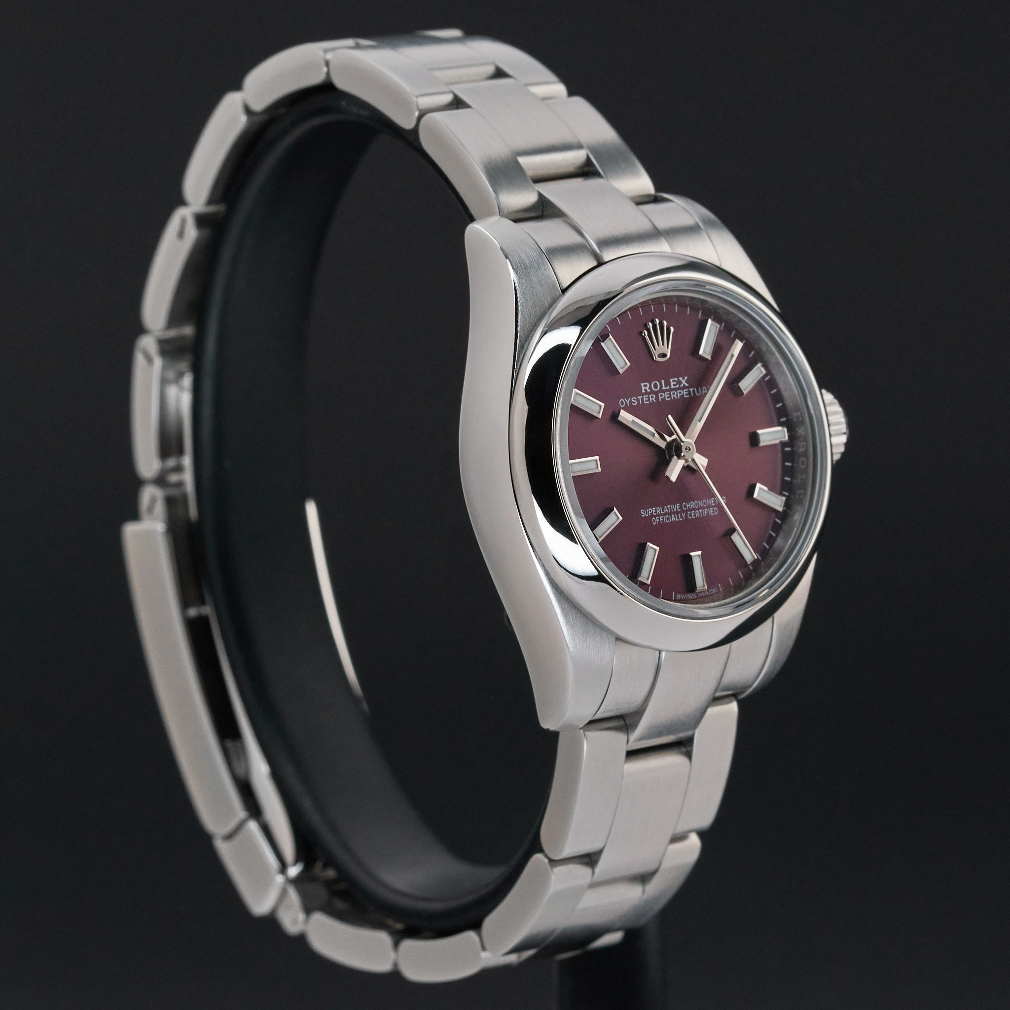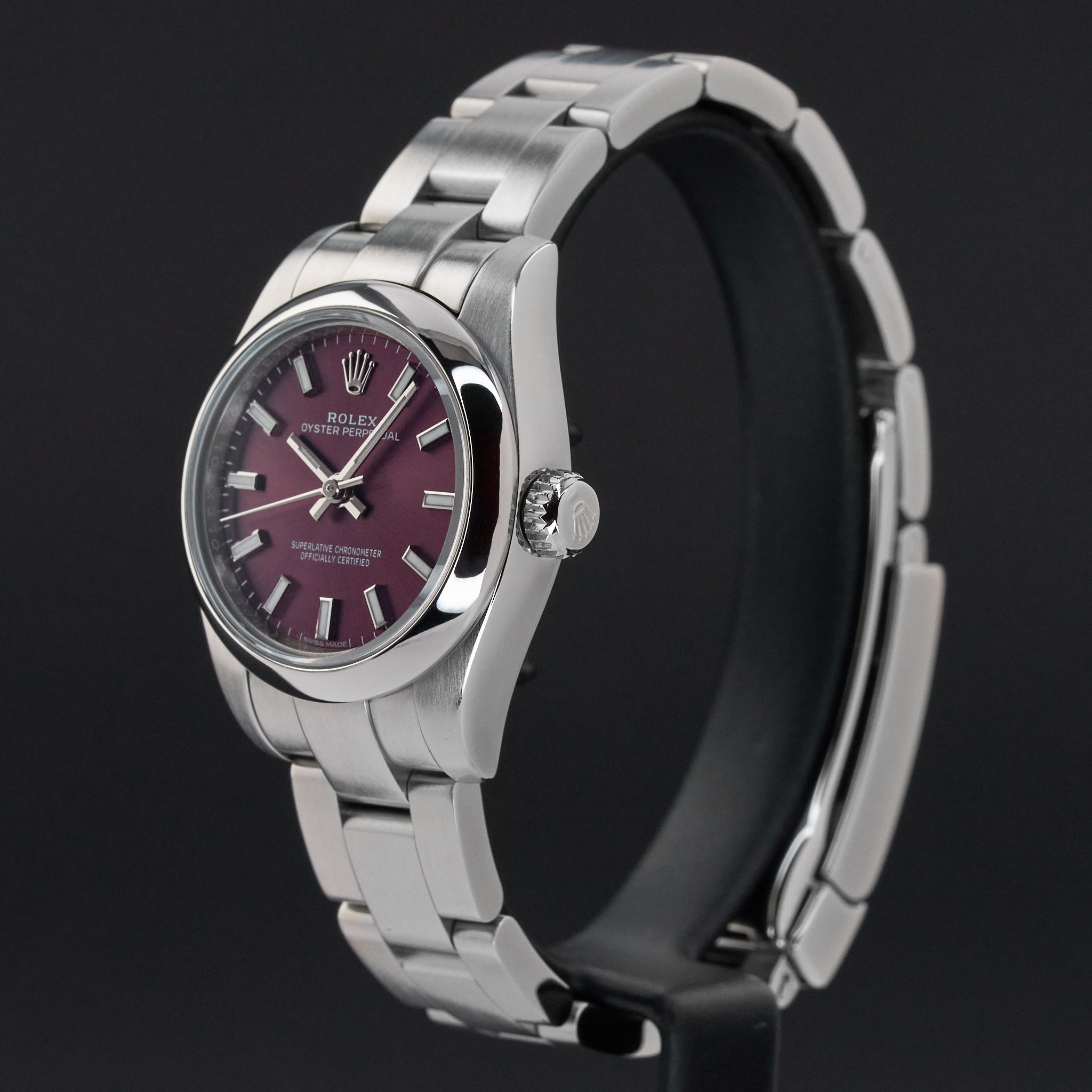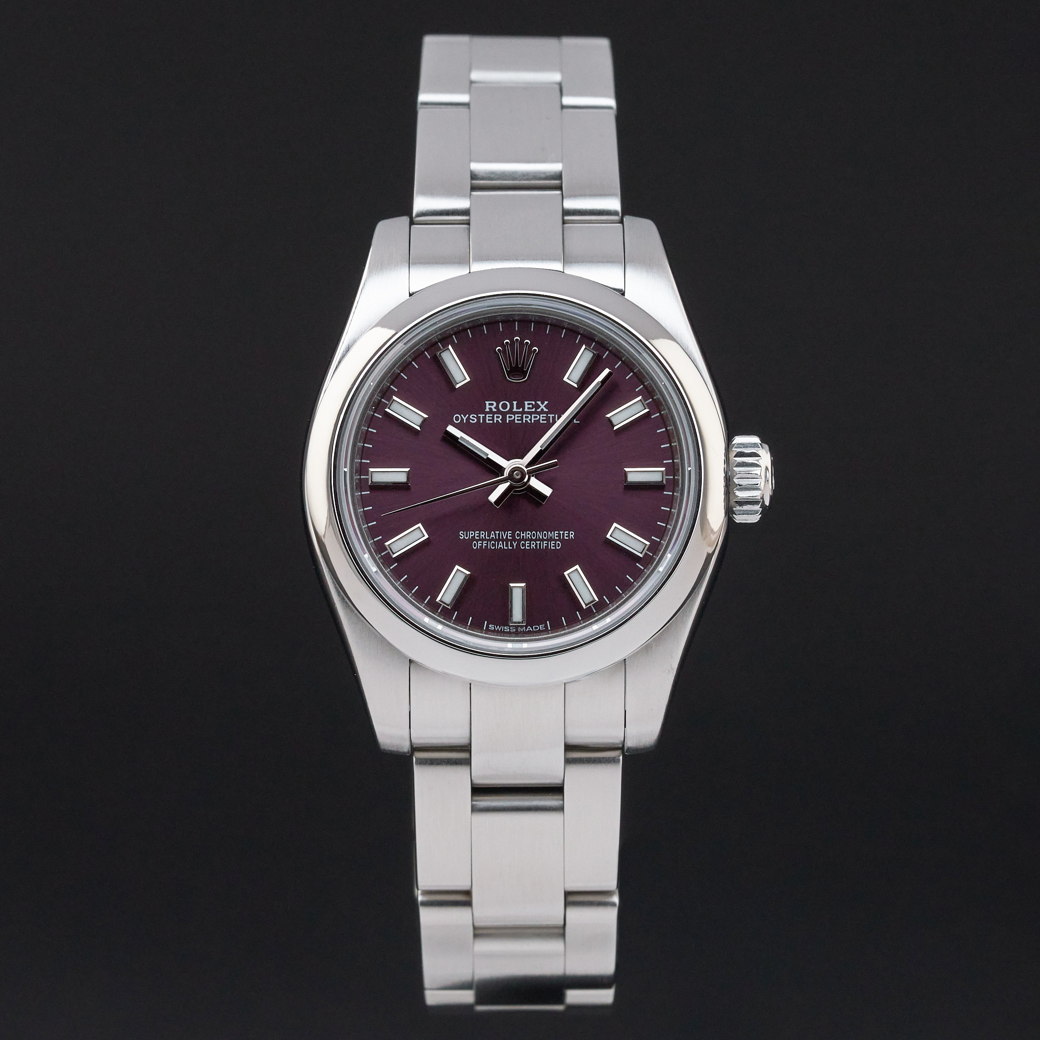 This Rolex Oyster Perpetual Lady 176200 features a Red grape dial and is crafted from stainless steel, with a production year of 2017.