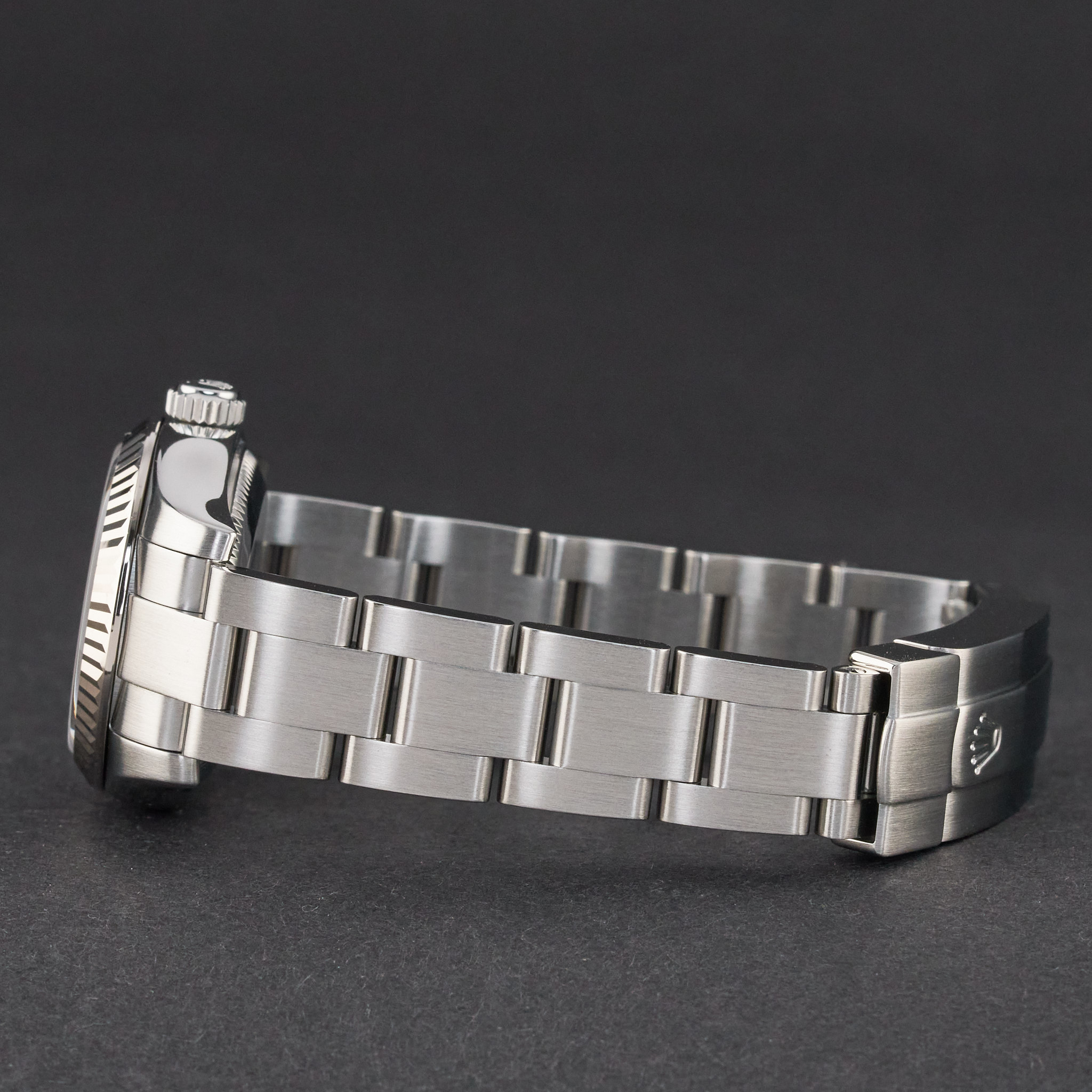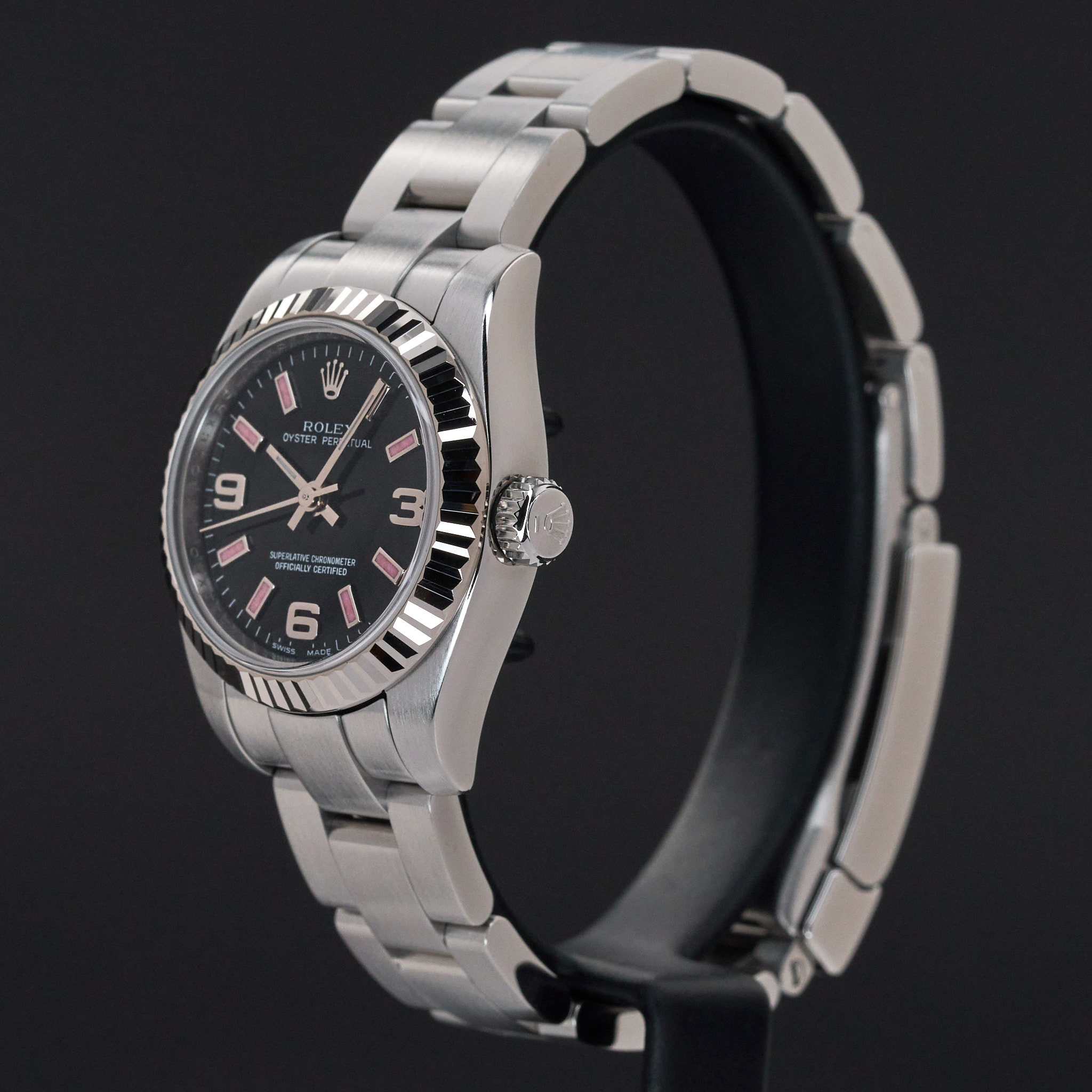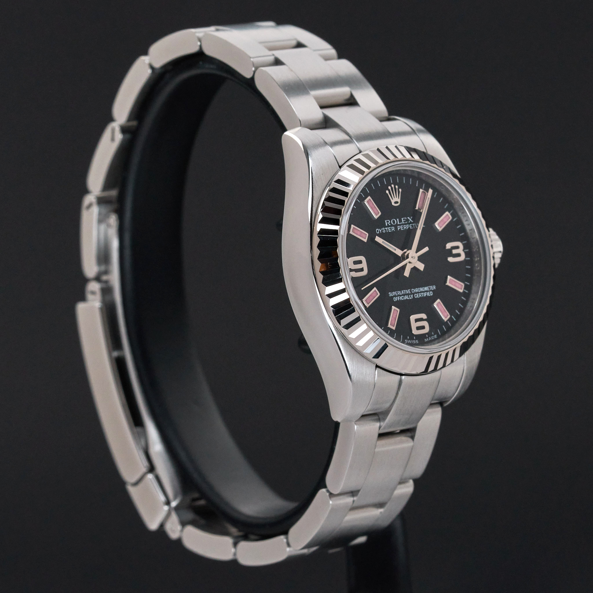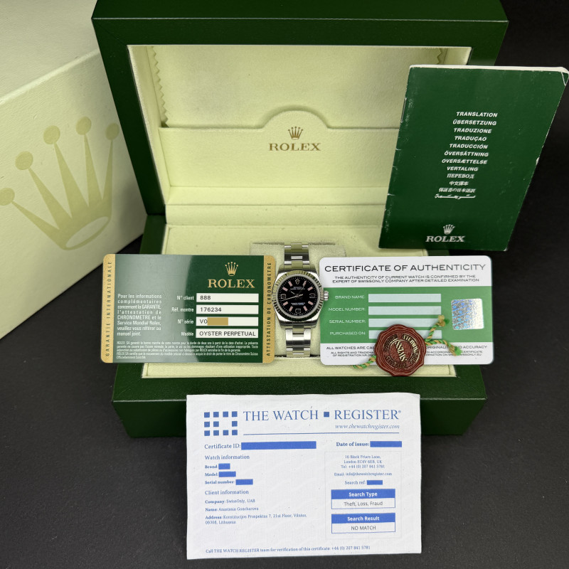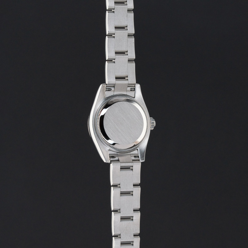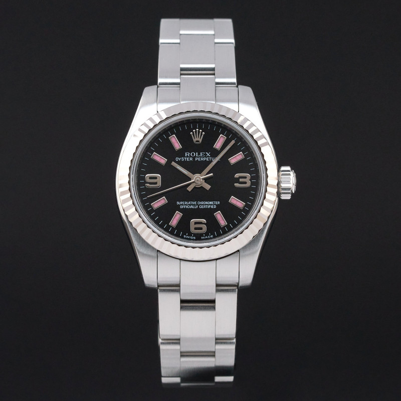 This Rolex Oyster Perpetual Lady 176234 features a Black Arabic dial and is crafted from stainless steel, with a production year of 2009.