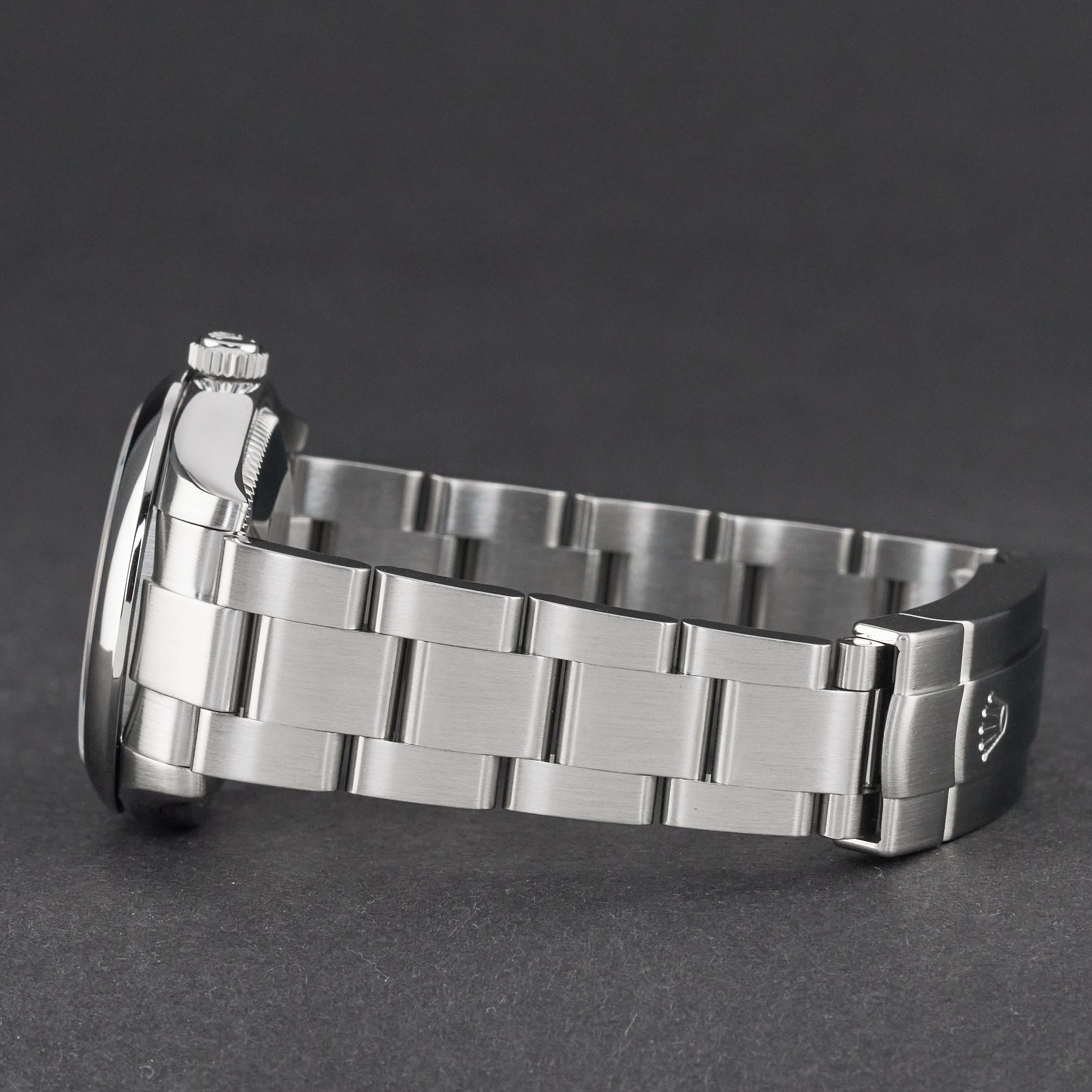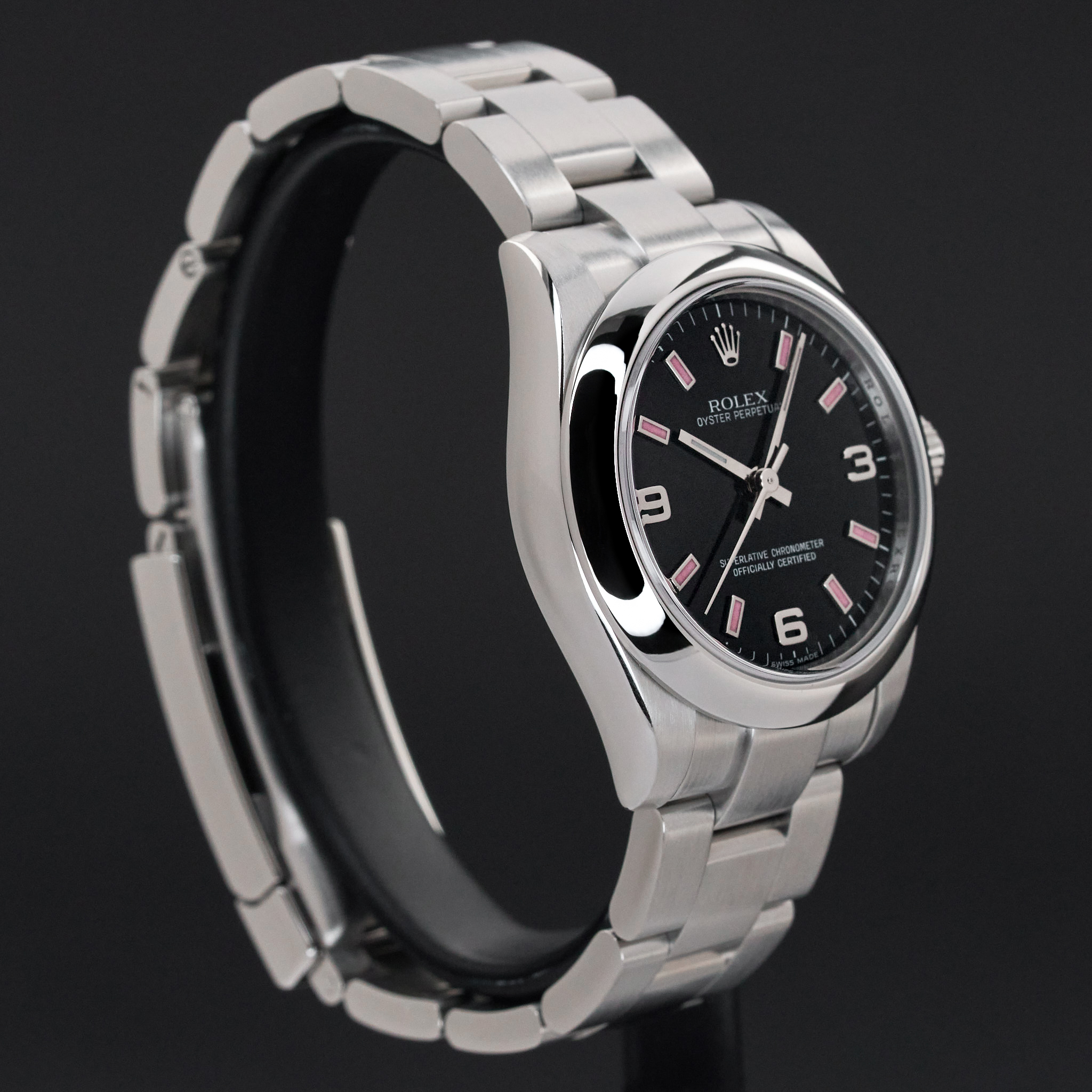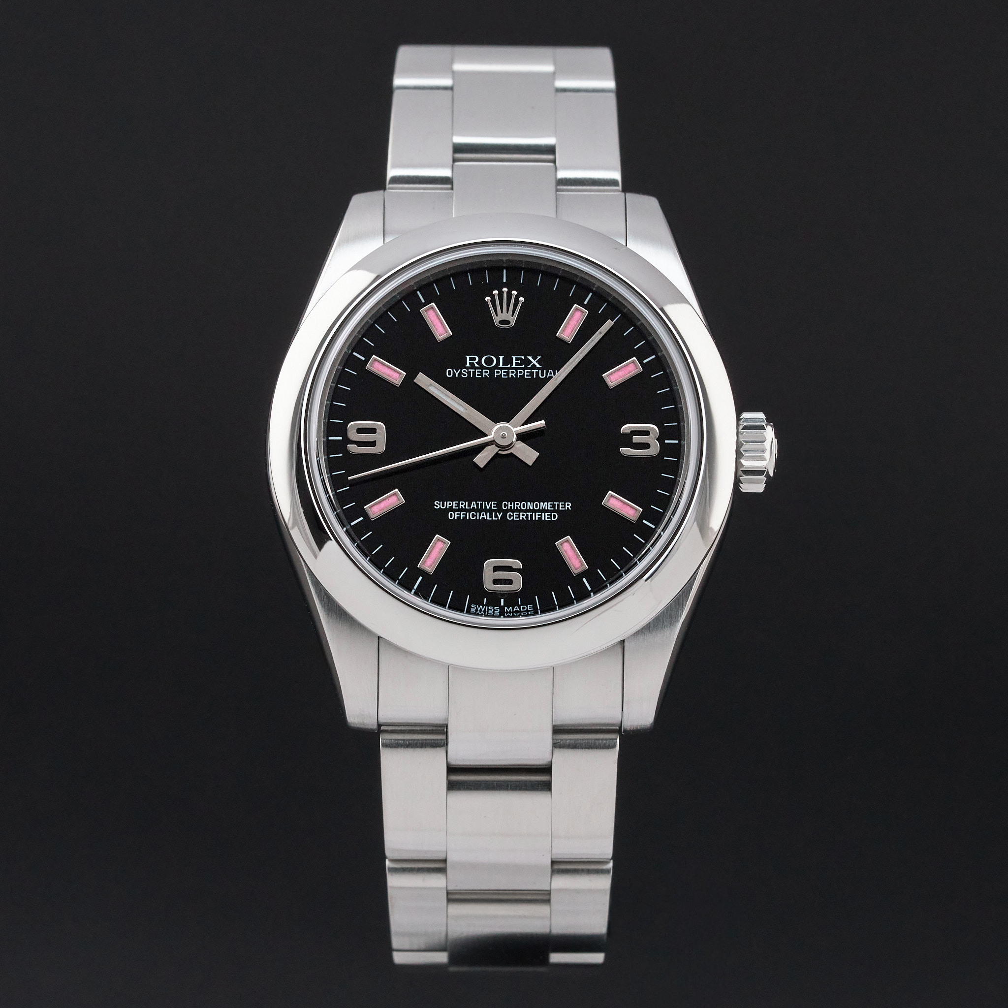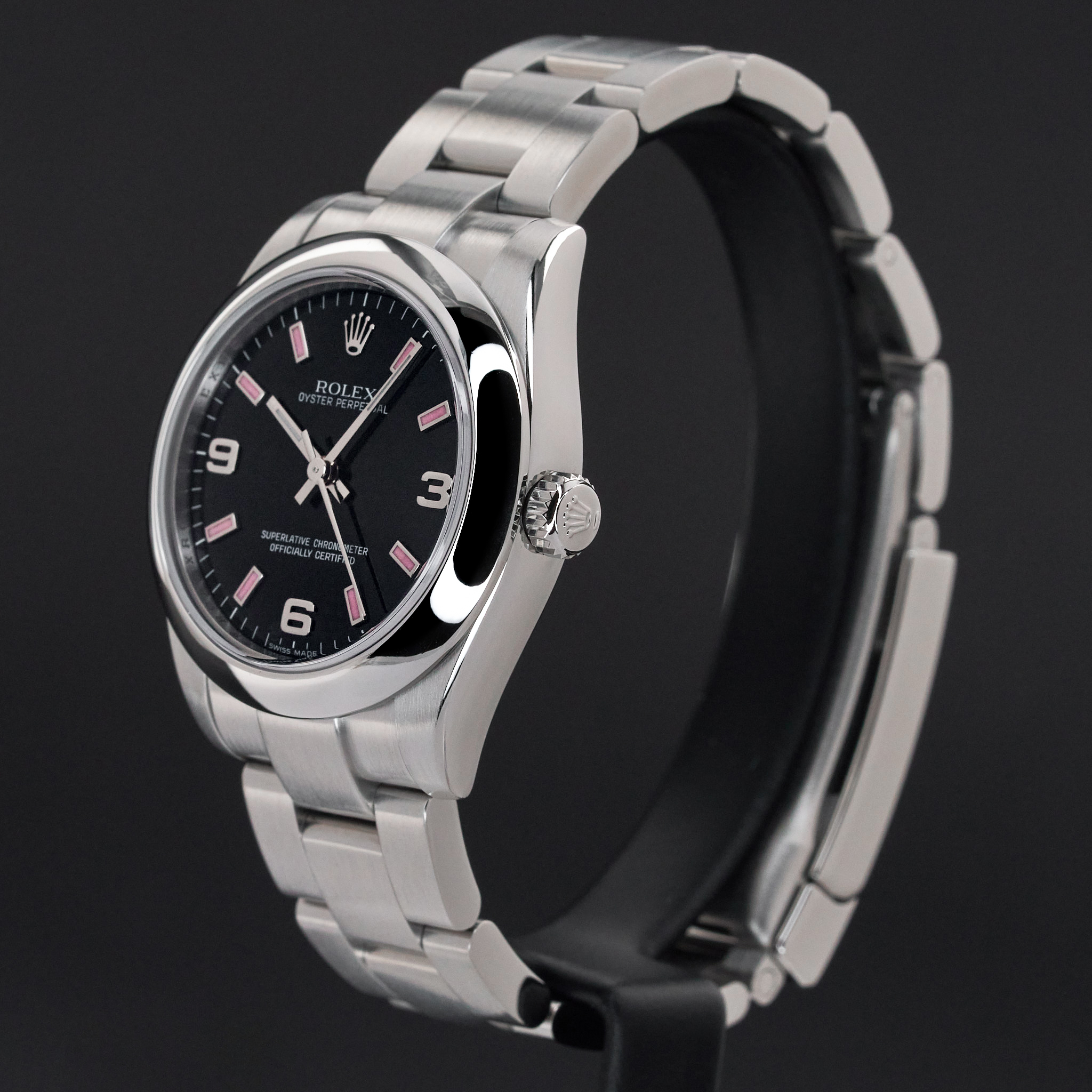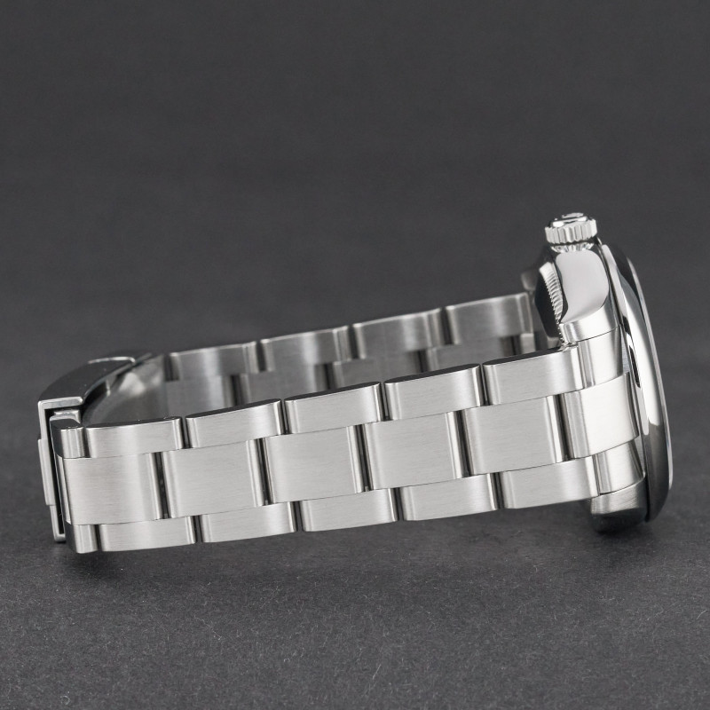 This Rolex Oyster Perpetual 177200 features a Black Arabic dial and is crafted from stainless steel, with a production year of 2010.