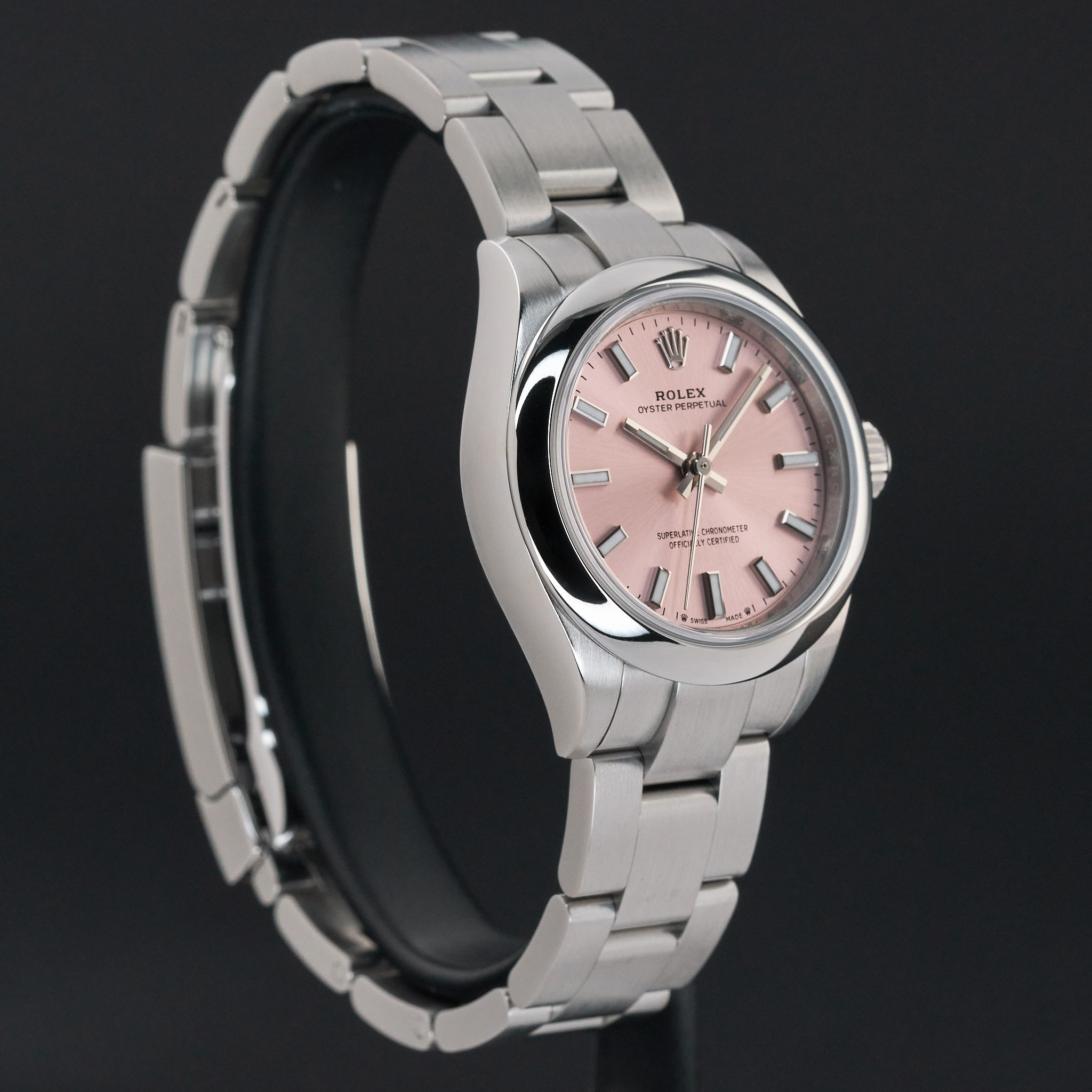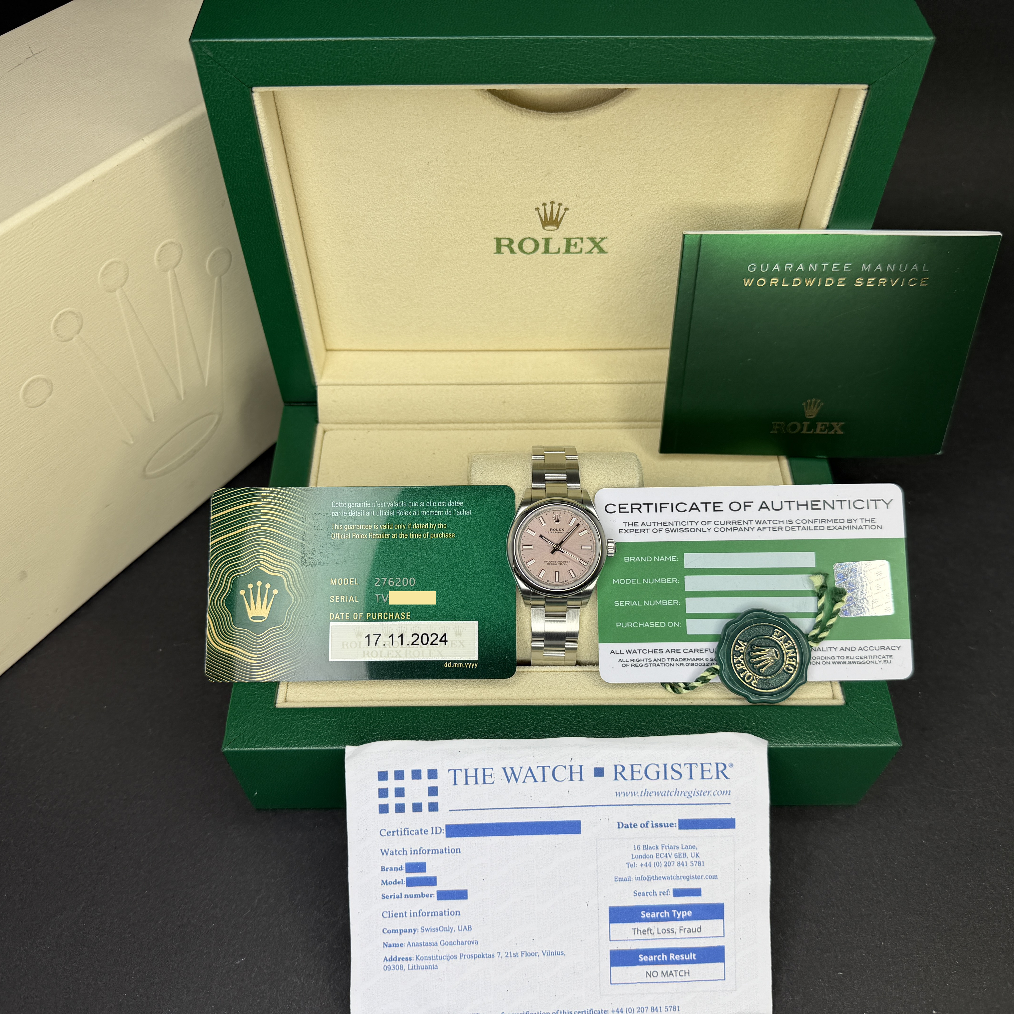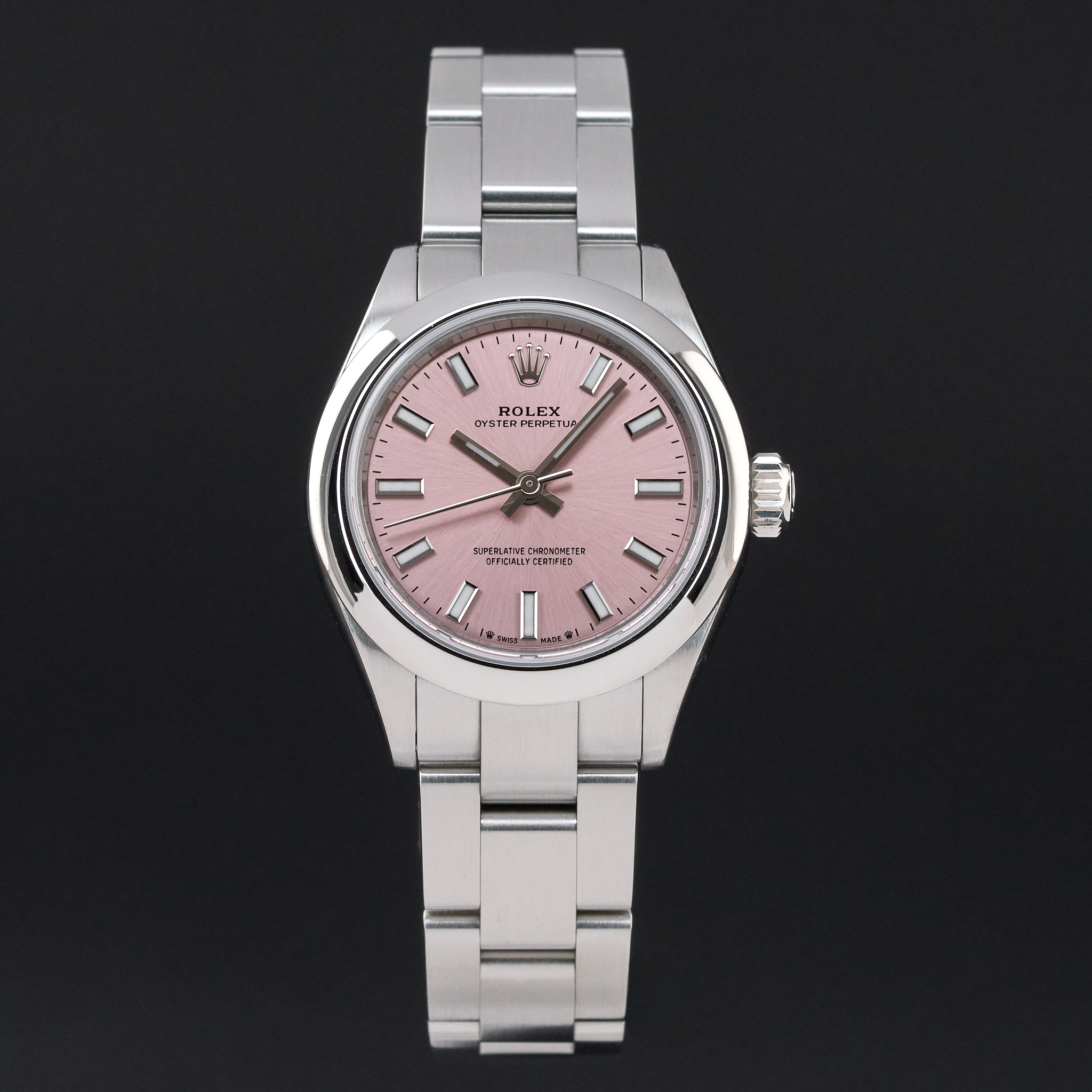 This Rolex Oyster Perpetual 276200 features a Pink dial and is crafted from stainless steel, with a production year of 2024.