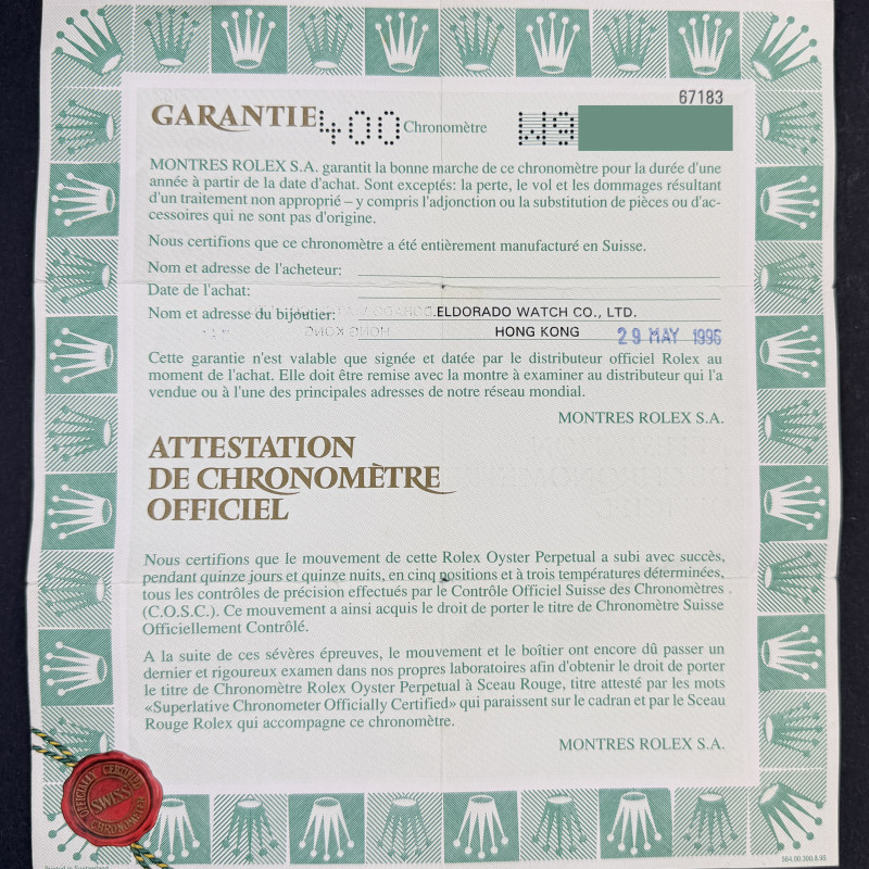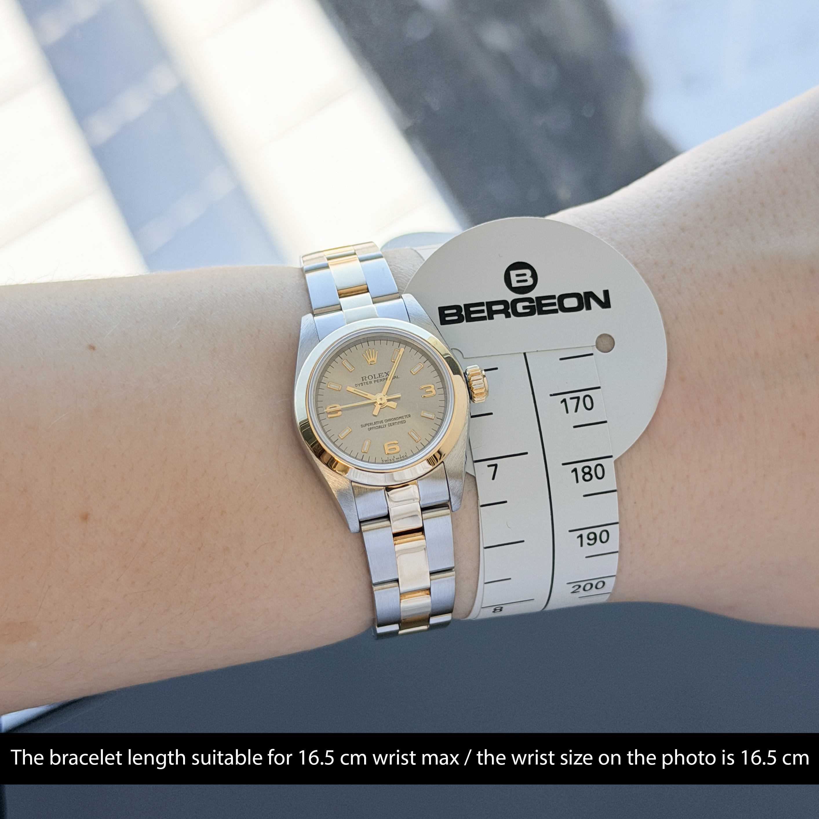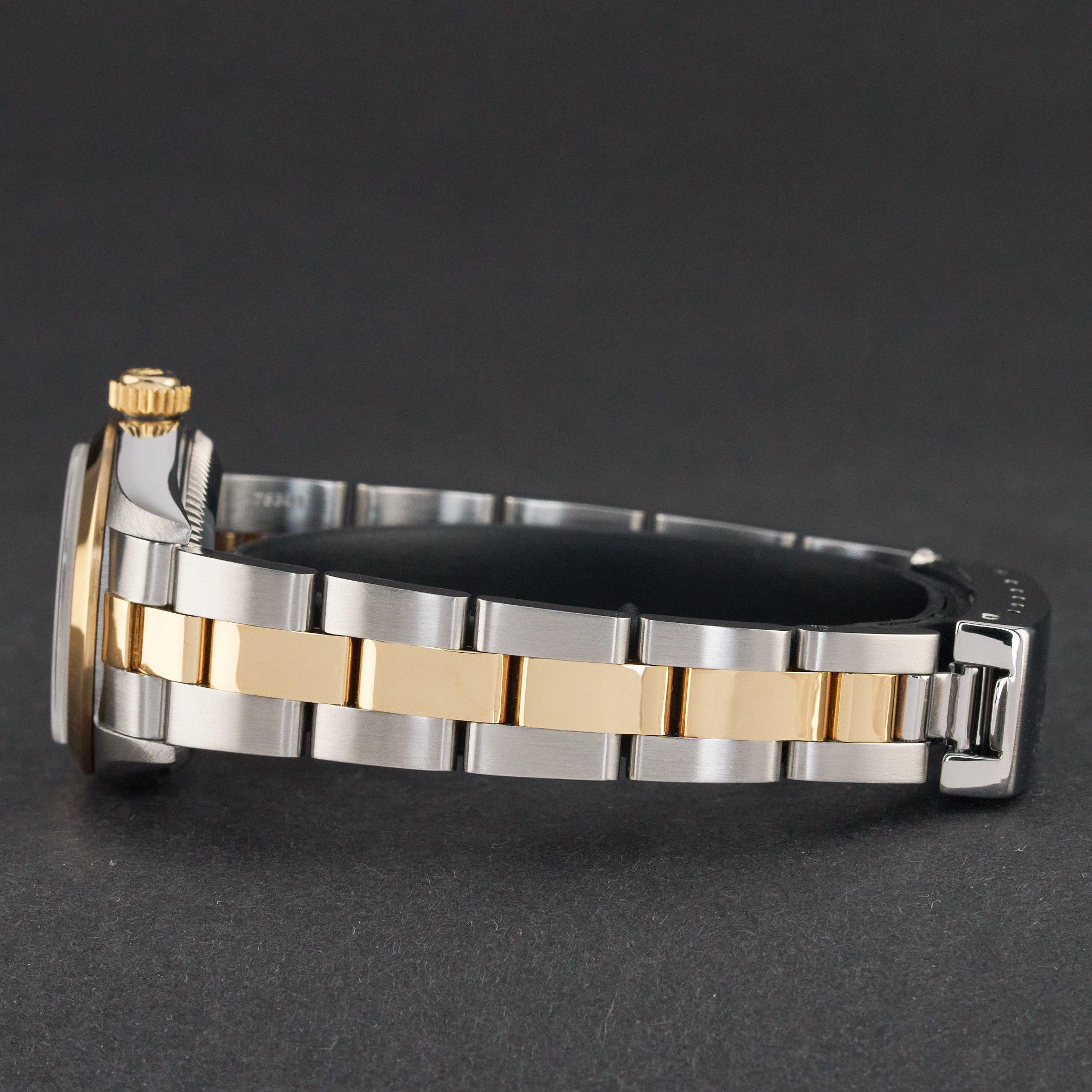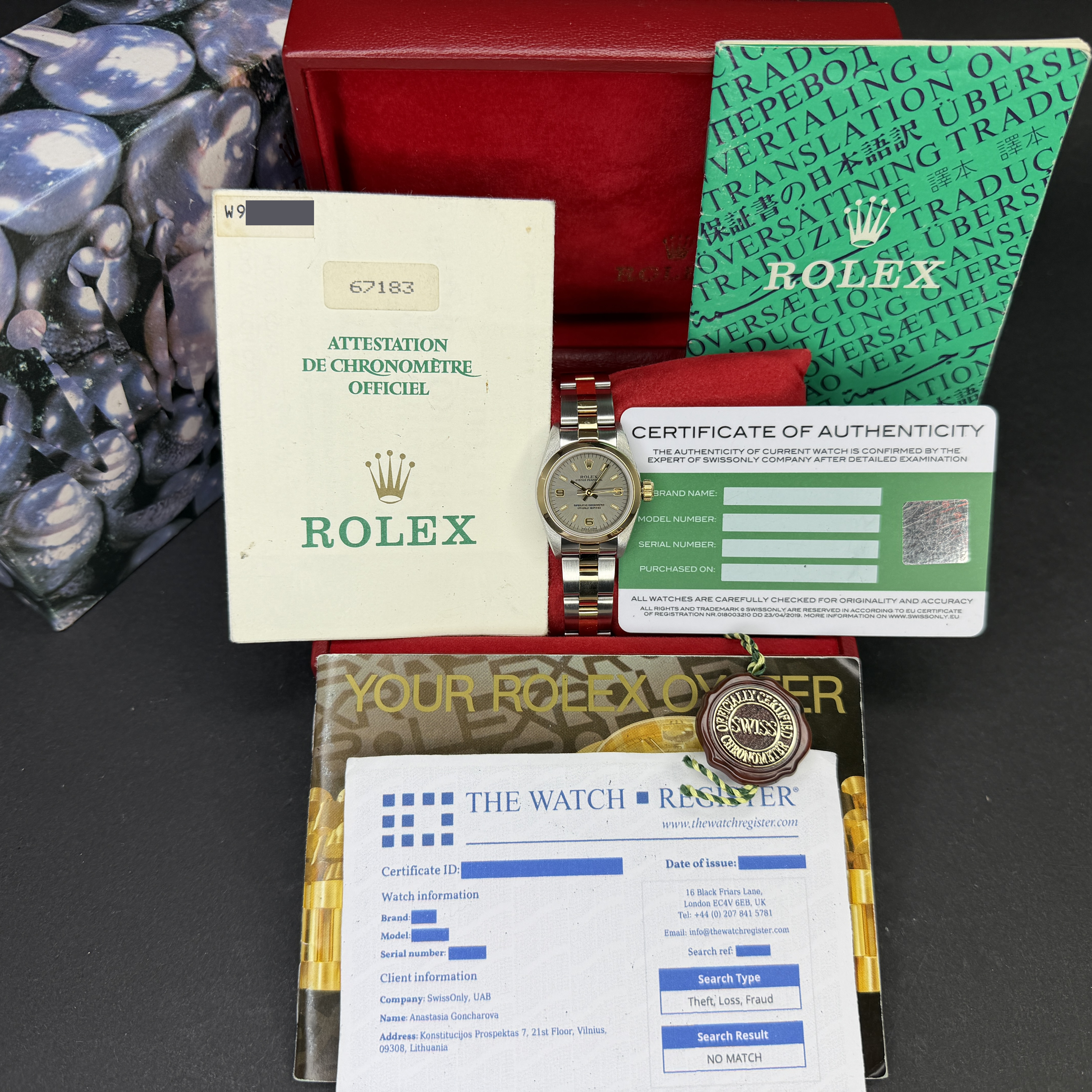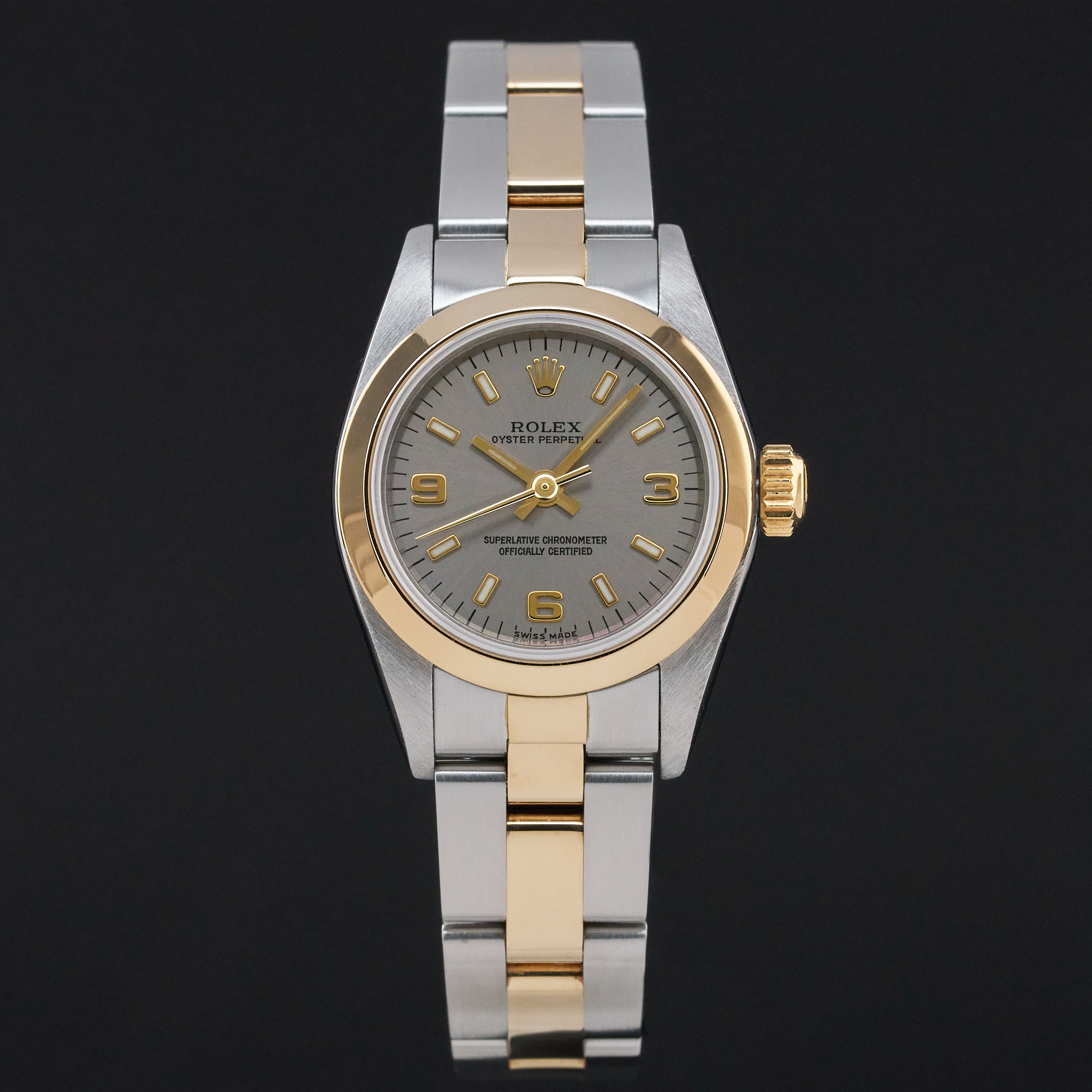 This Rolex Oyster Perpetual Lady 67183 features a Grey Arabic dial and is crafted from 18K yellow gold and stainless steel, with a production year of 1995.