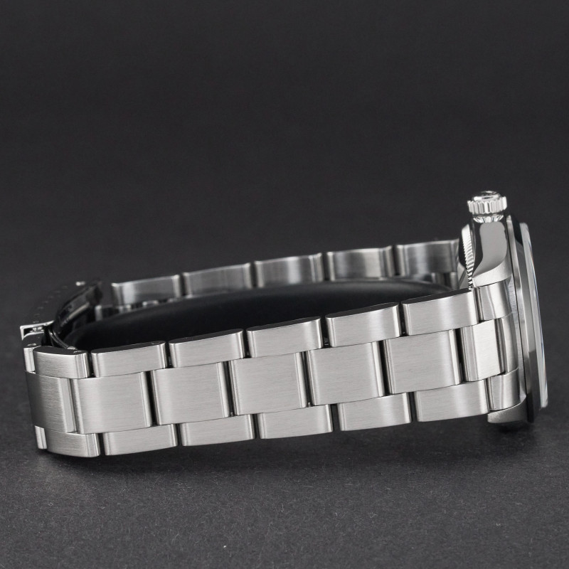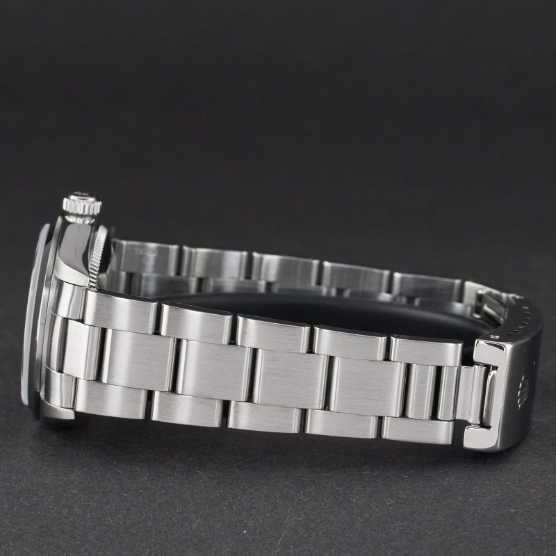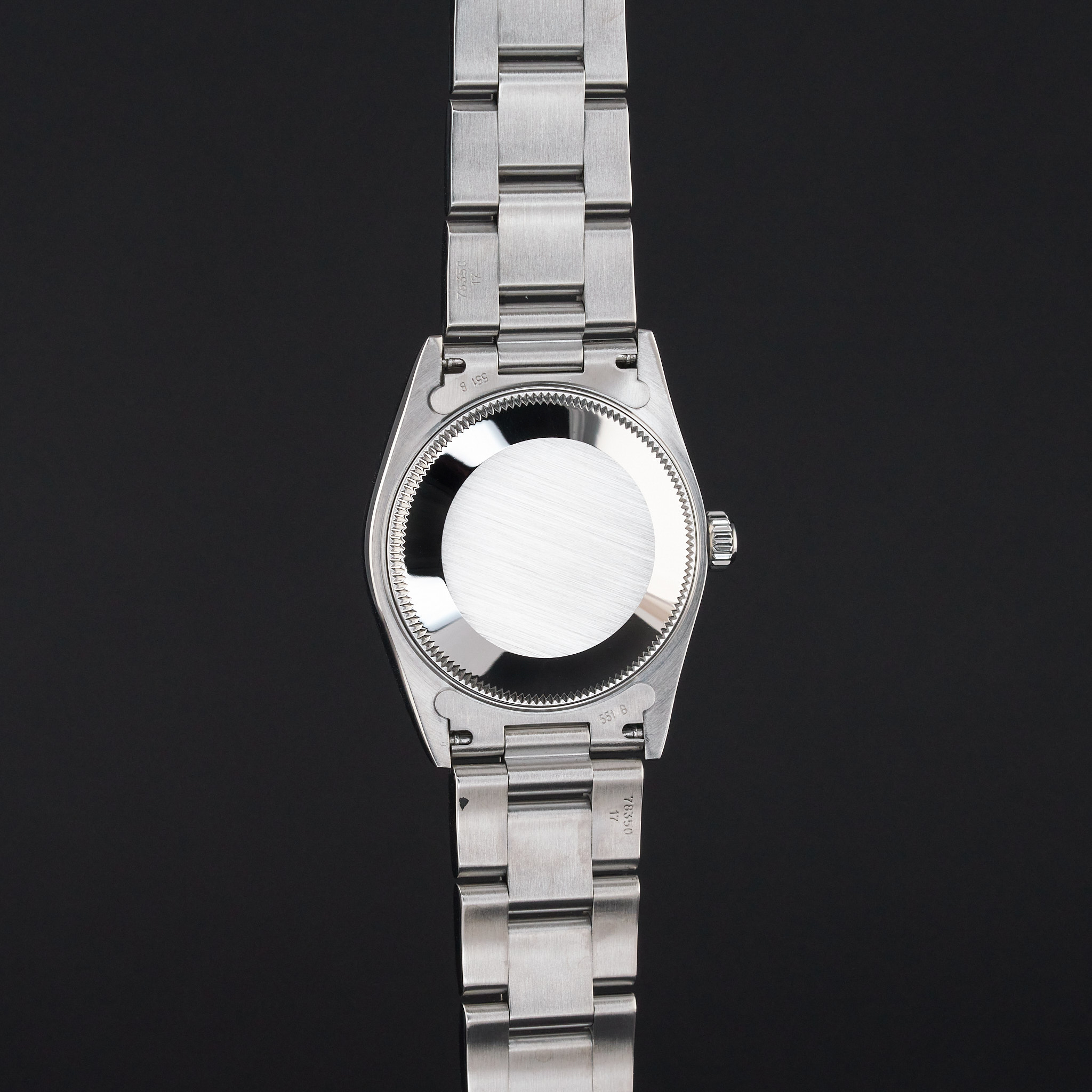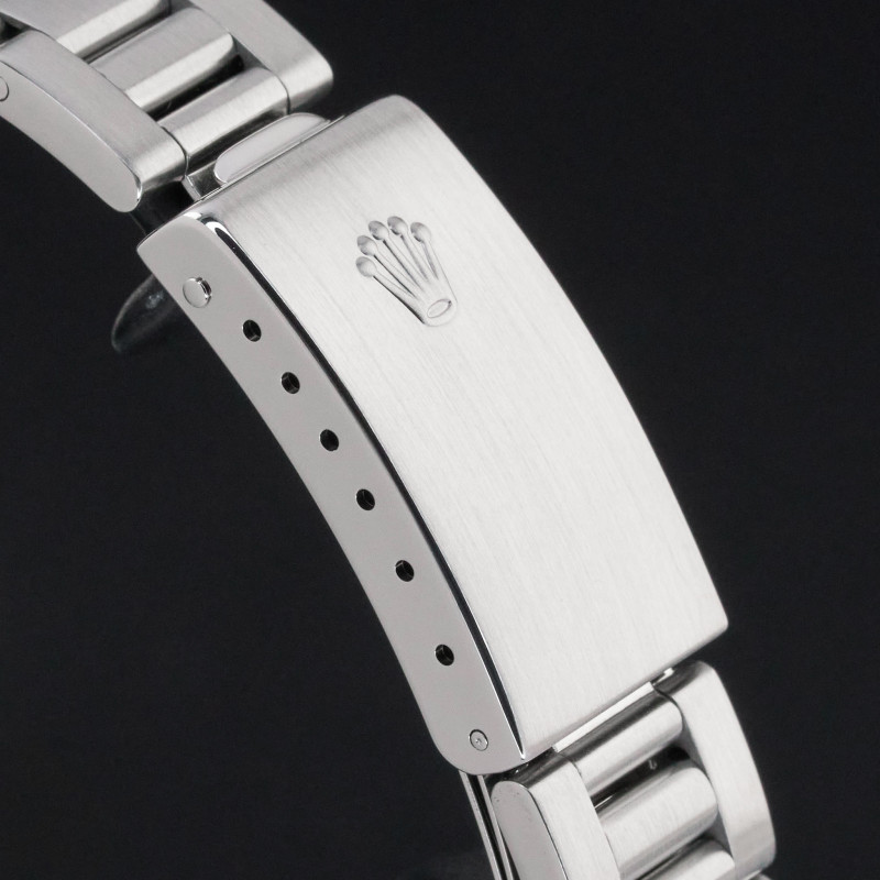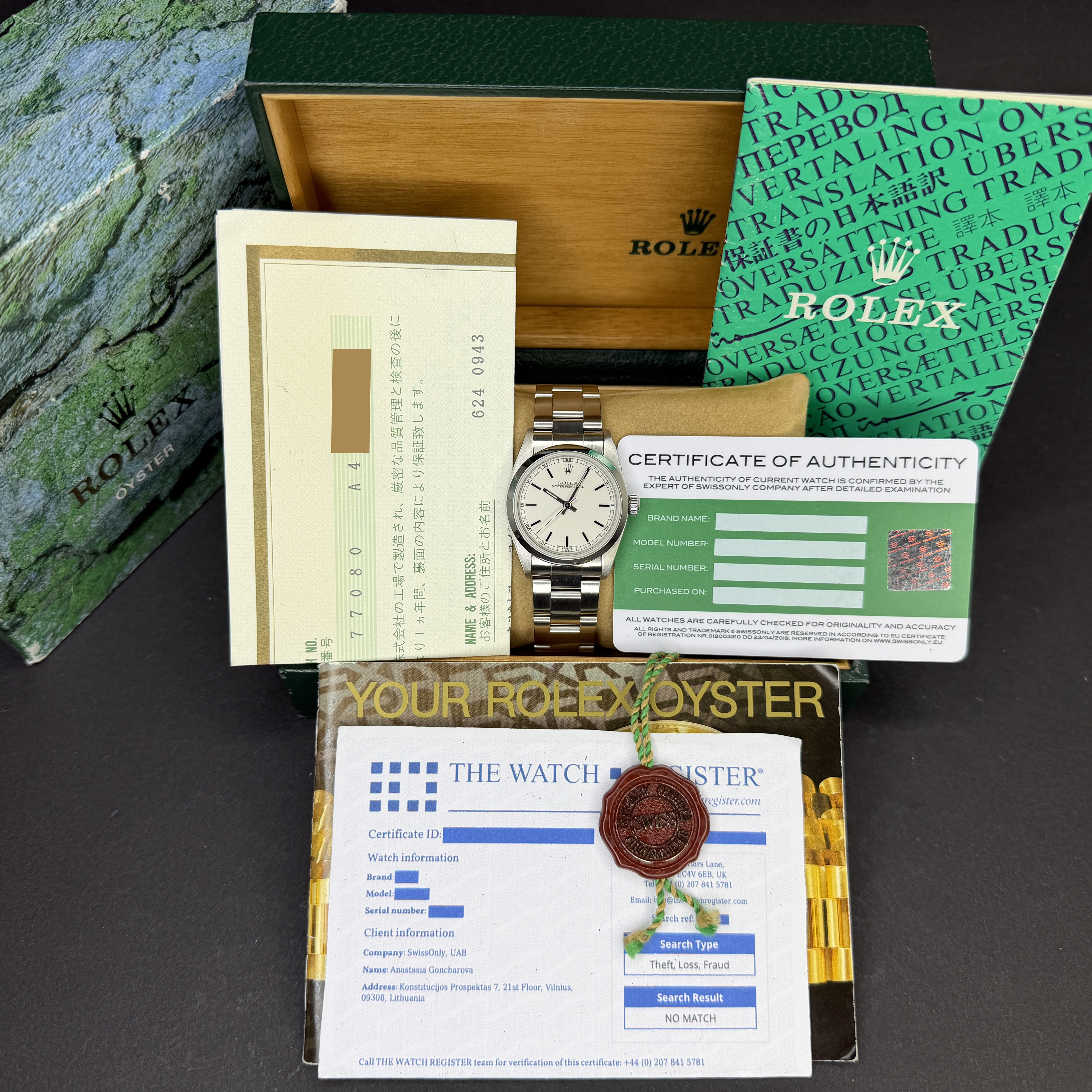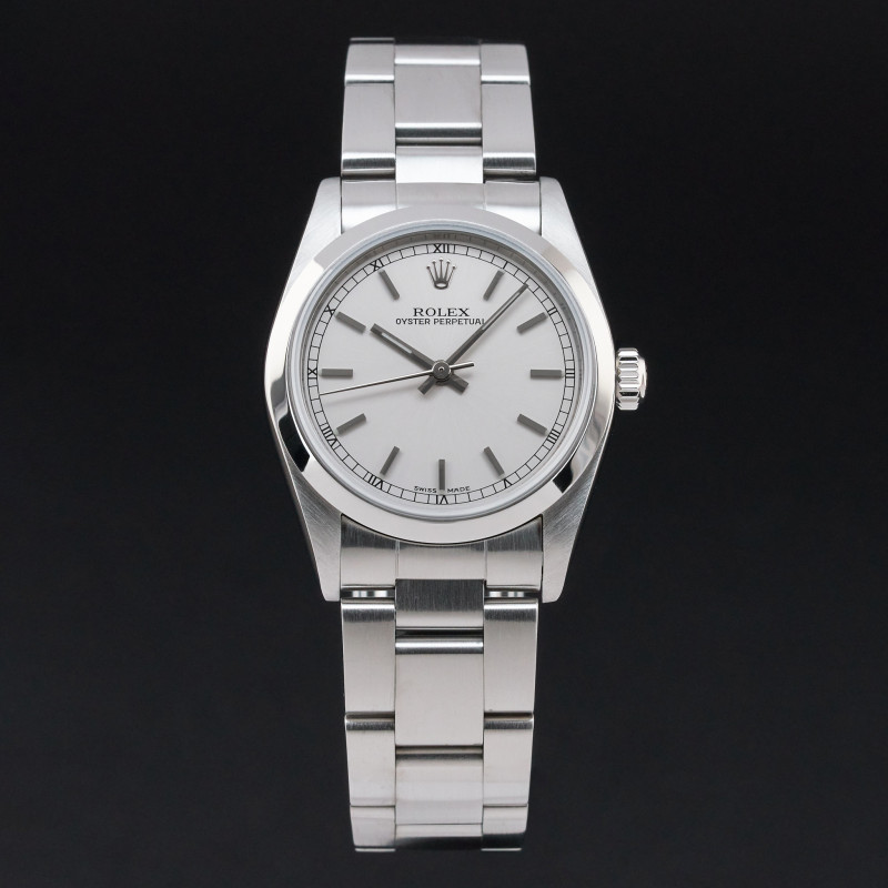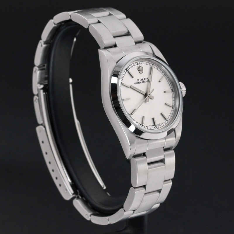This Rolex Oyster Perpetual 77080 features a Silver dial and is crafted from stainless steel, with a production year of 1999.