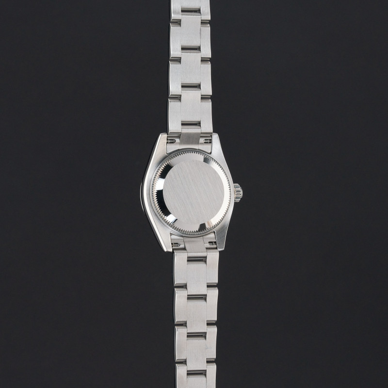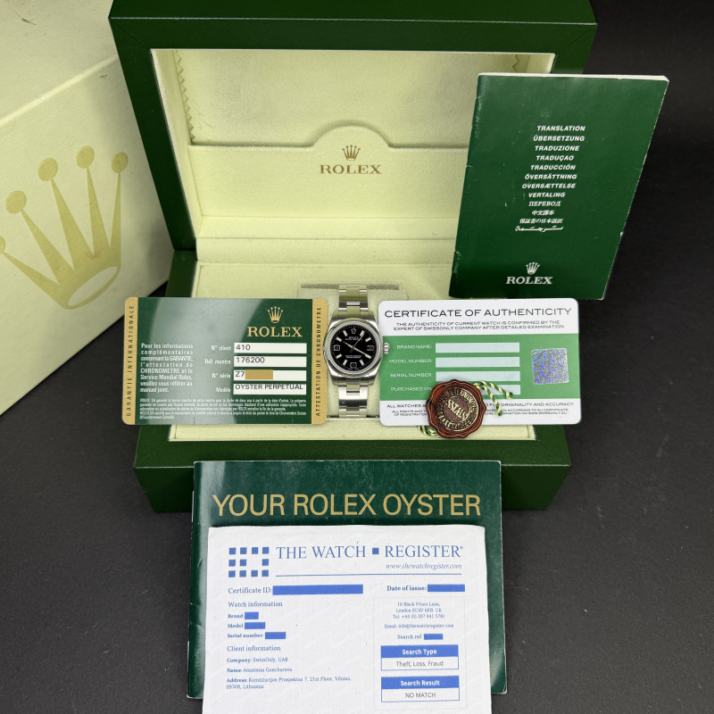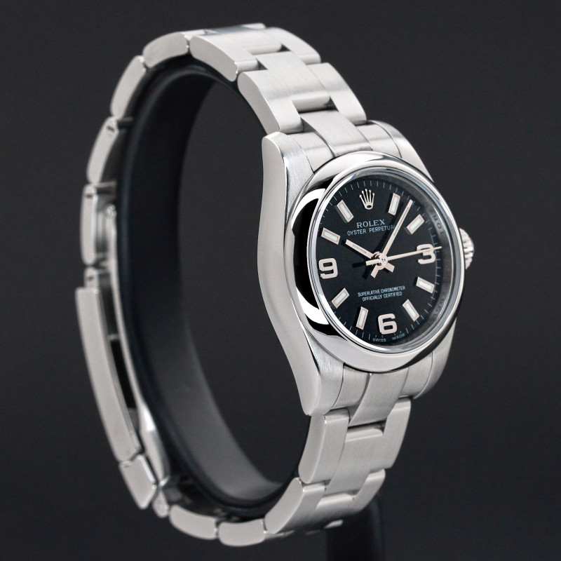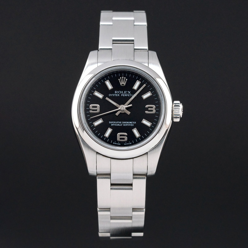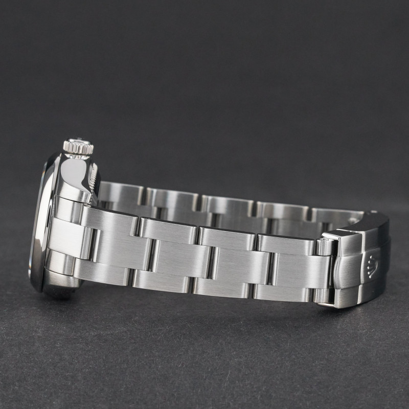 This Rolex Oyster Perpetual Lady 176200 features a Black Arabic dial and is crafted from stainless steel, with a production year of 2006.