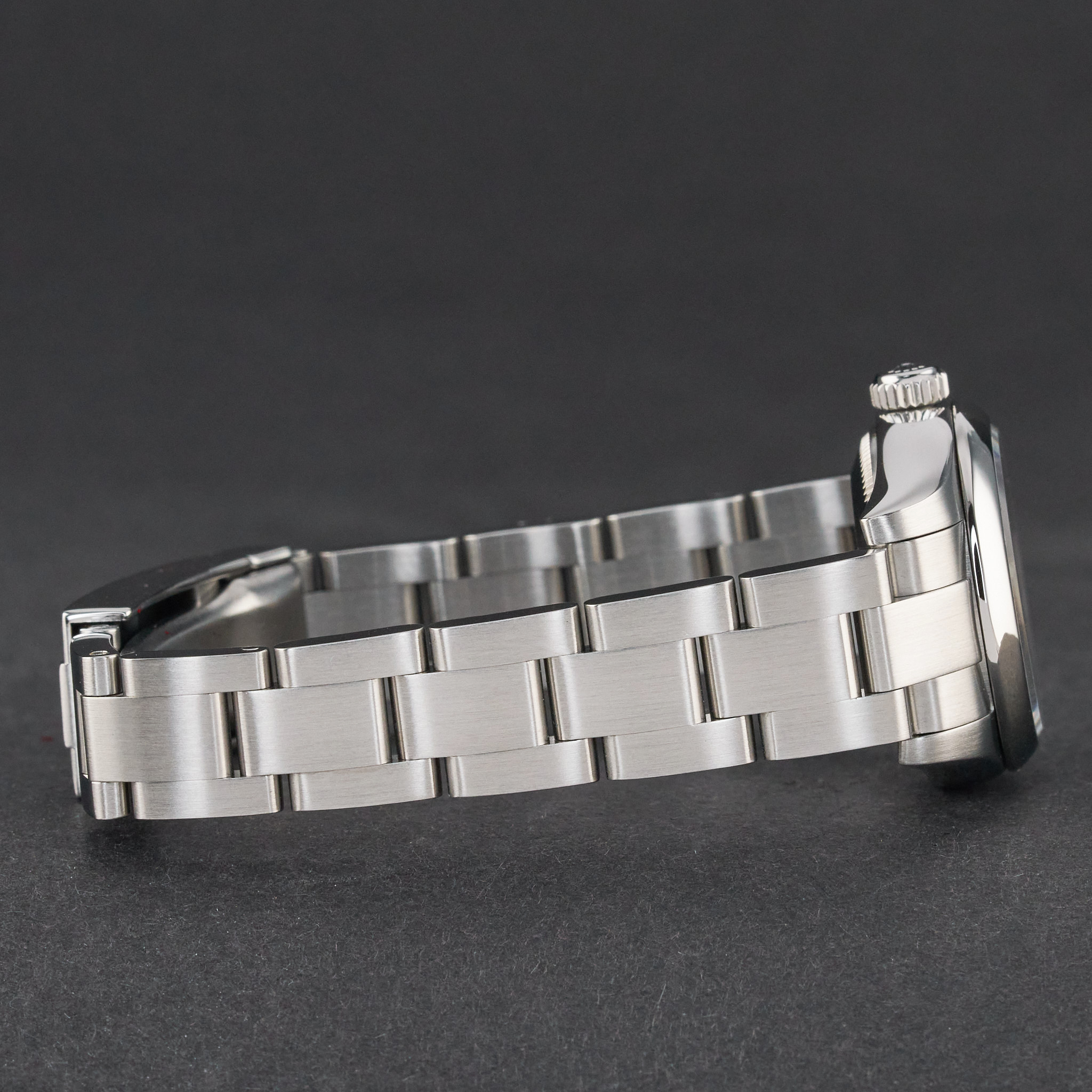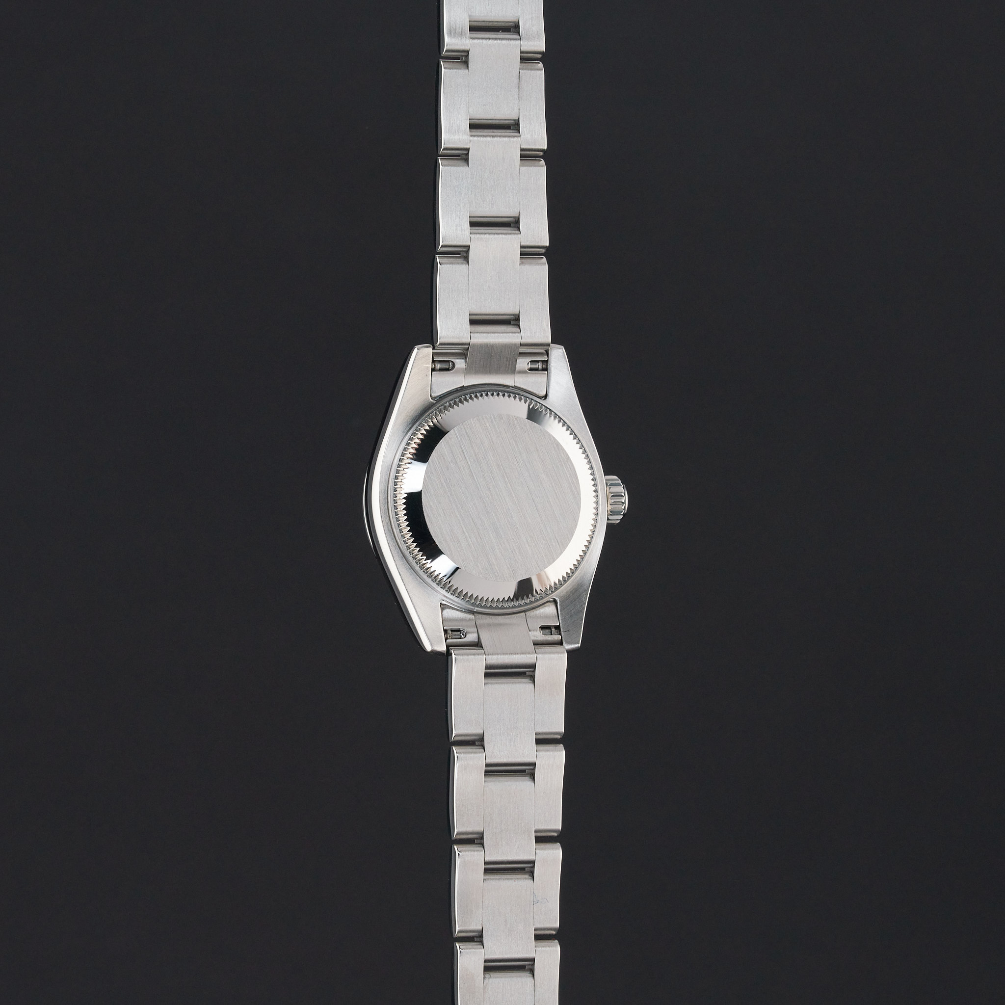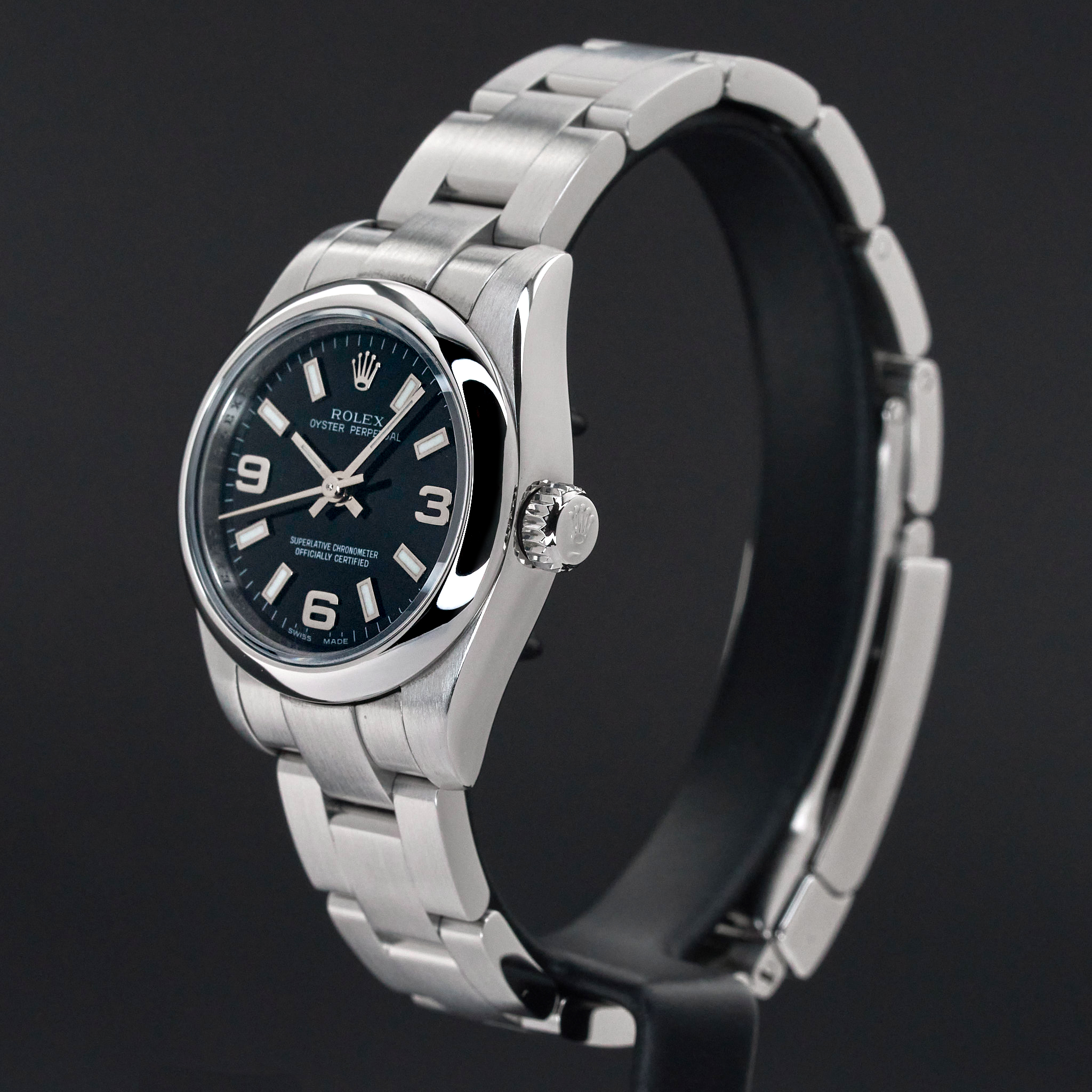This Rolex Oyster Perpetual Lady 176200 features a Black Arabic dial and is crafted from stainless steel, with a production year of 2006.