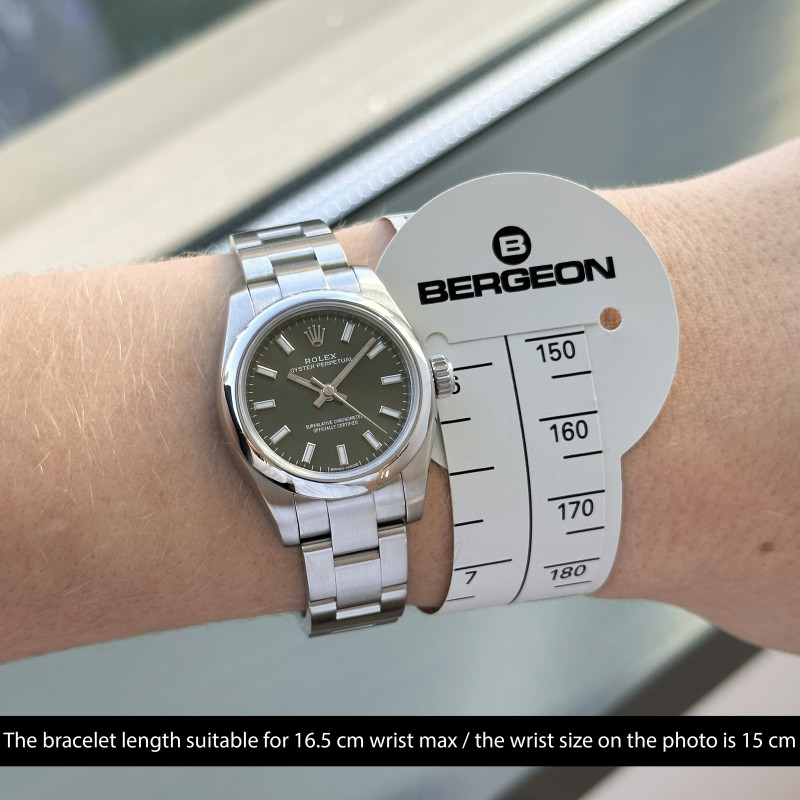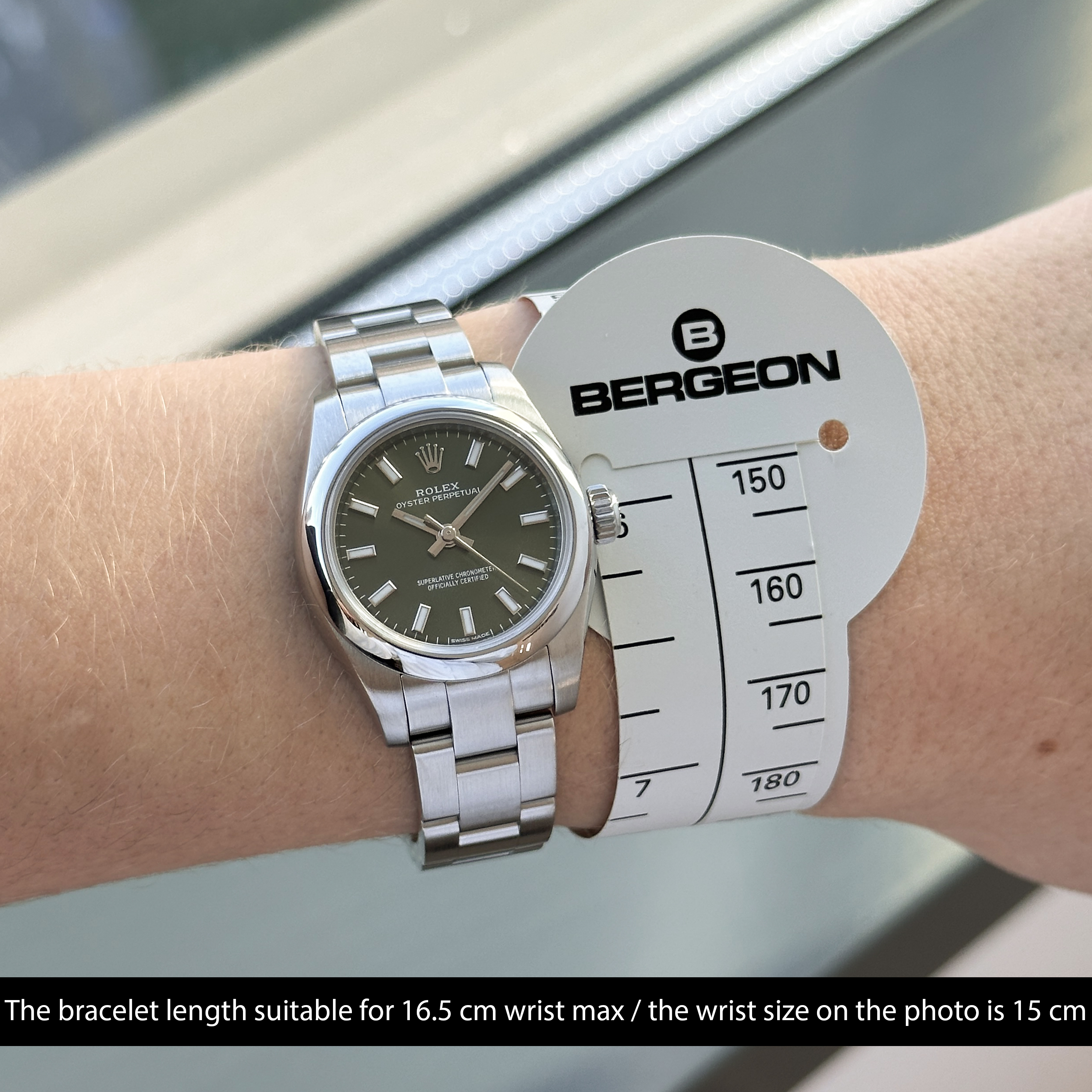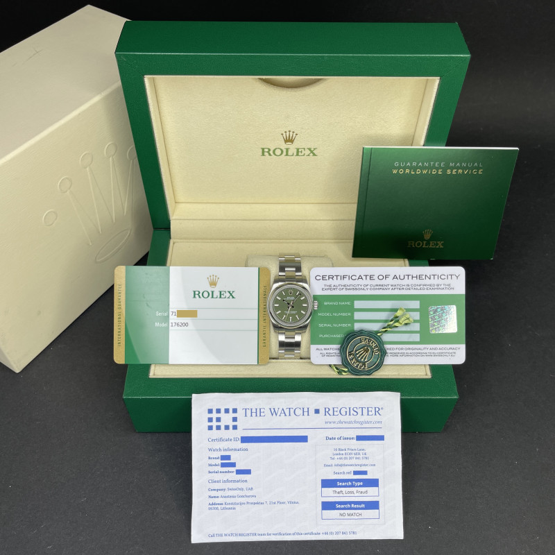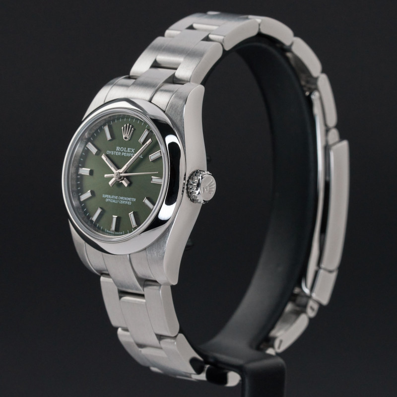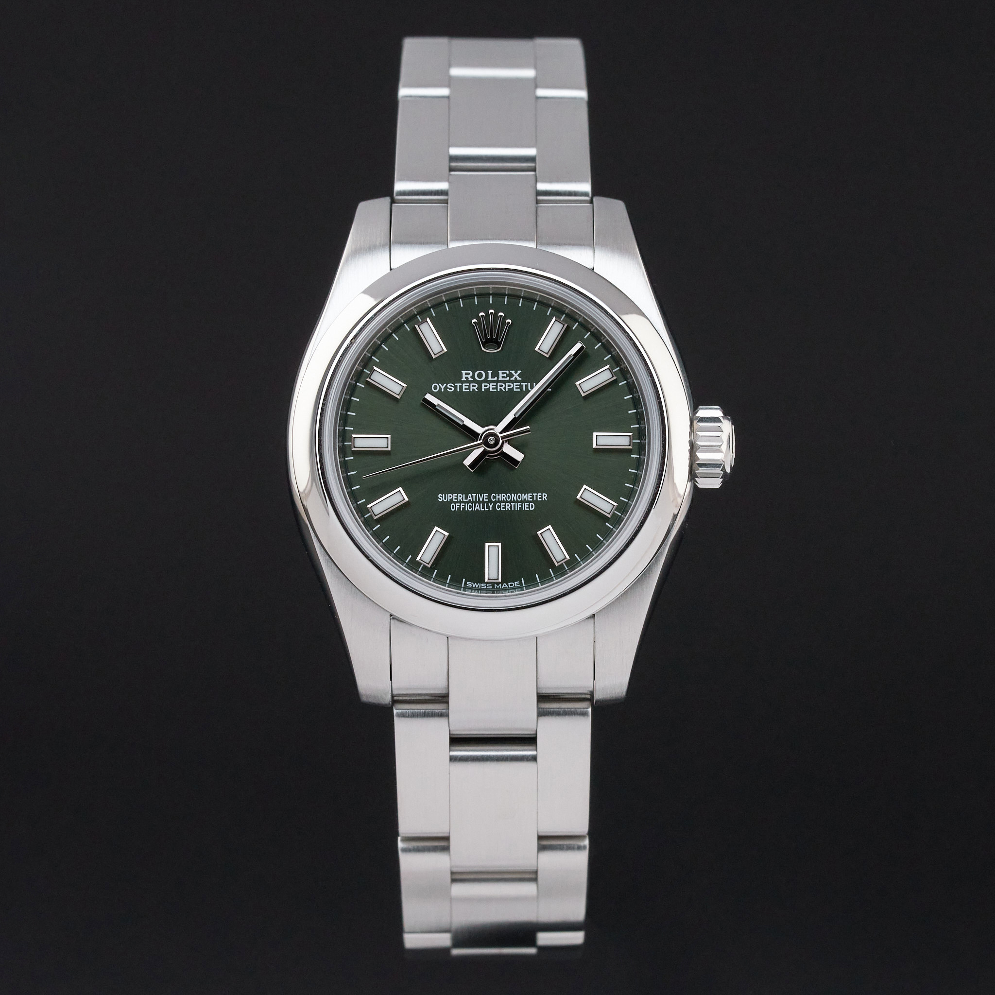 This Rolex Oyster Perpetual Lady 176200 features an Olive dial and is crafted from stainless steel, with a production year of 2019.