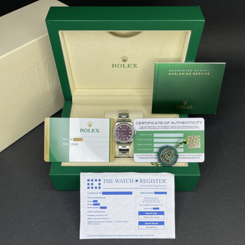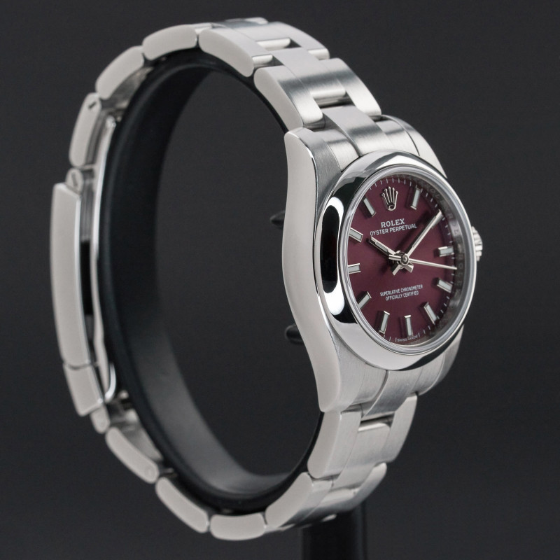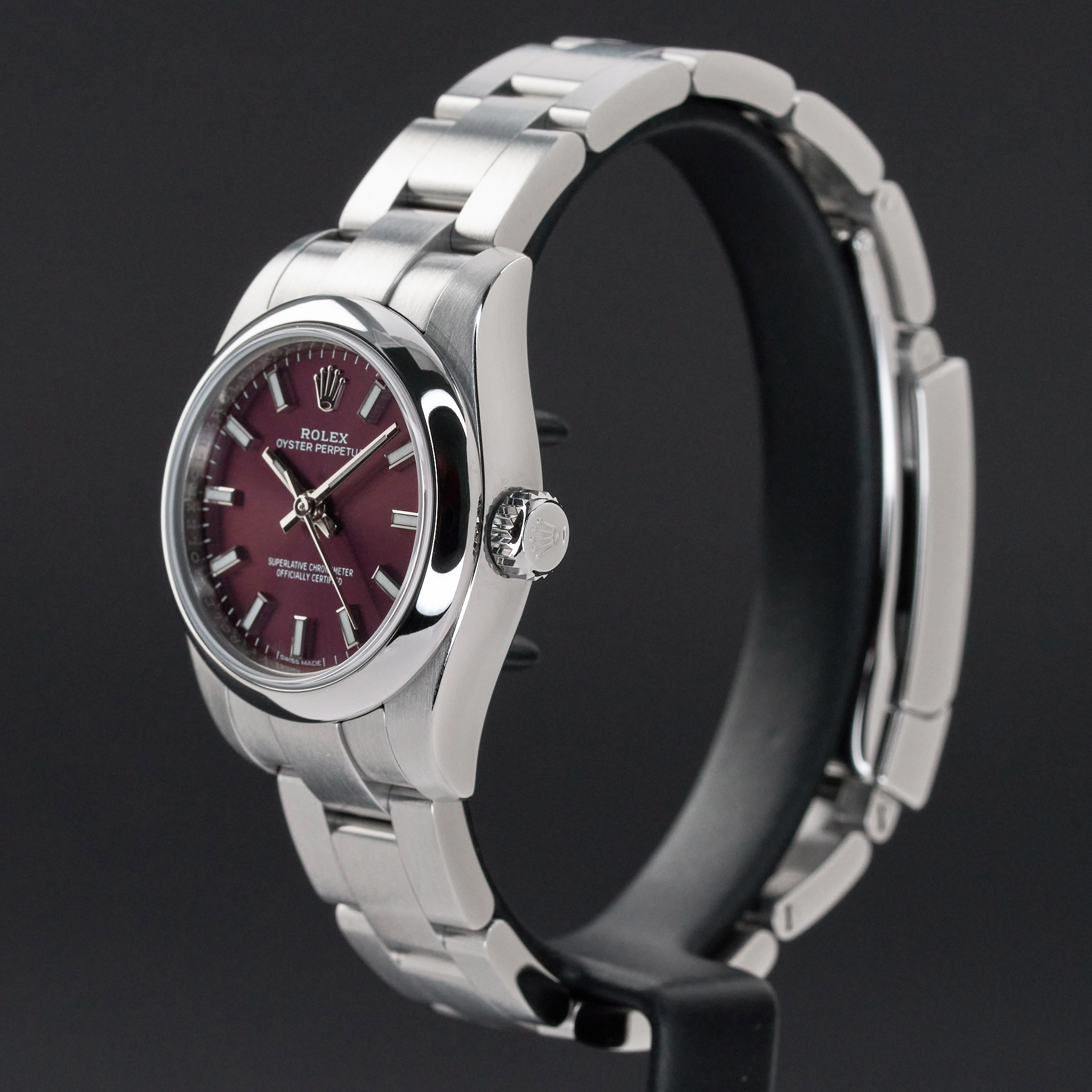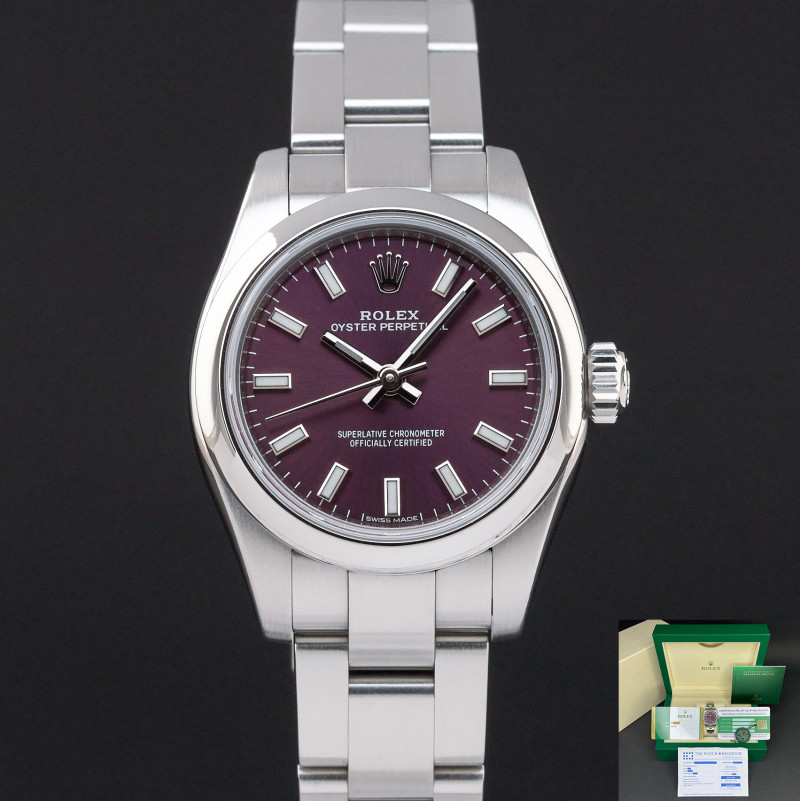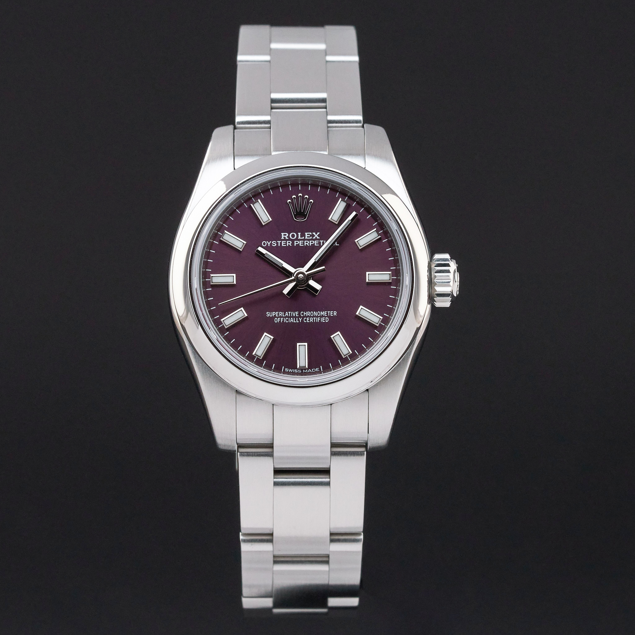 This Rolex Oyster Perpetual Lady 176200 features a Red grape dial and is crafted from stainless steel, with a production year of 2019.