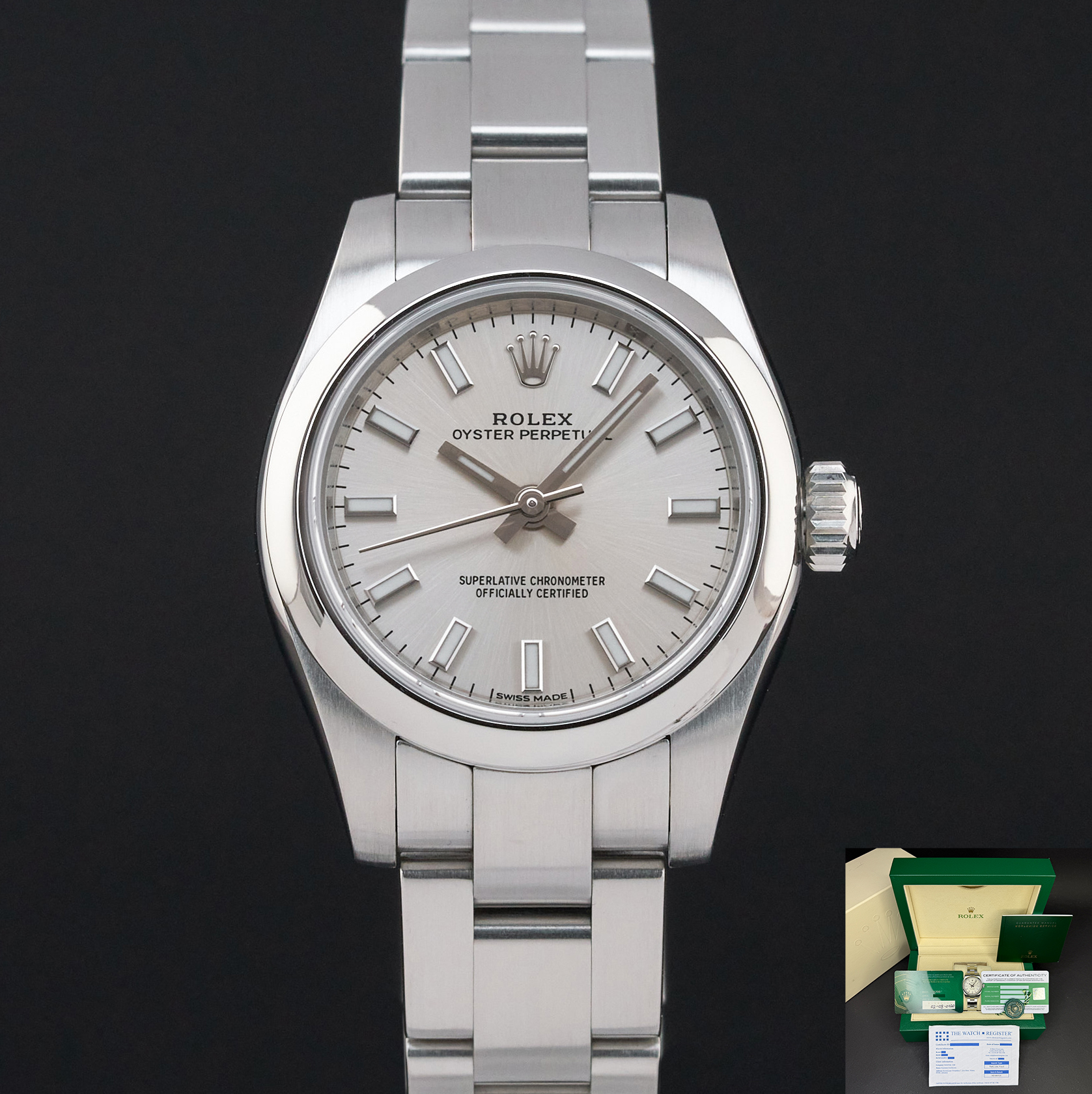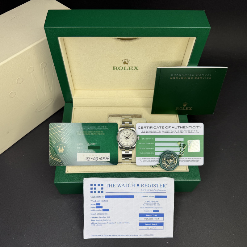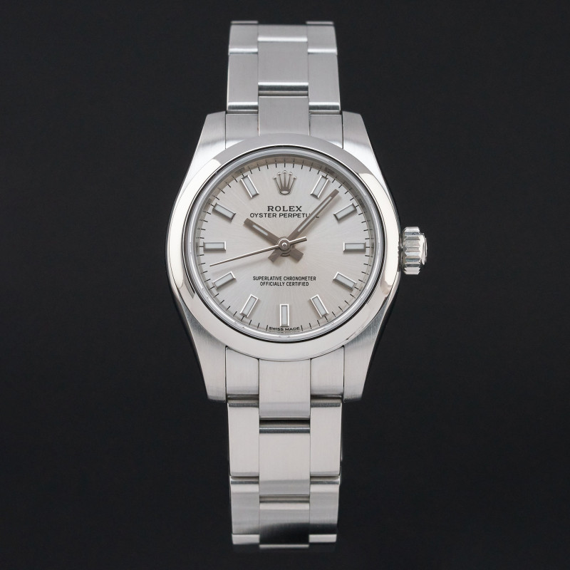 This Rolex Oyster Perpetual Lady 176200 features a Silver dial and is crafted from stainless steel, with a production year of 2020.
