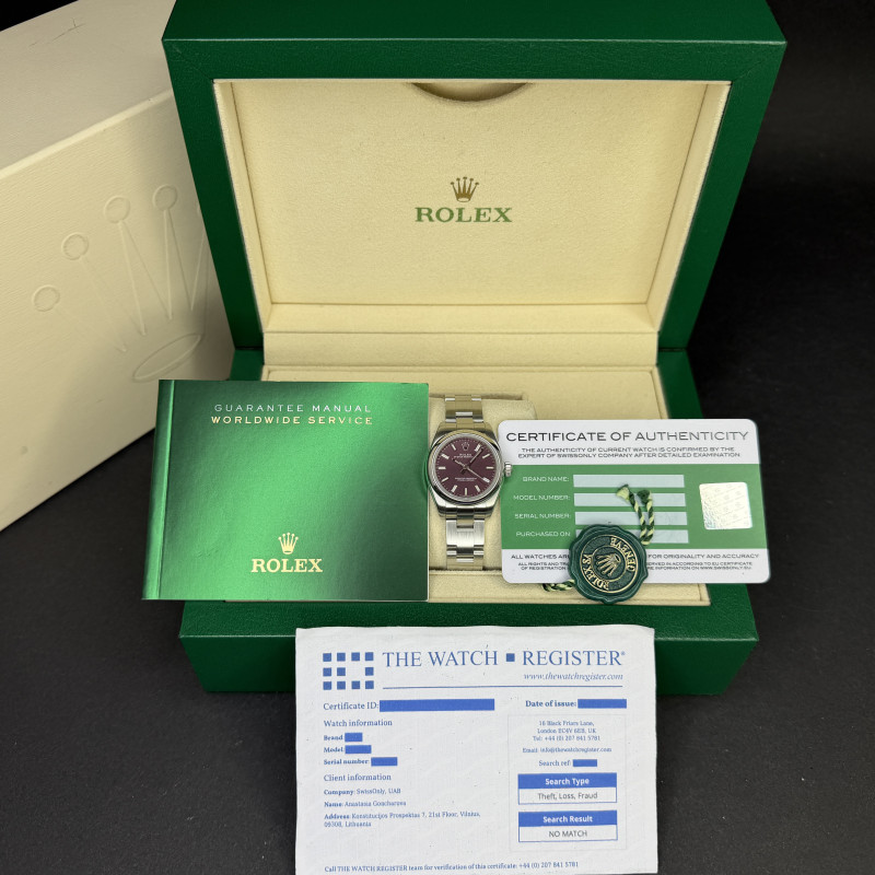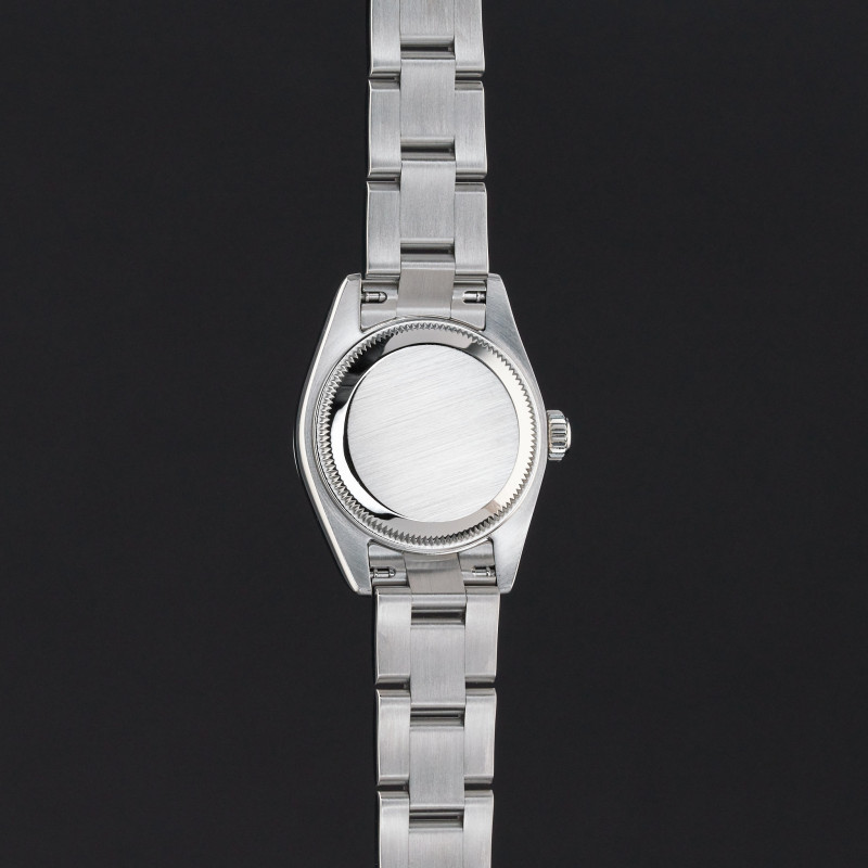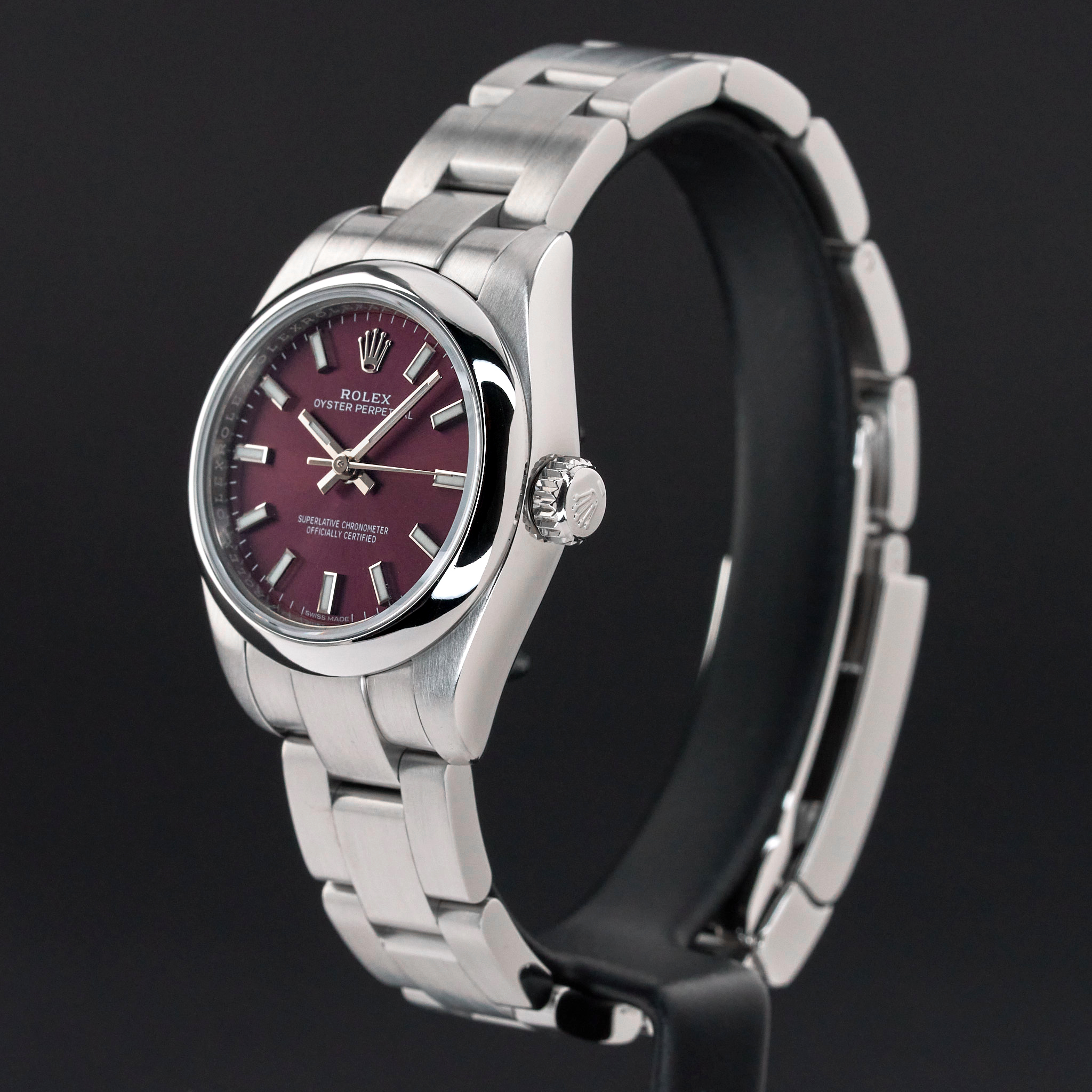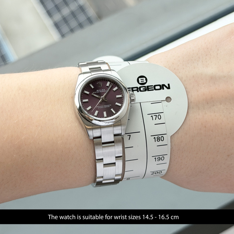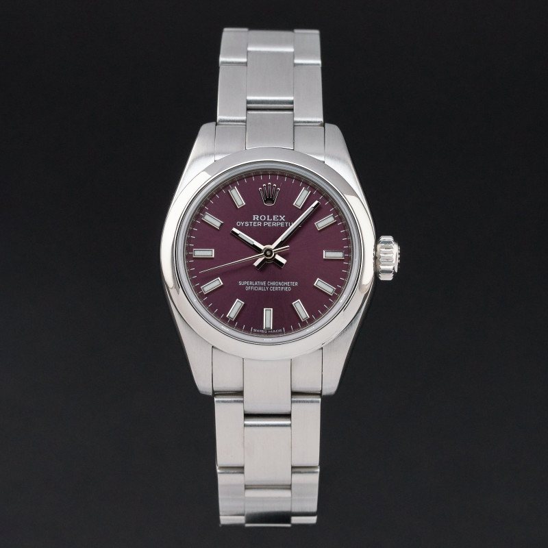 This Rolex Oyster Perpetual Lady 176200 features a Red grape dial and is crafted from stainless steel.