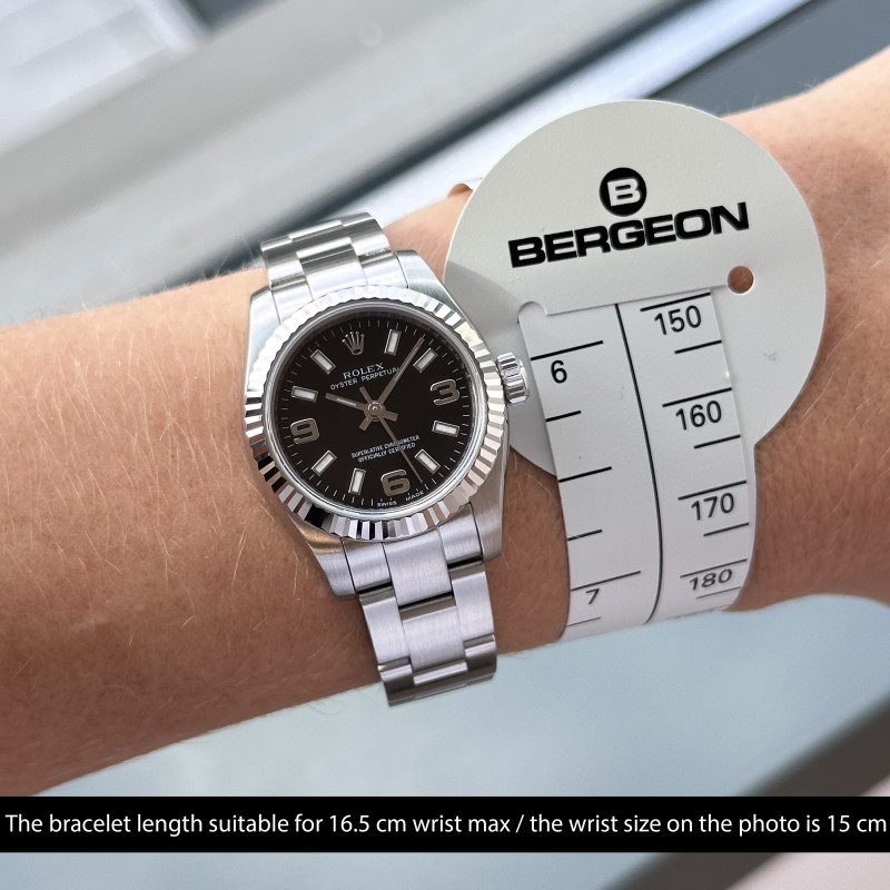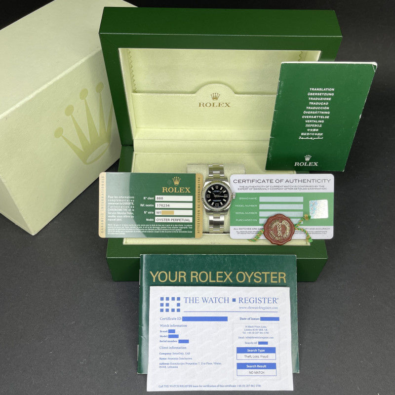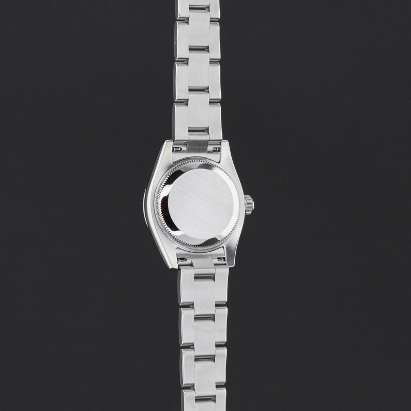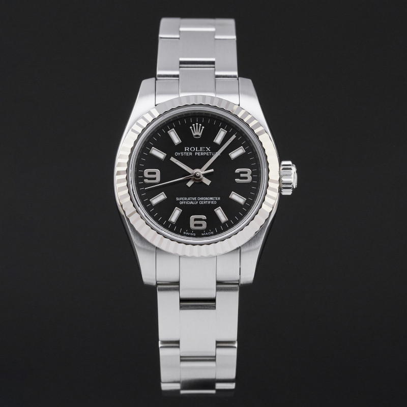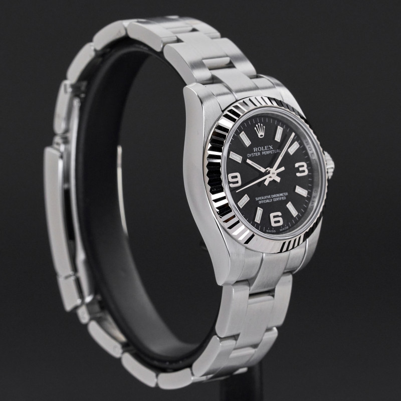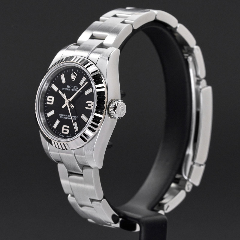 This Rolex Oyster Perpetual Lady 176234 features a Black Arabic dial and is crafted from stainless steel, with a production year of 2008.
