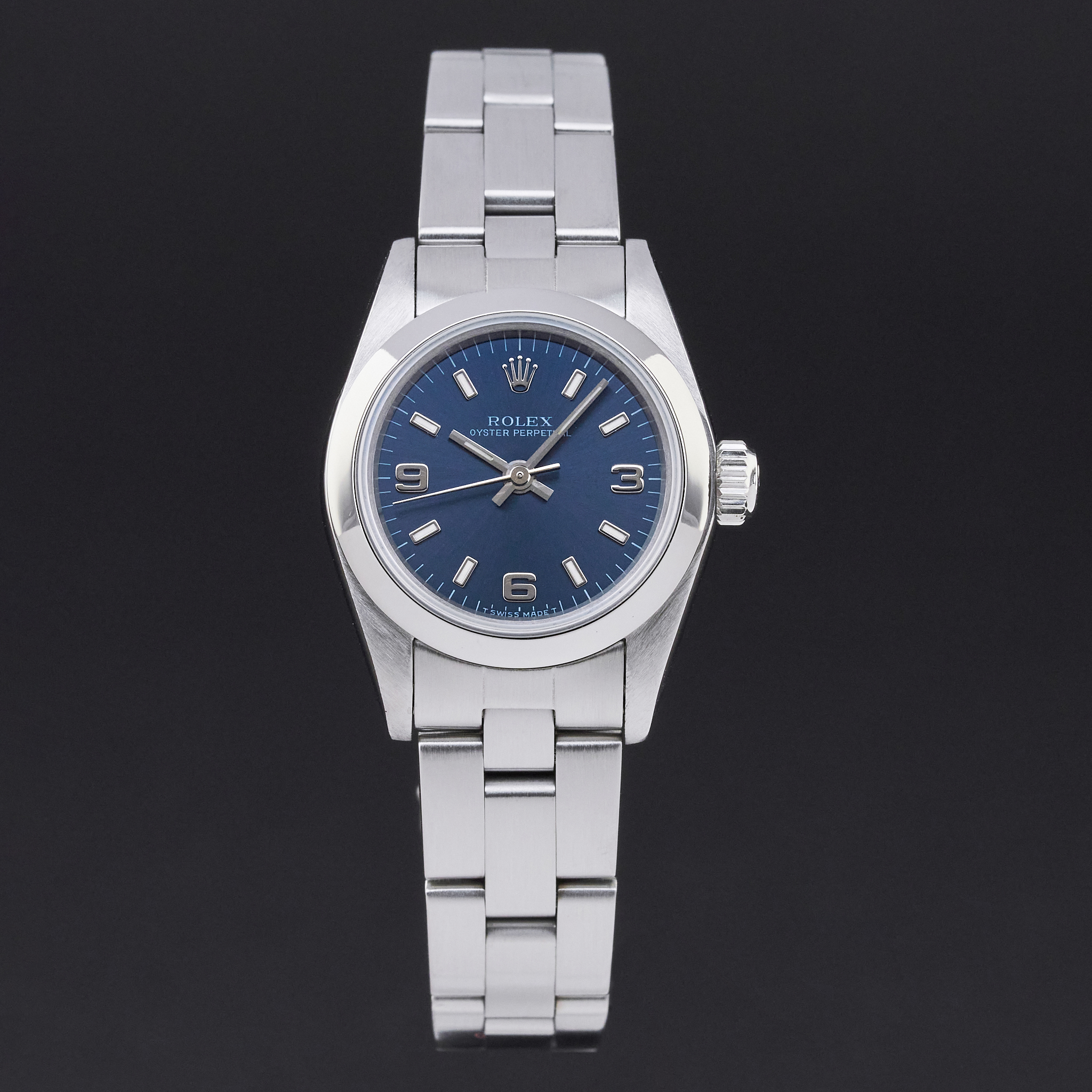 This particular Rolex Oyster Perpetual Lady introduced in 1996, is a masterclass in timeless design and precision. Its steel case frames a vibrant blue Arabic dial, creating a striking contrast that is both elegant and bold.