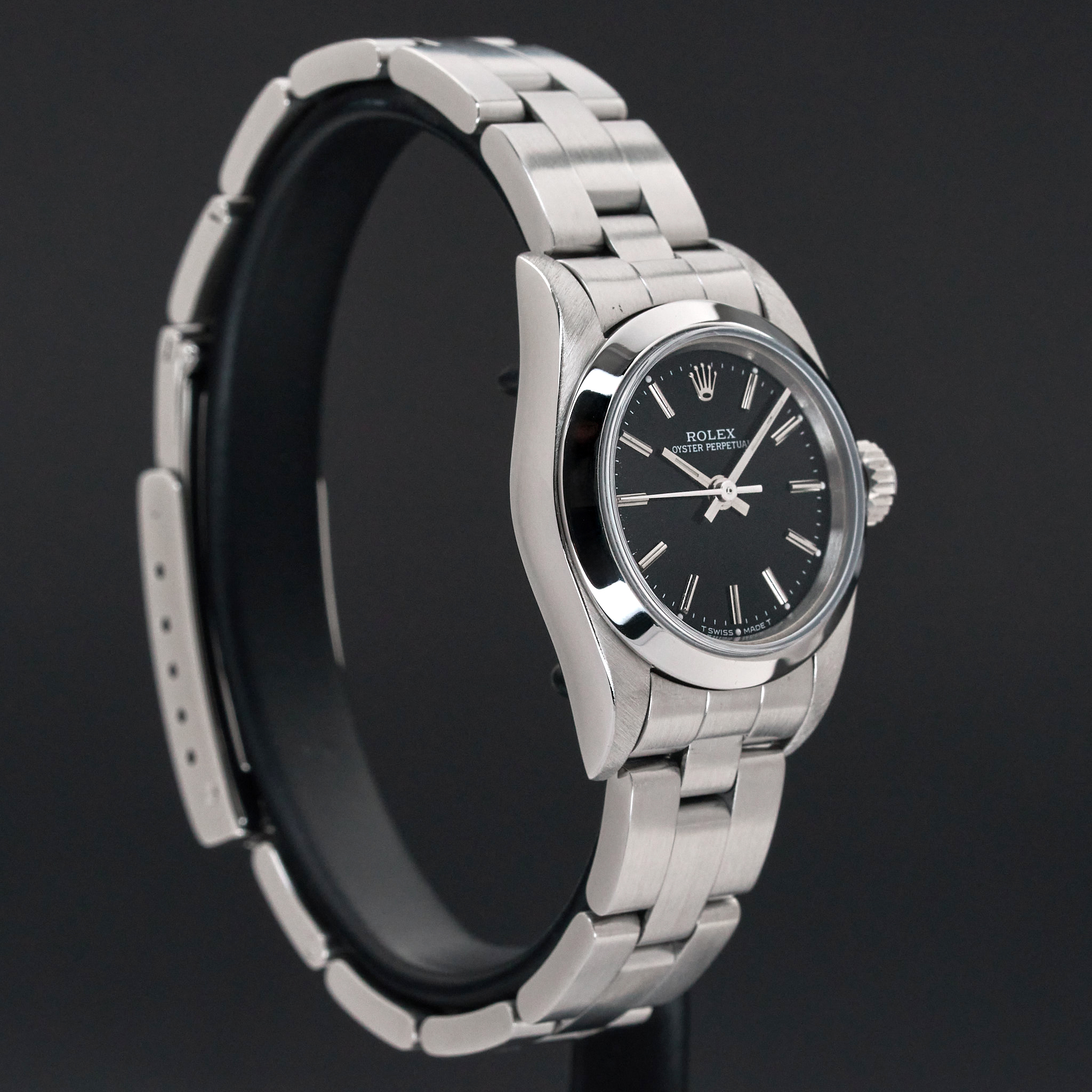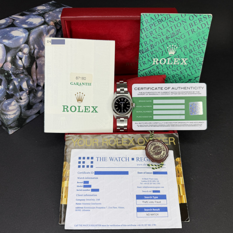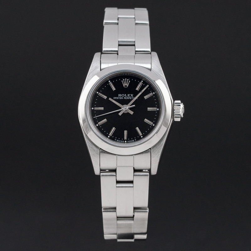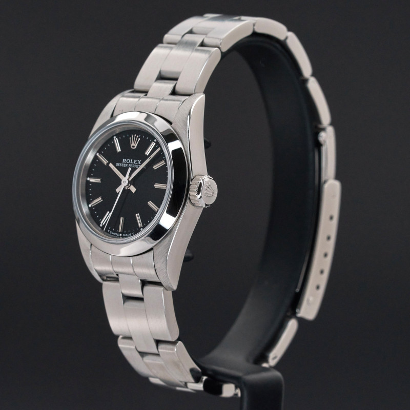 This Rolex Oyster Perpetual Lady 67180 features a Black dial and is crafted from from stainless steel, with a production year of 1997.