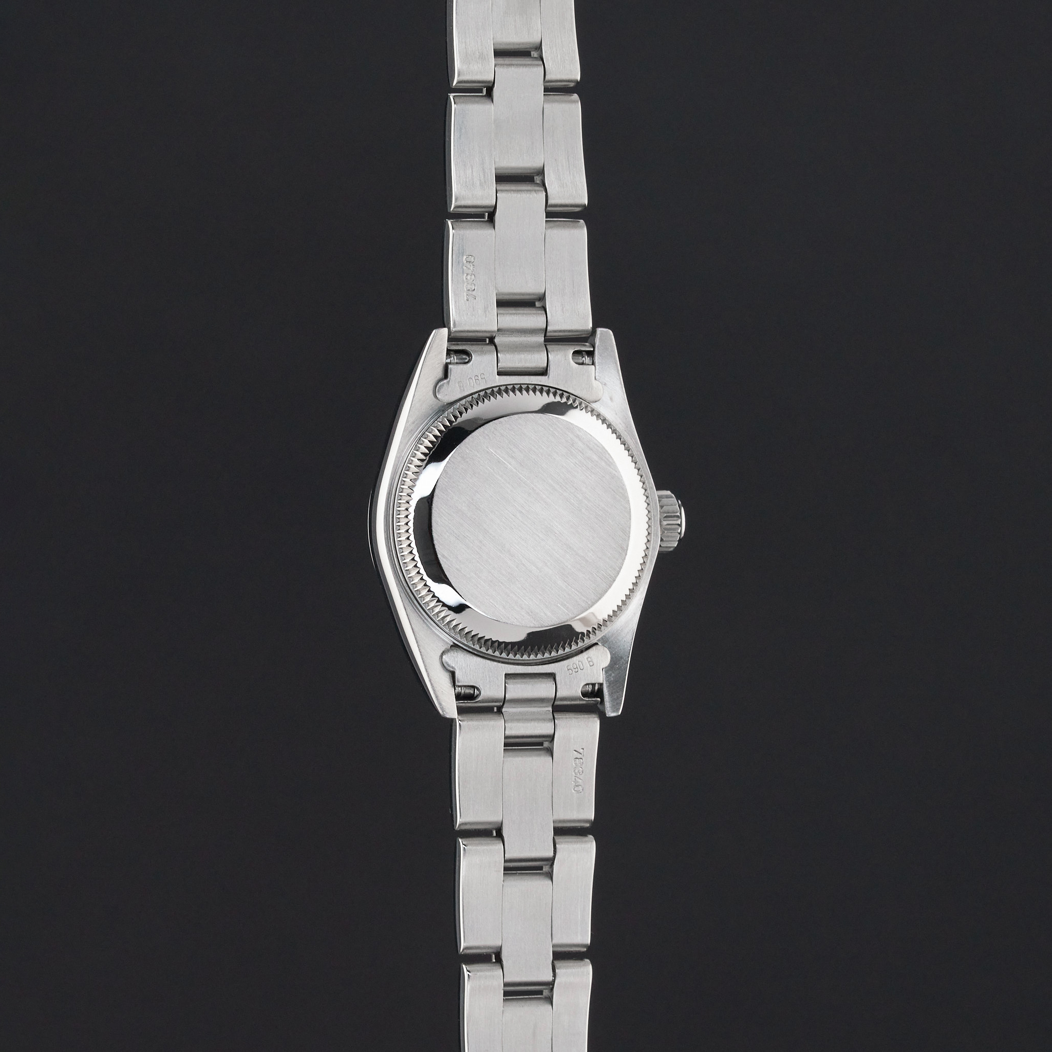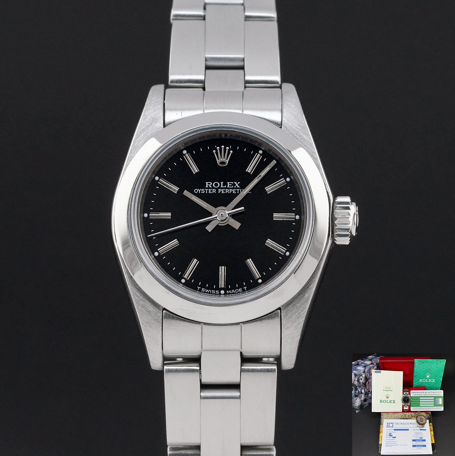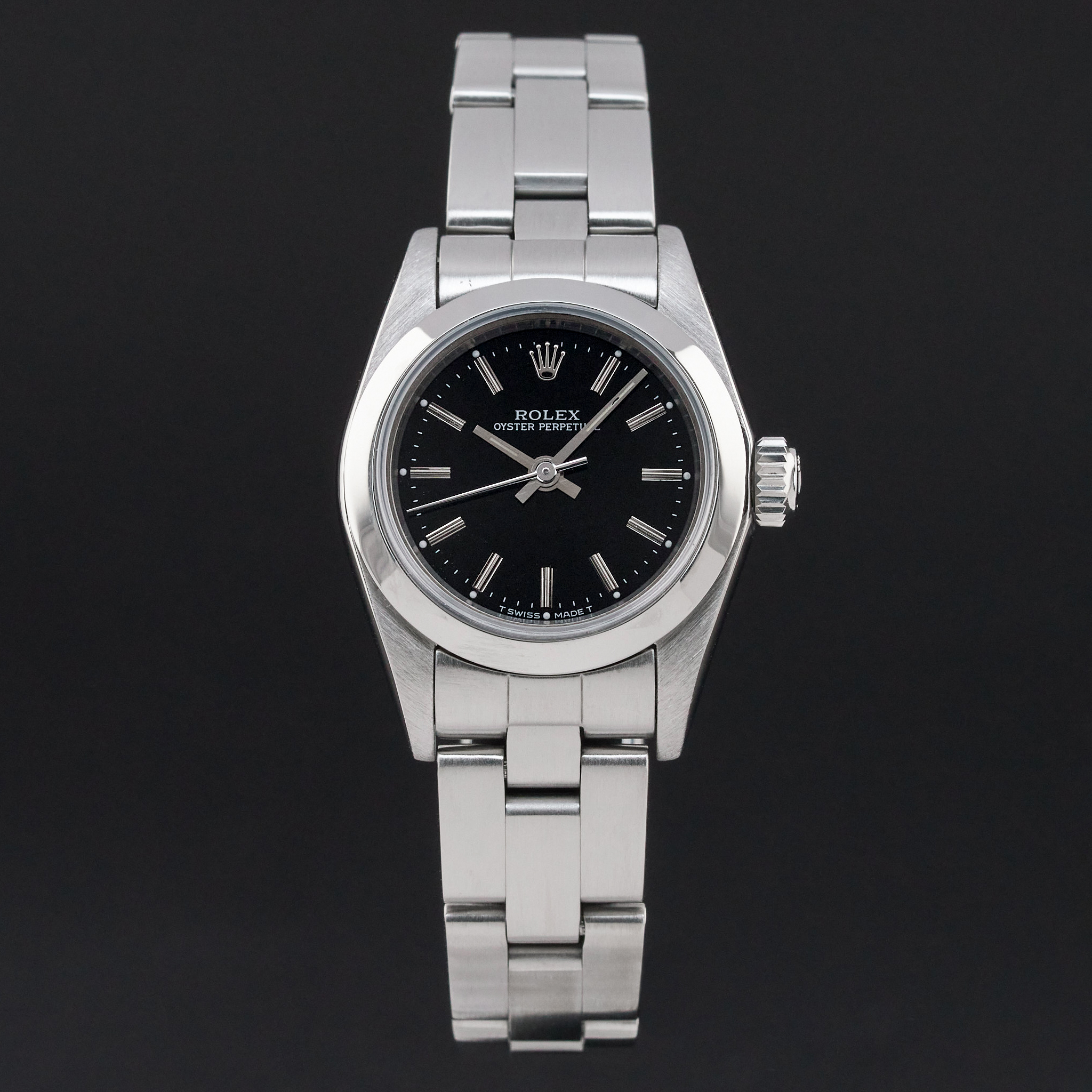 This Rolex Oyster Perpetual Lady 67180 features a Black dial and is crafted from from stainless steel, with a production year of 1997.