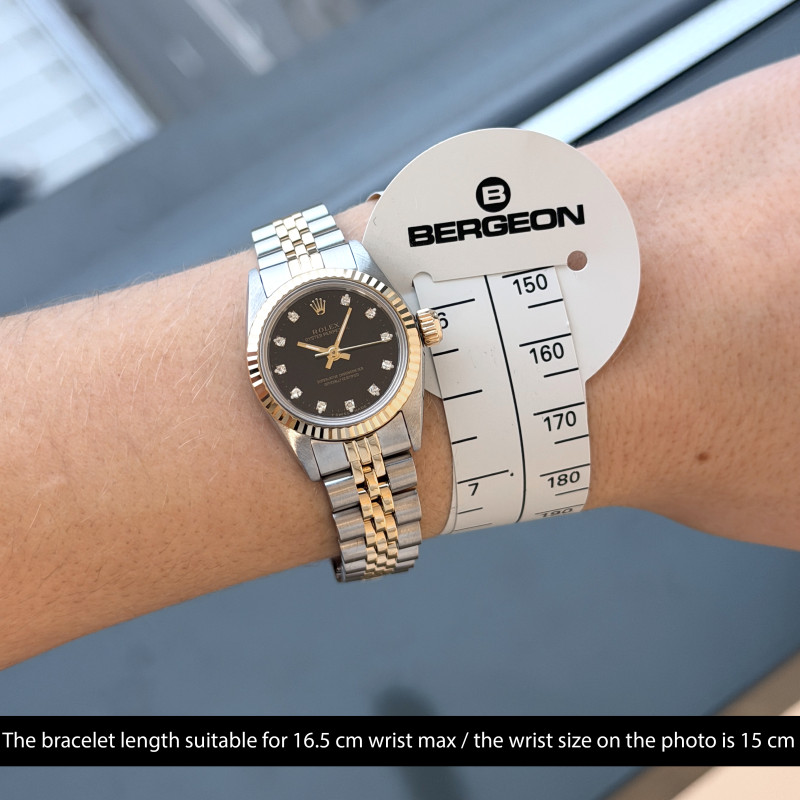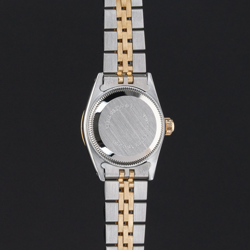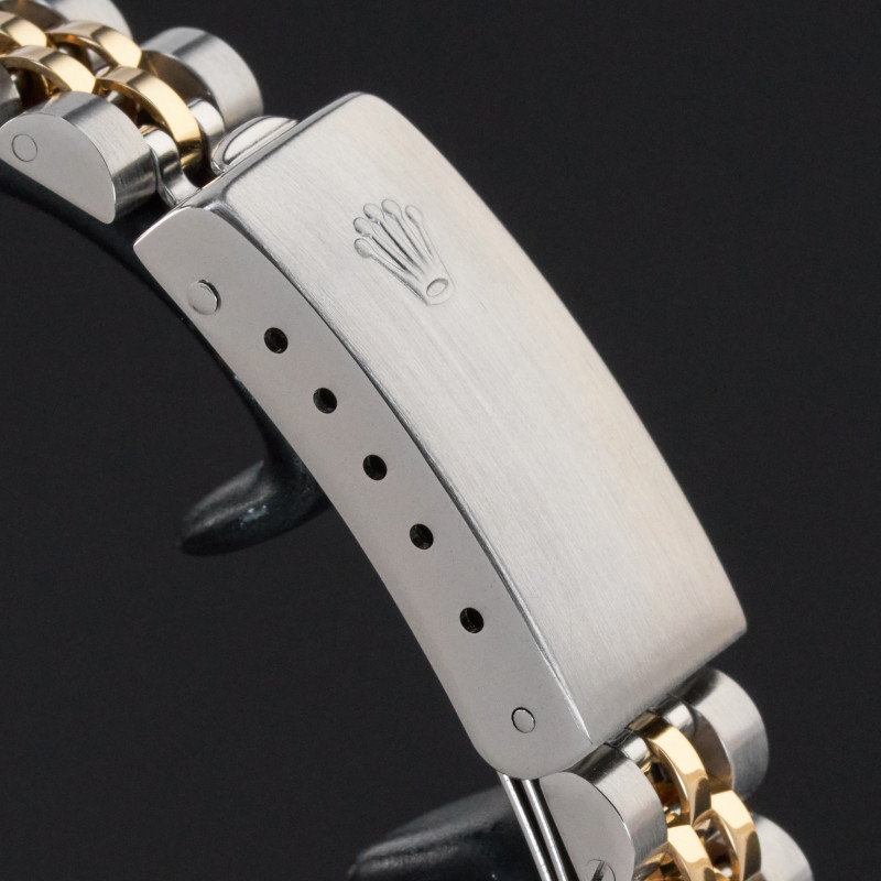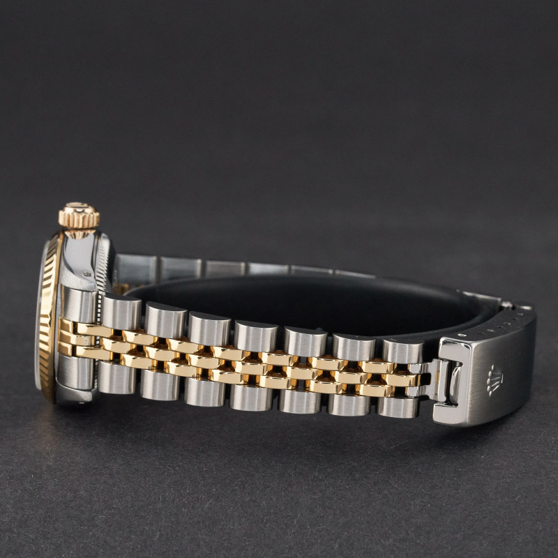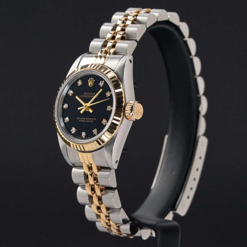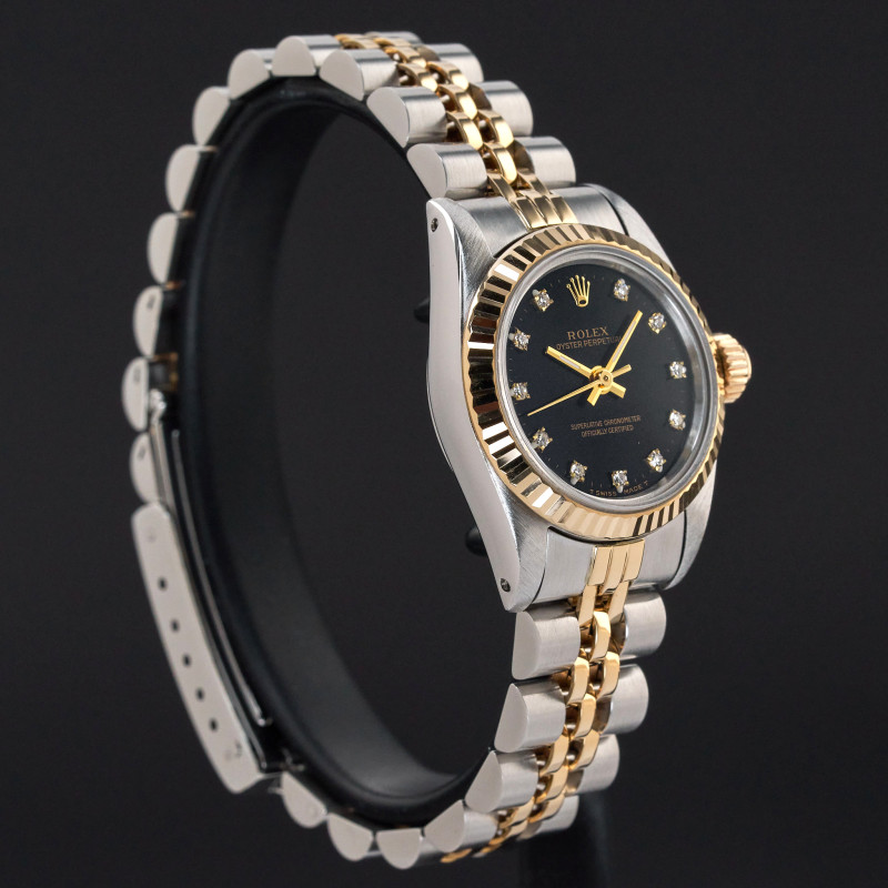 This Rolex Oyster Perpetual Lady 67193 features a Black small diamond dial and is crafted from 18K yellow gold and stainless steel, with a production year of 1990.