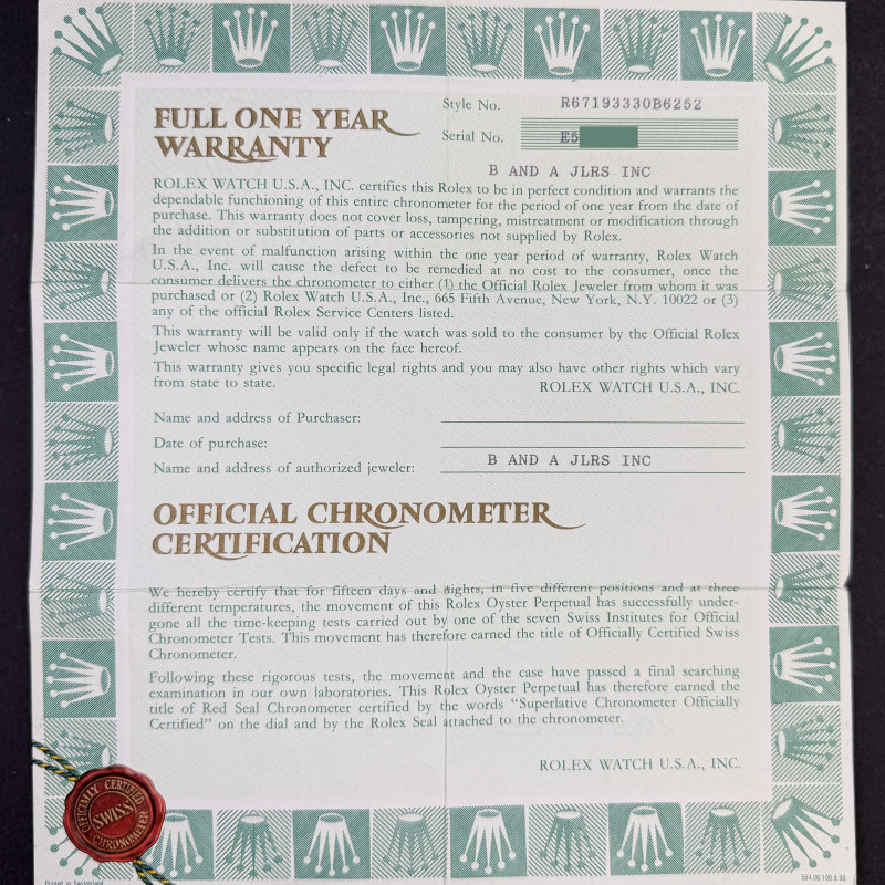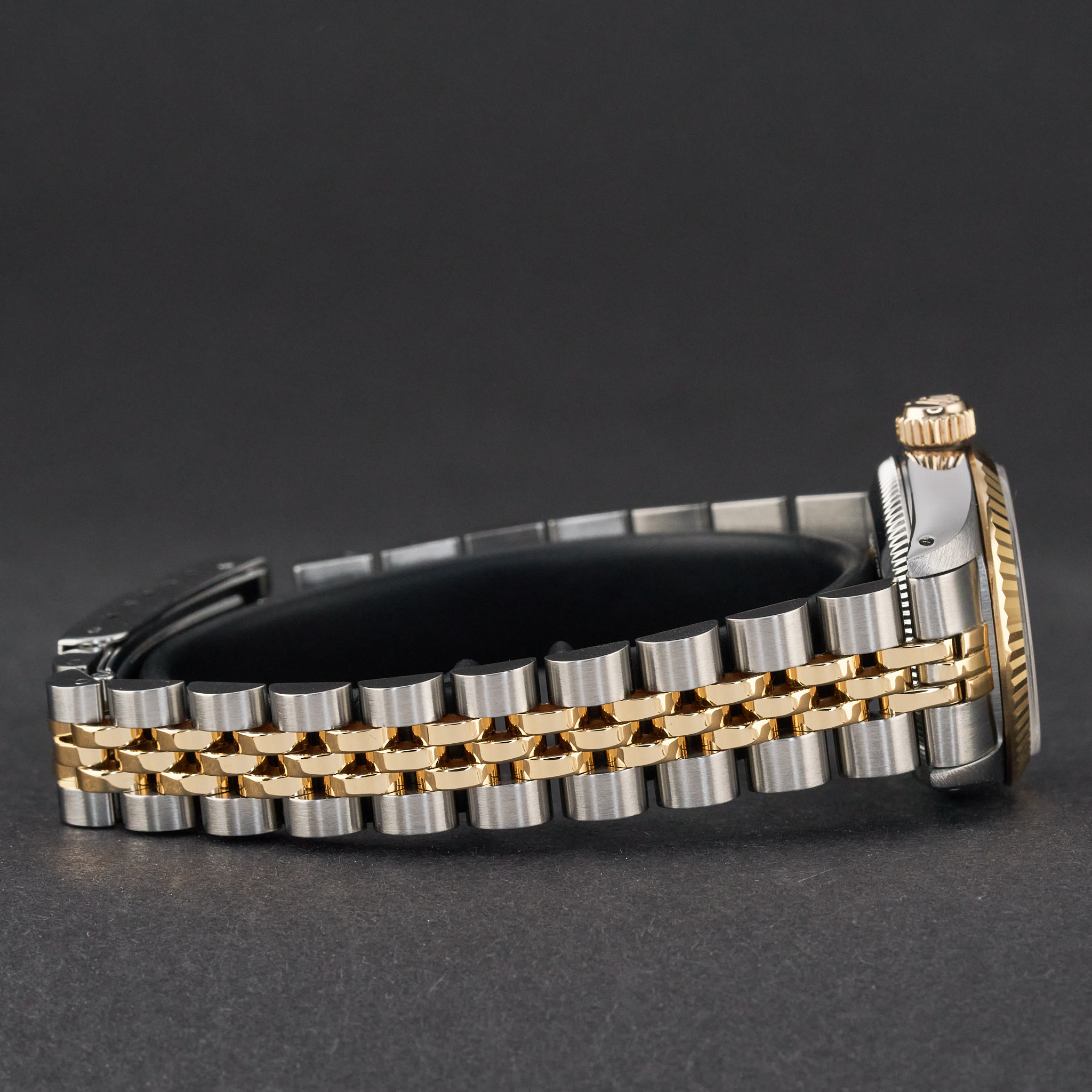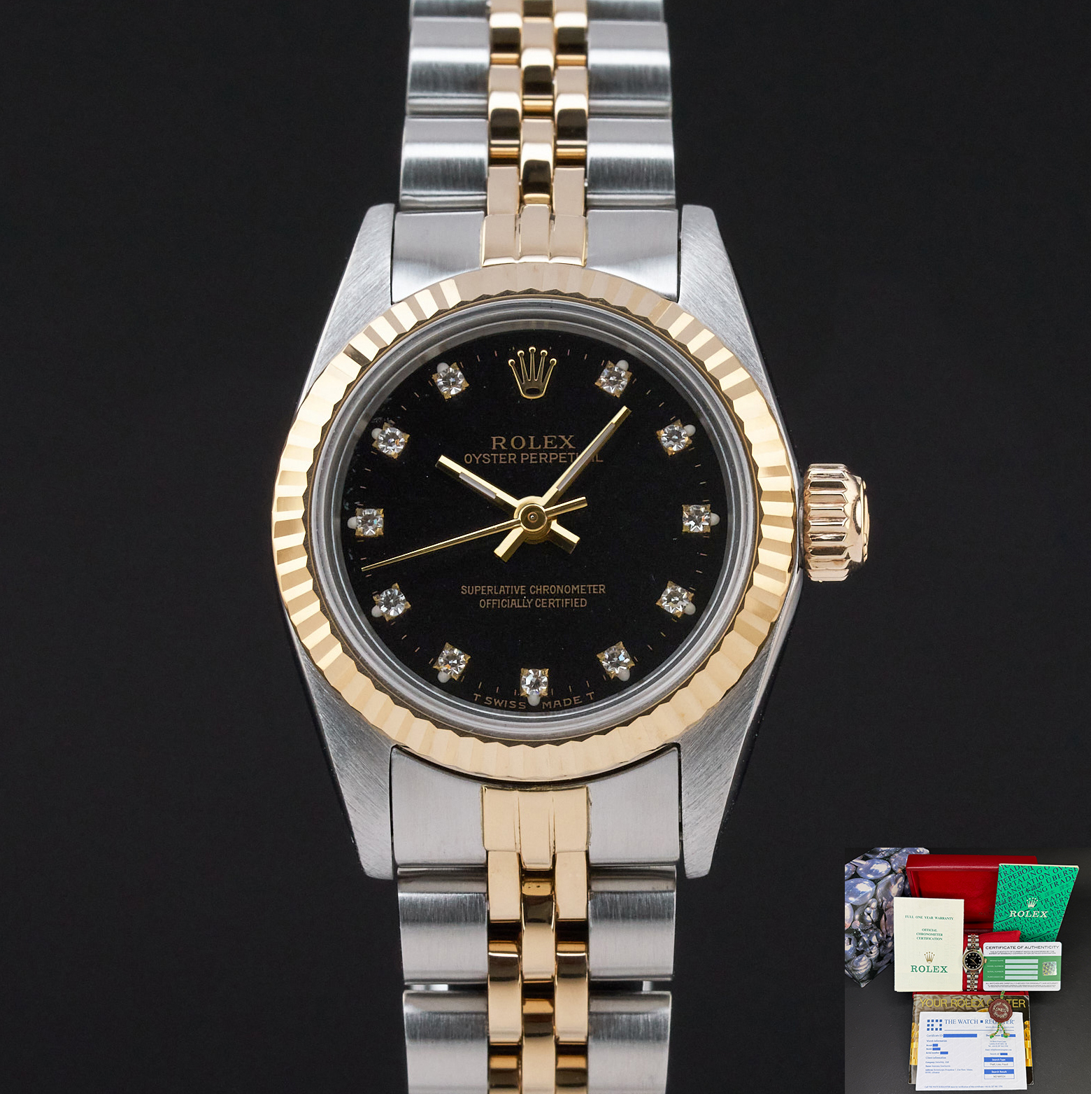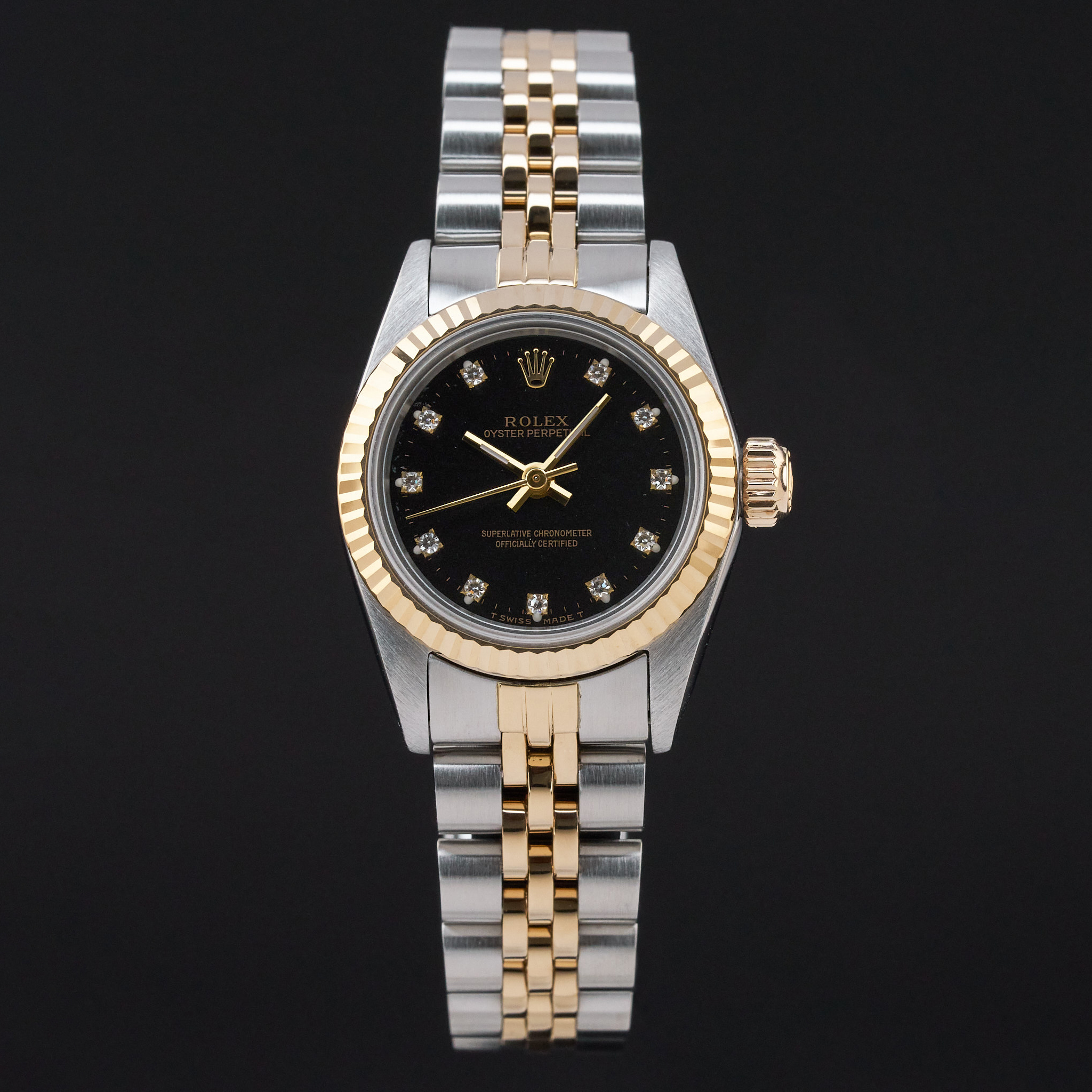 This Rolex Oyster Perpetual Lady 67193 features a Black small diamond dial and is crafted from 18K yellow gold and stainless steel, with a production year of 1990.