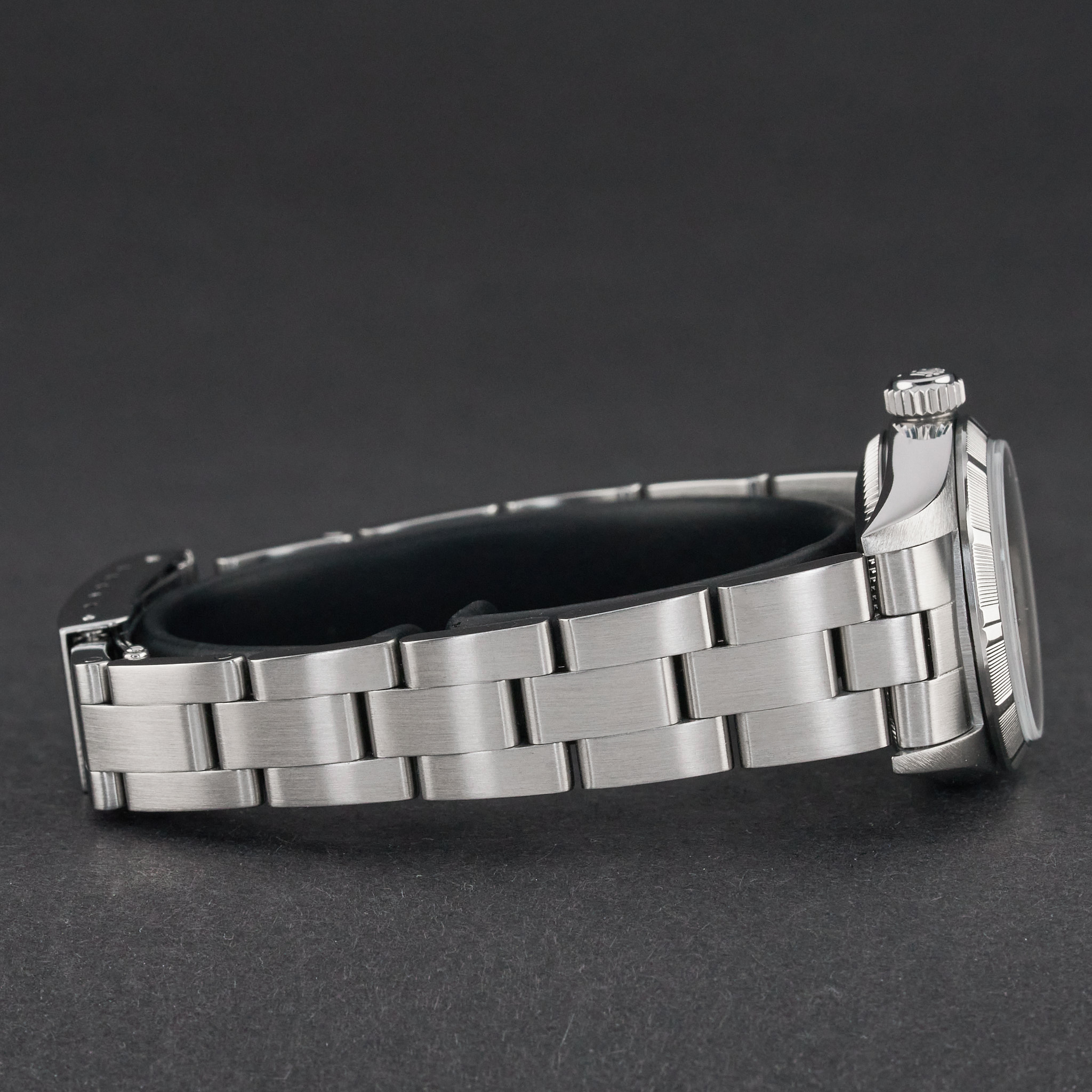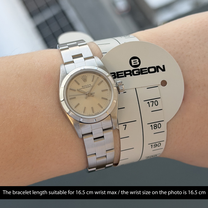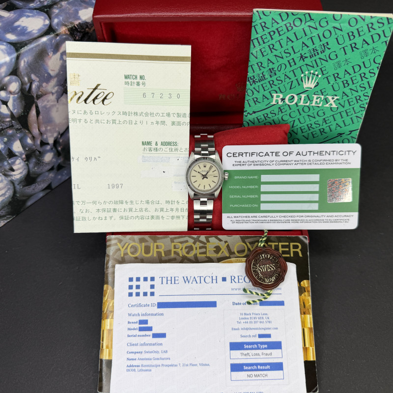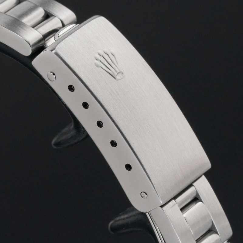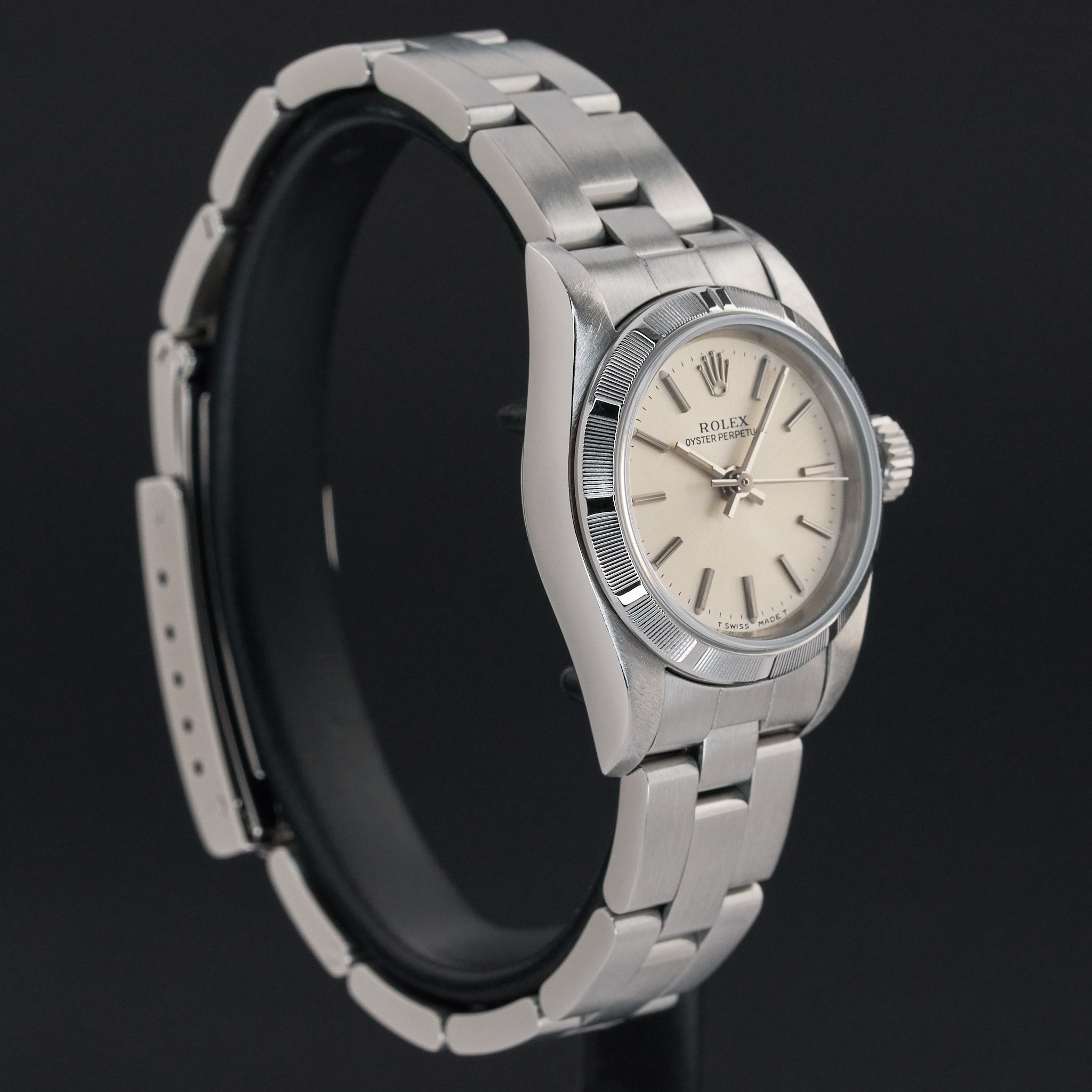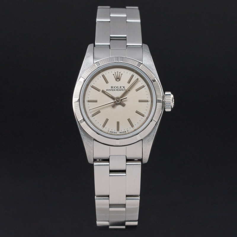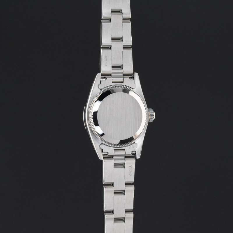 This Rolex Oyster Perpetual Lady 67230 features a Silver dial and is crafted from stainless steel, with a production year of 1996.