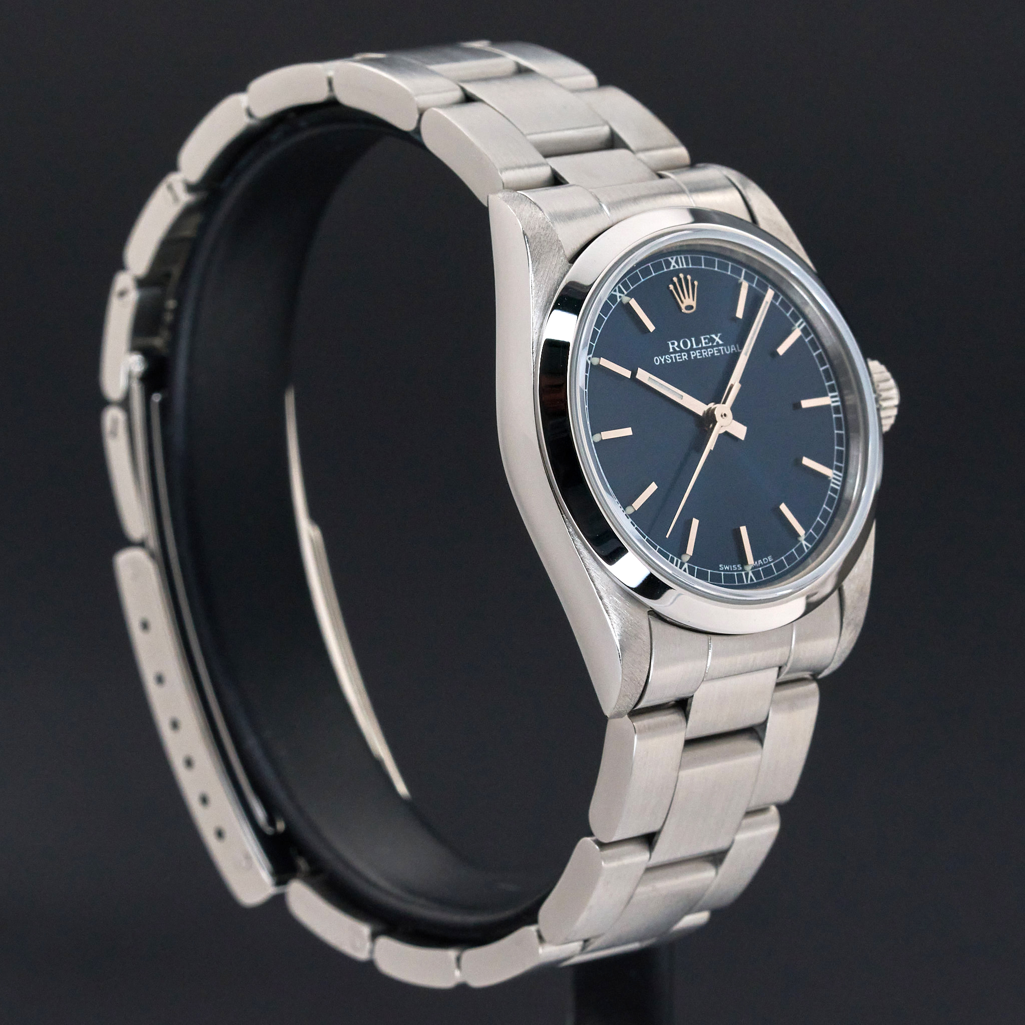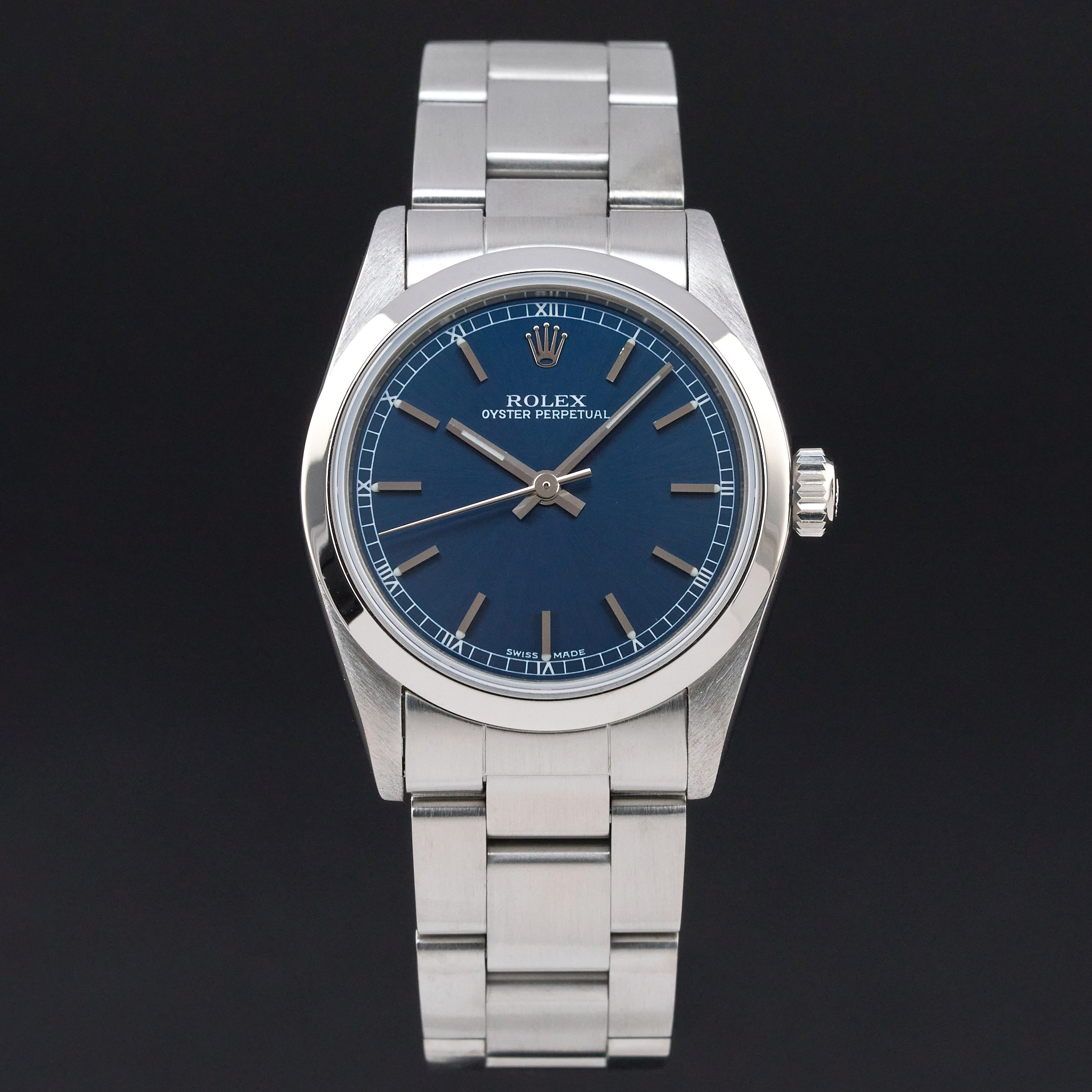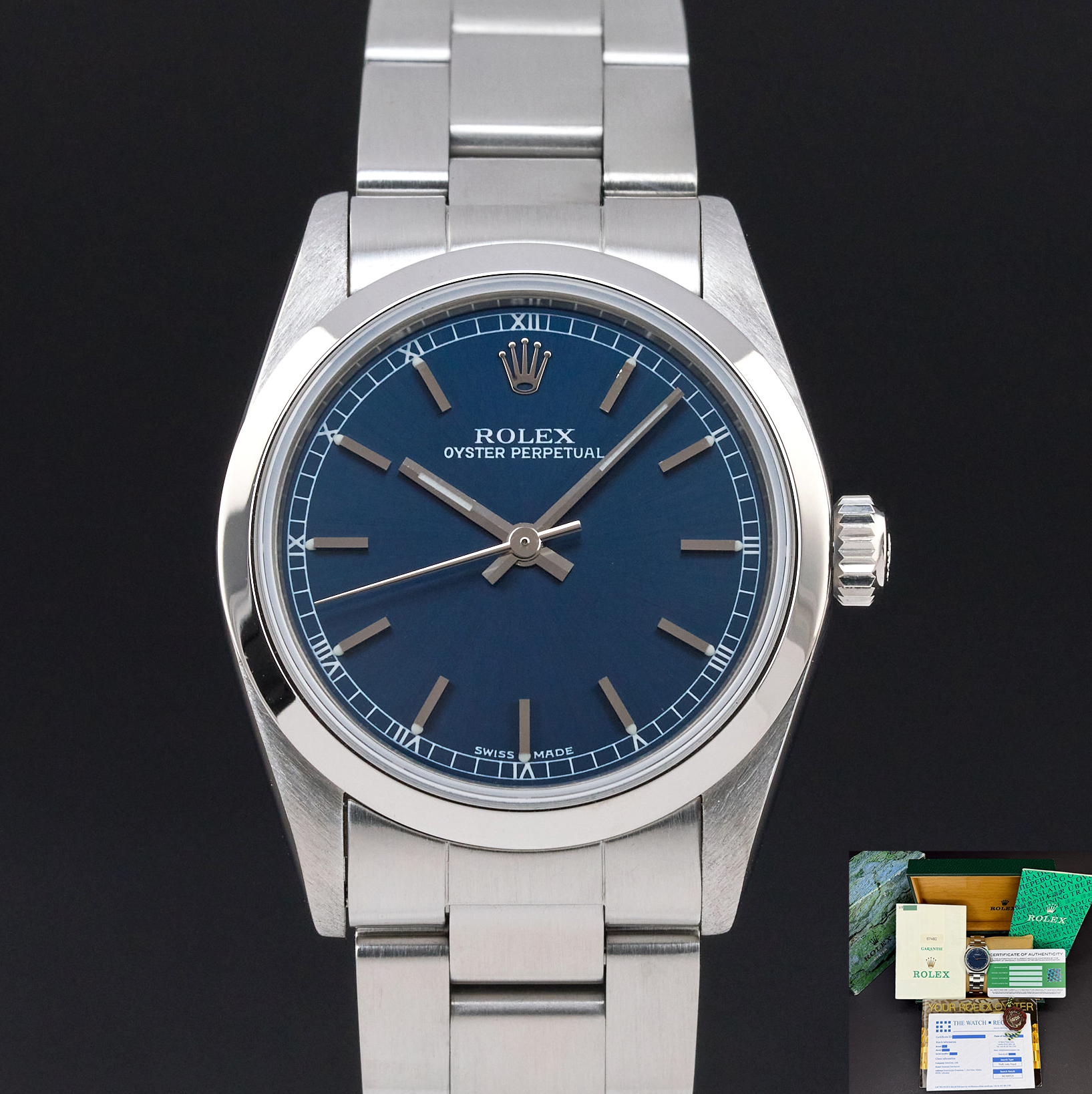 This Rolex Oyster Perpetual Lady 67480 features a Blue dial and is crafted from stainless steel, with a production year of 1998.
