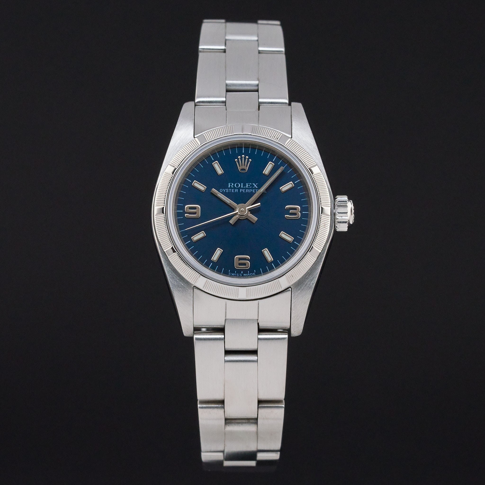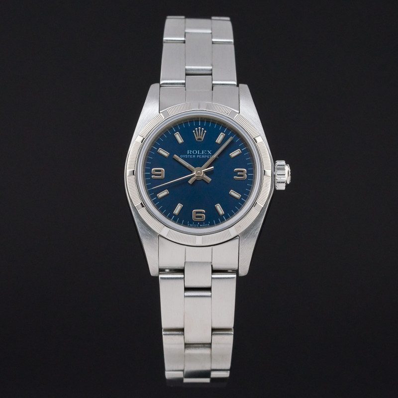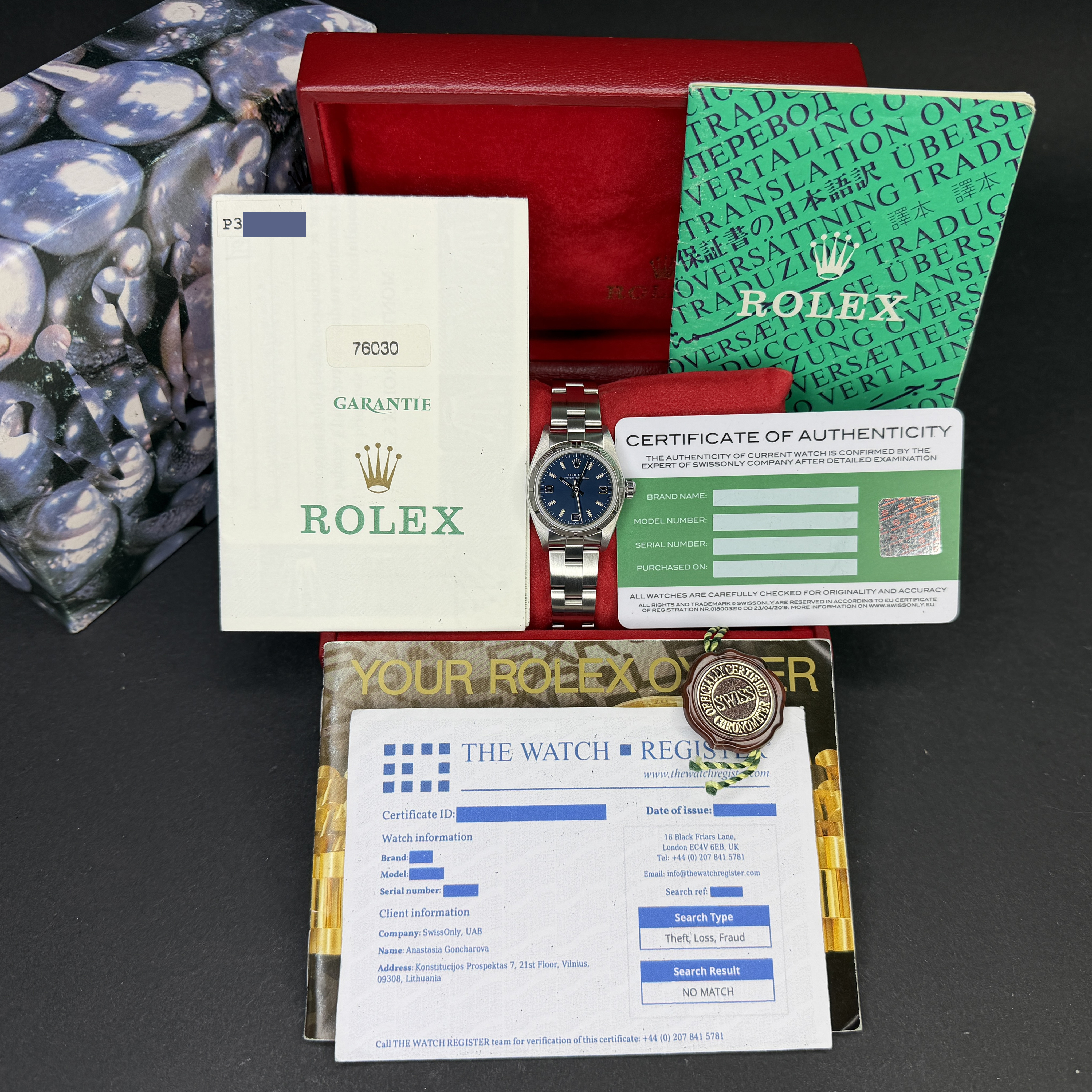This Rolex Oyster Perpetual Lady 76030 features a Blue Arabic dial and is crafted from stainless steel, with a production year of 2000.
