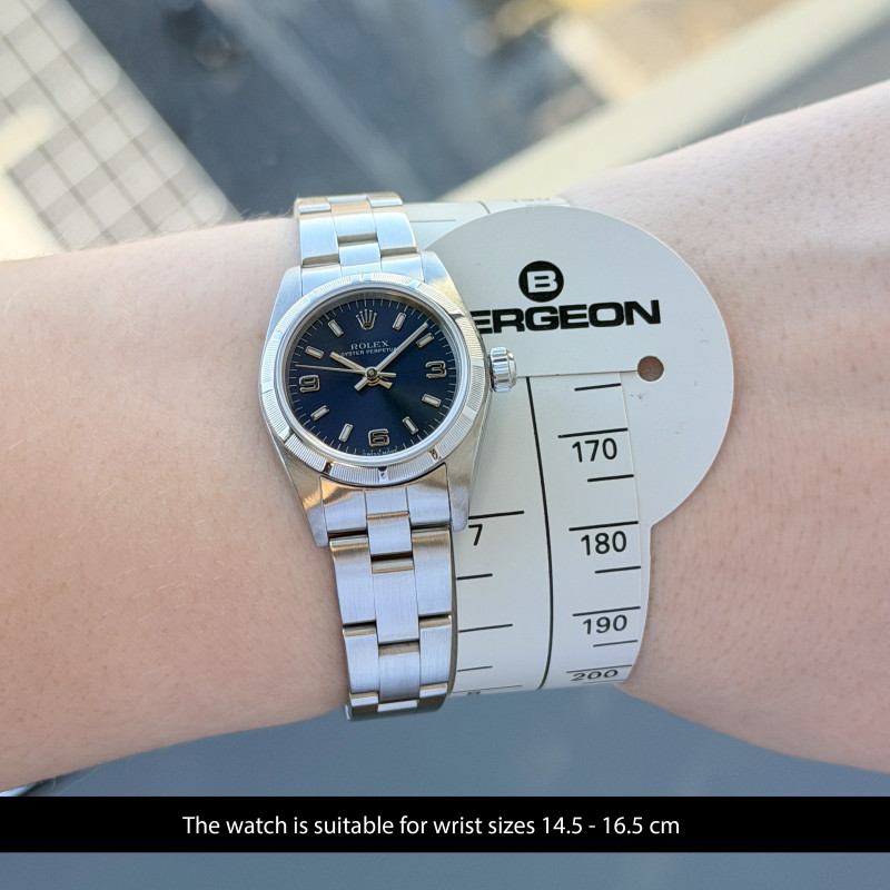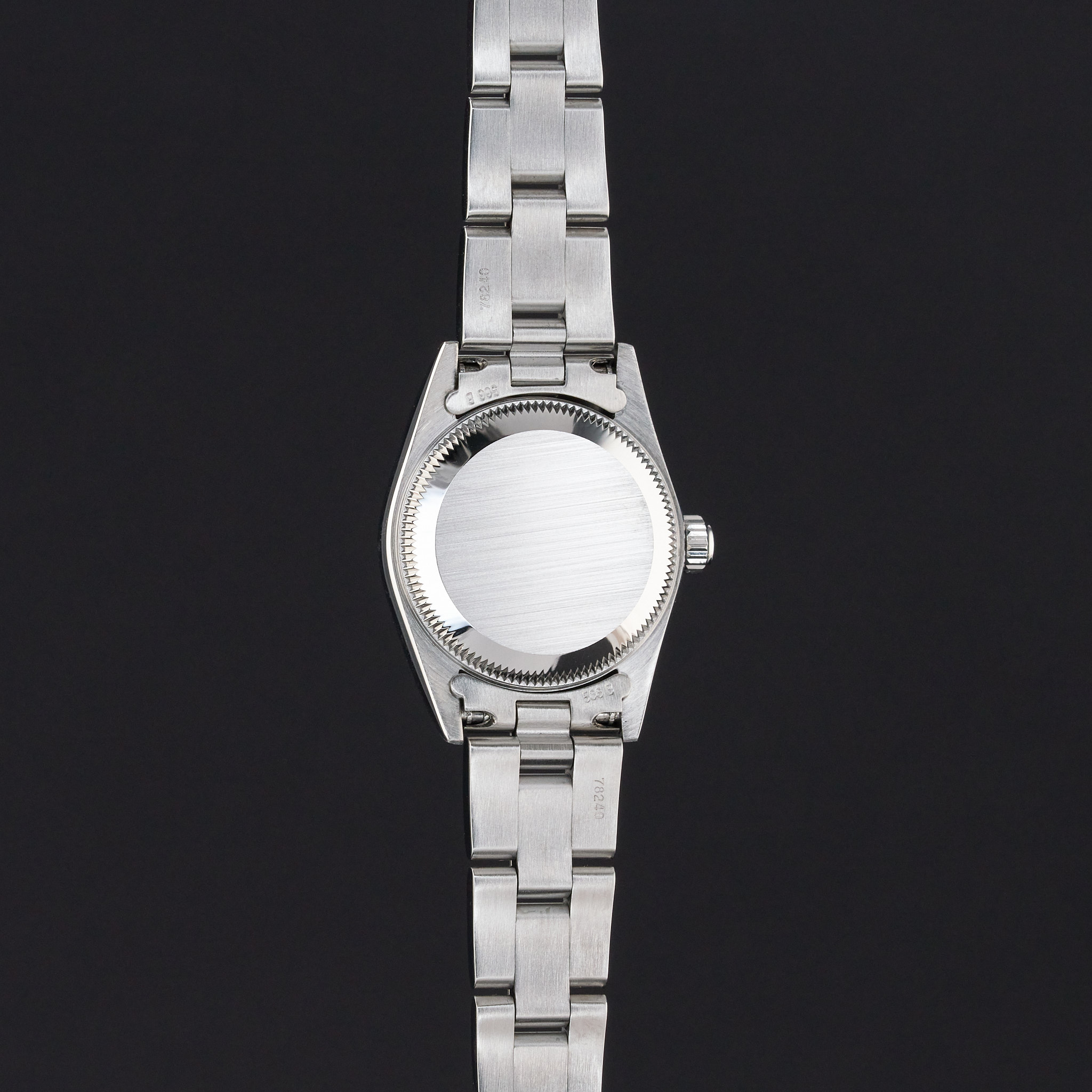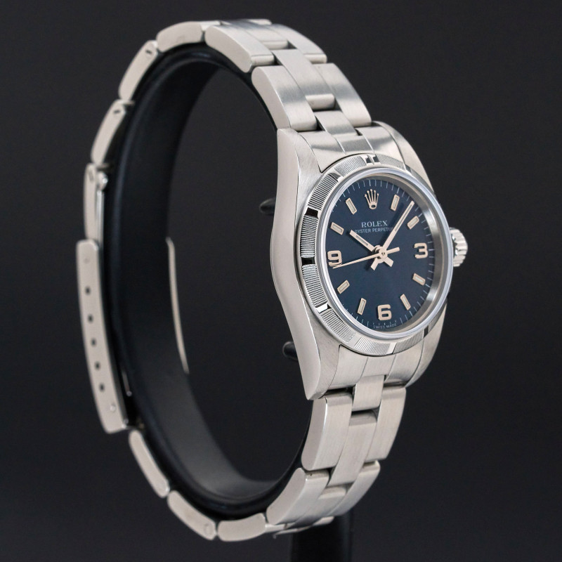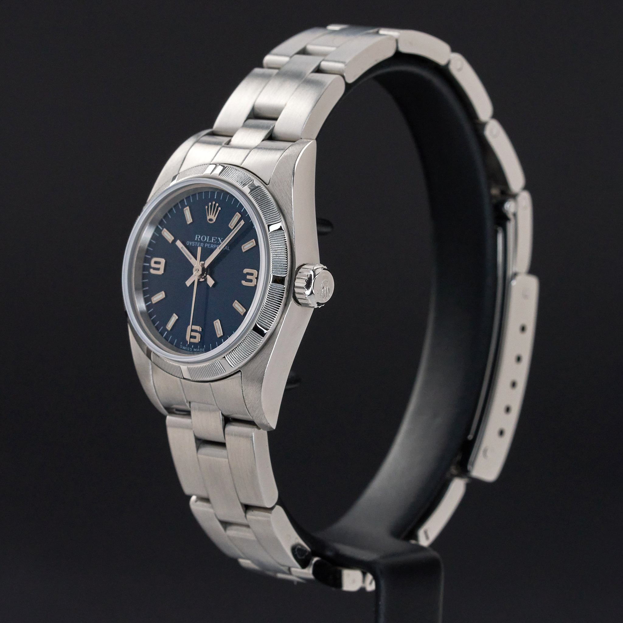 This Rolex Oyster Perpetual Lady 76030 features a Blue Arabic dial and is crafted from stainless steel, with a production year of 2000.