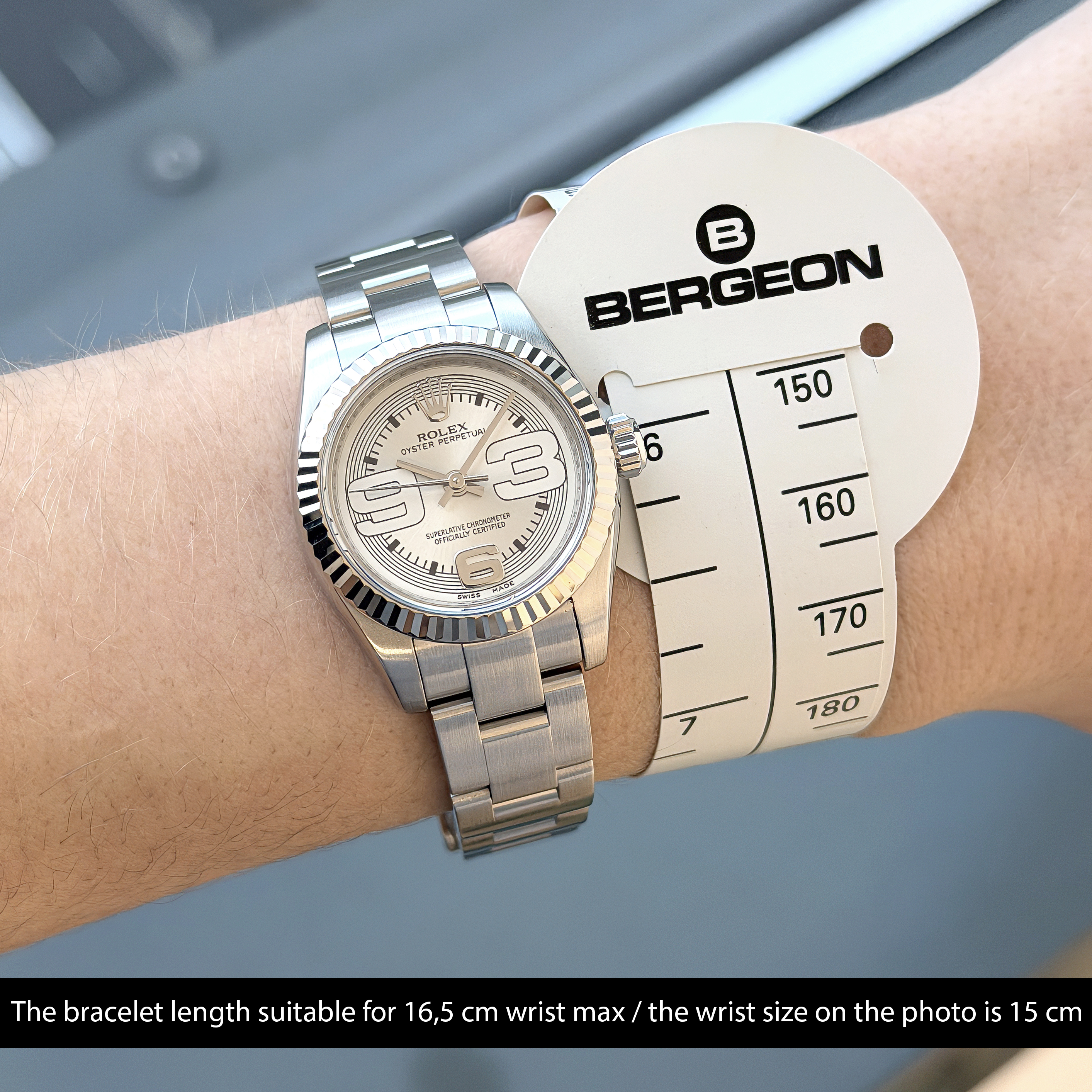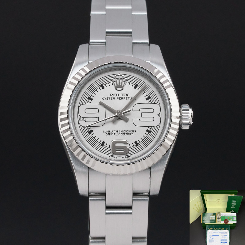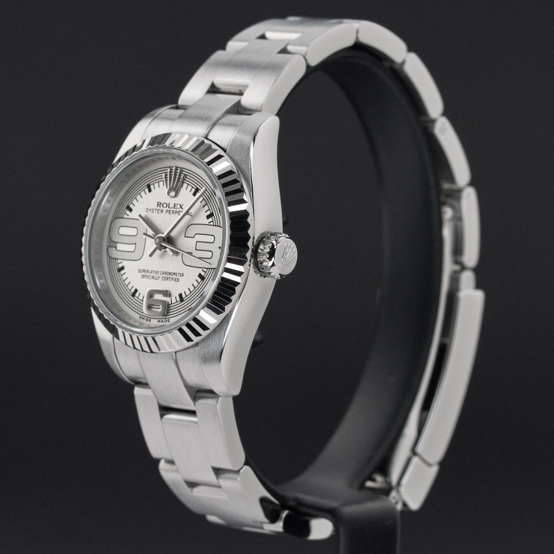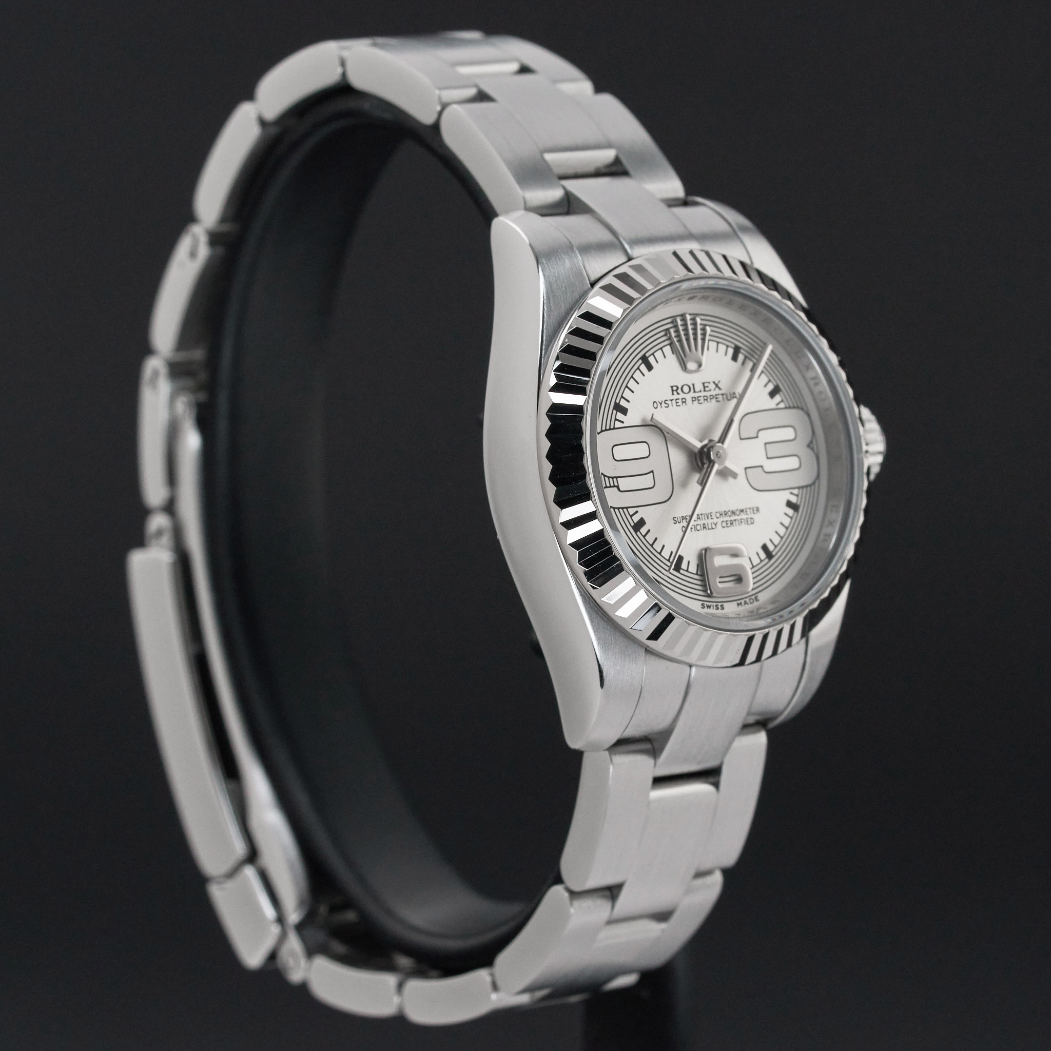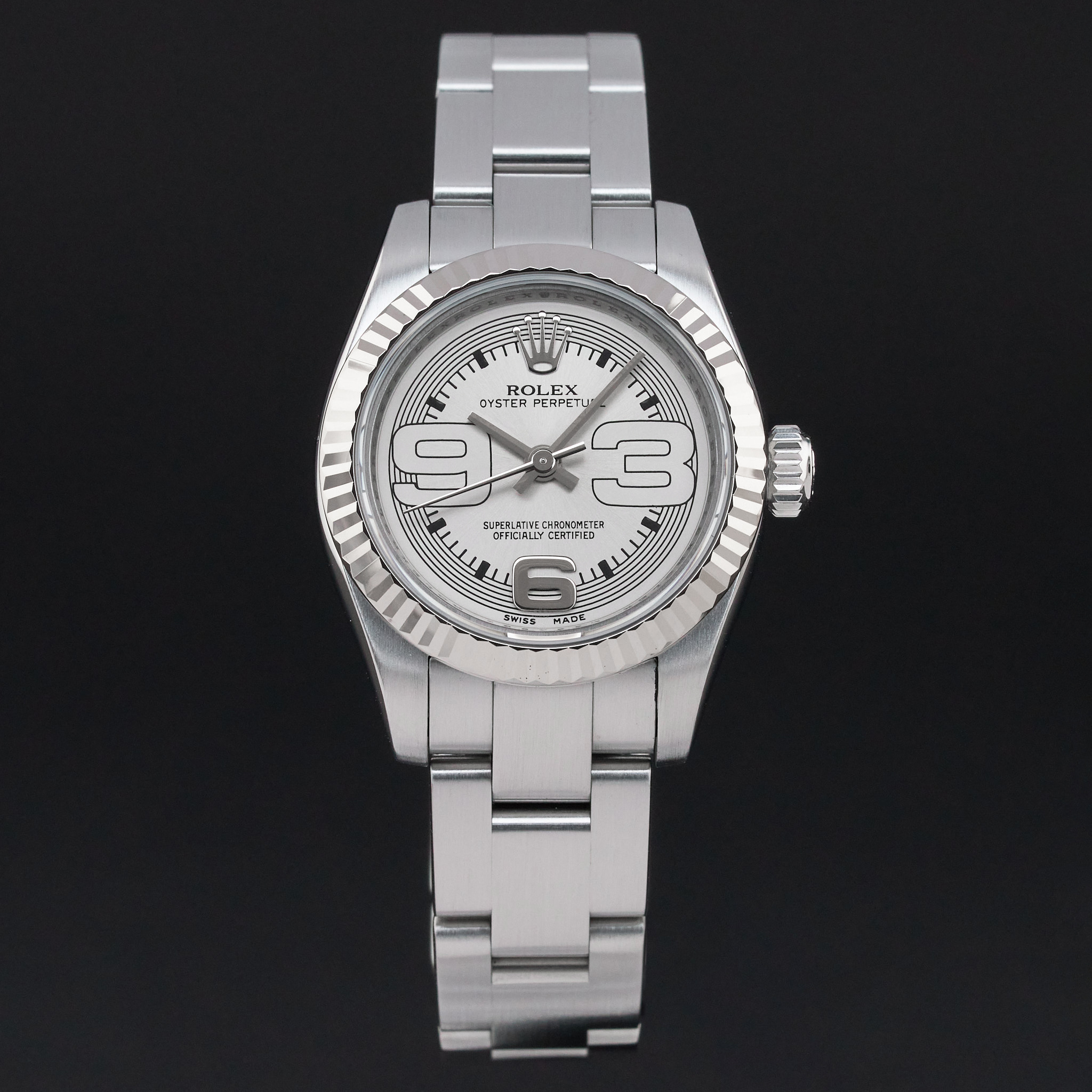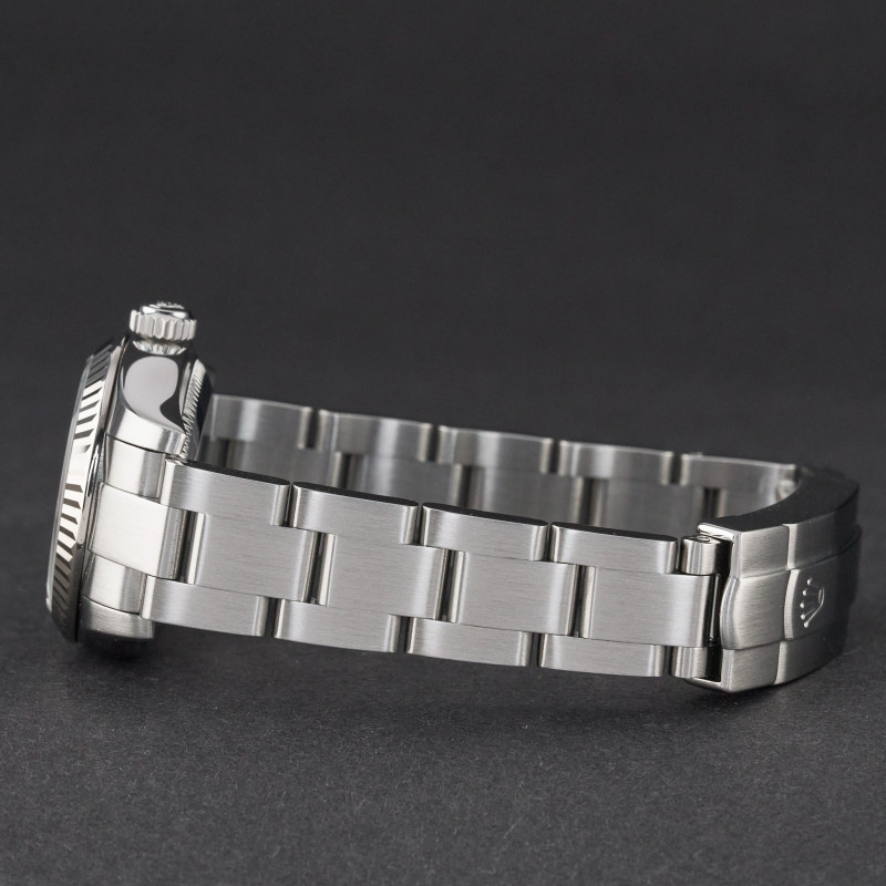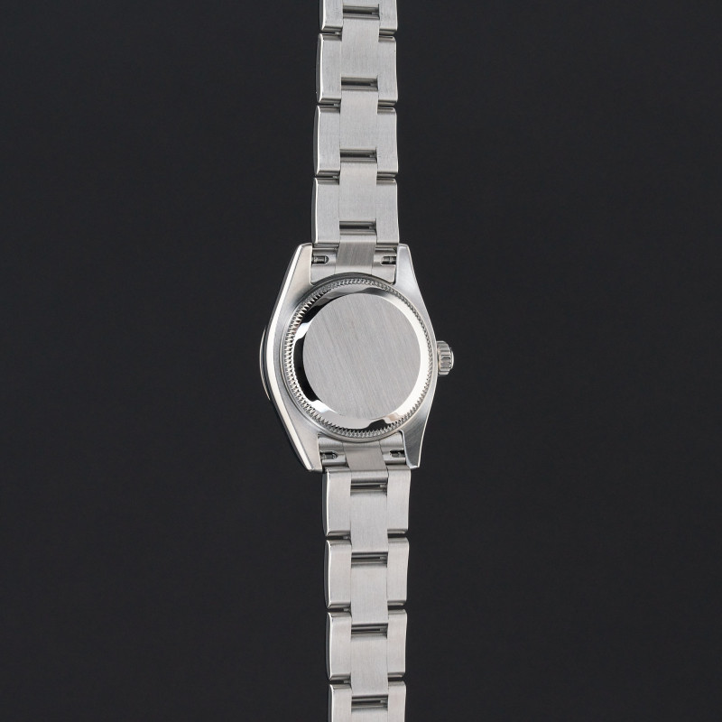 This Rolex Oyster Perpetual Lady 176234 features a Silver Arabic dial and is crafted from stainless steel, with a production year of 2008.