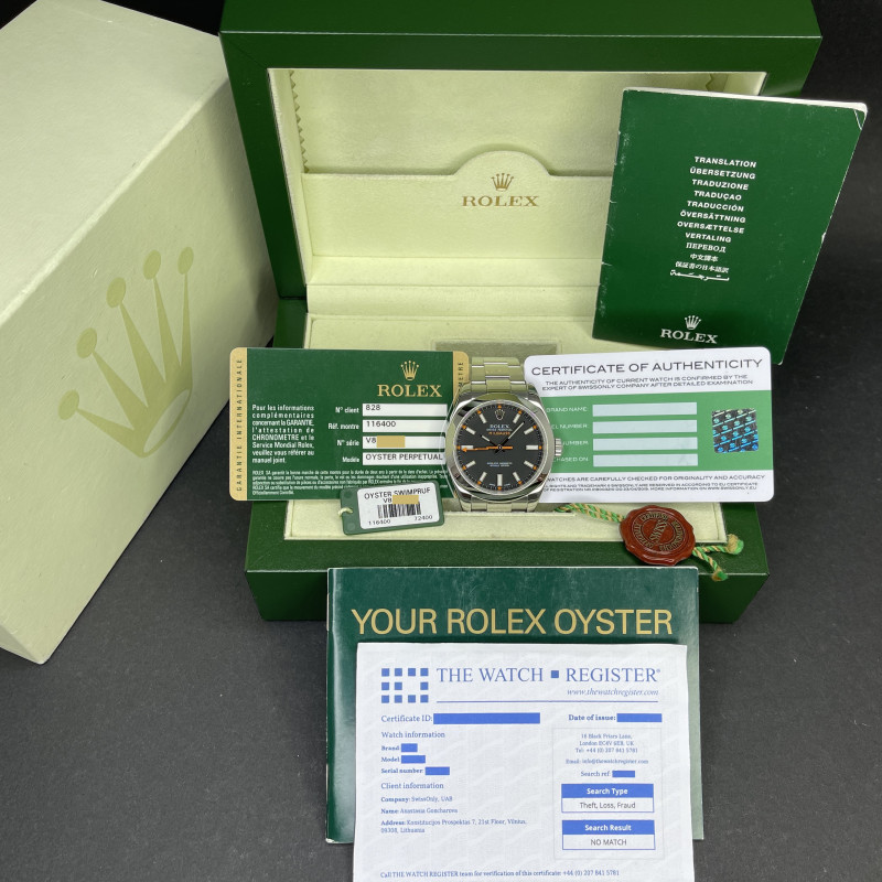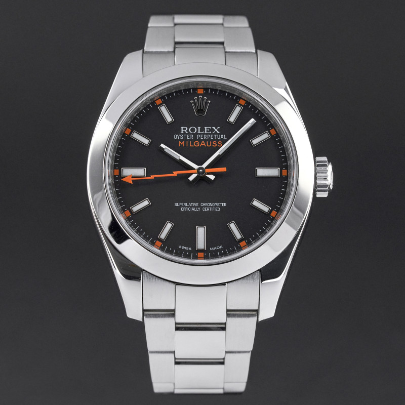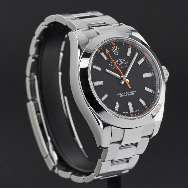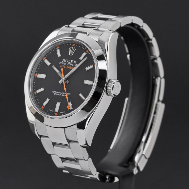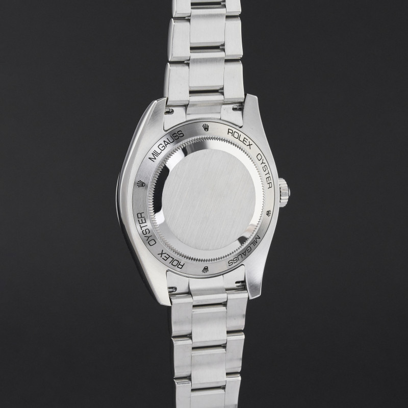 This Rolex Milgauss 116400 features a Black dial and is crafted from from stainless steel, with a production year of 2009.
