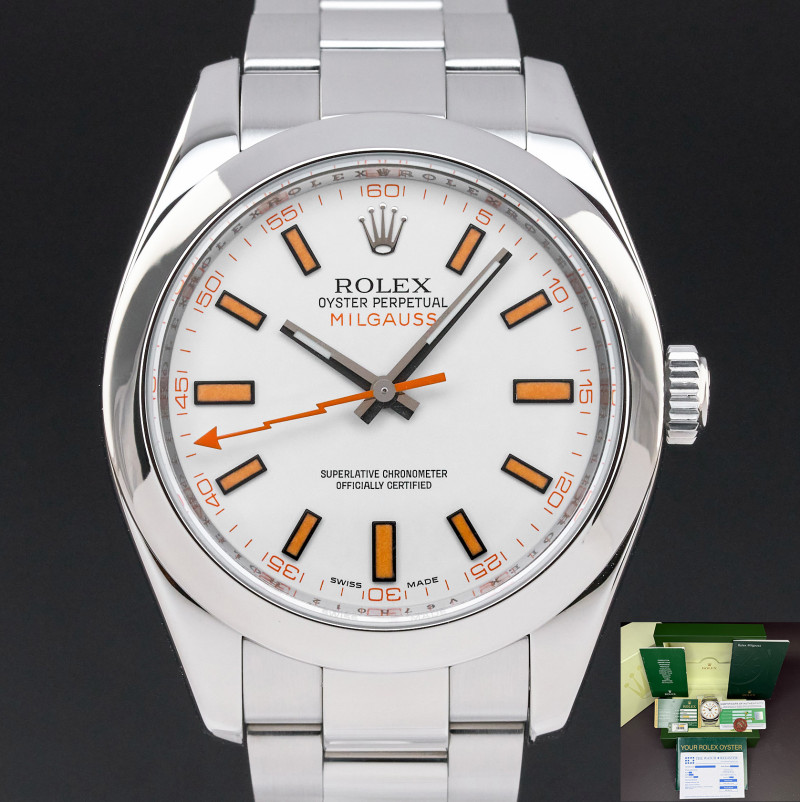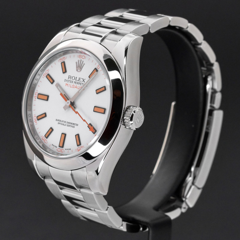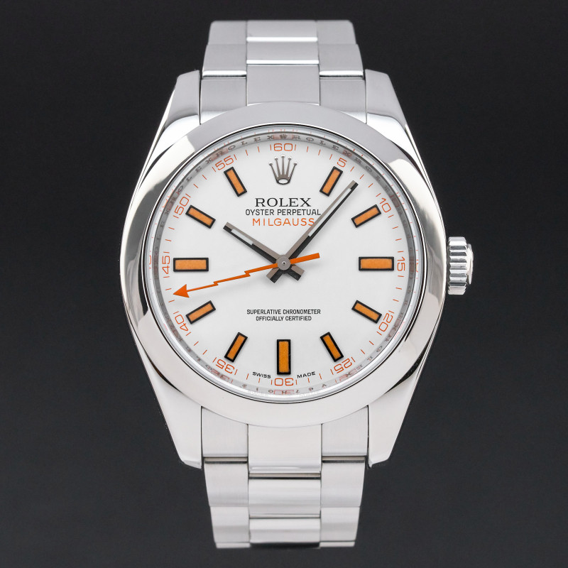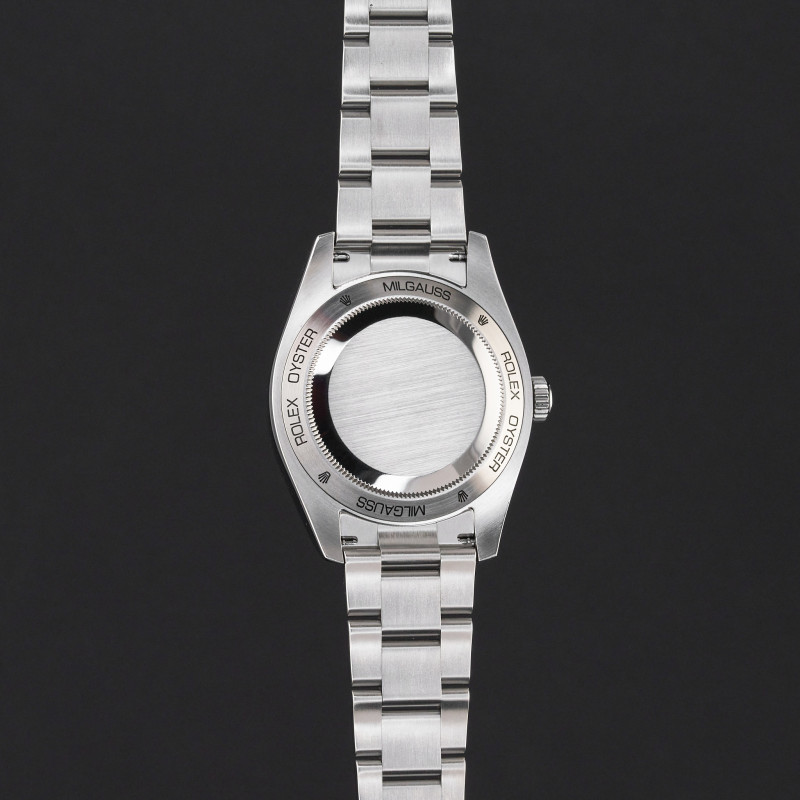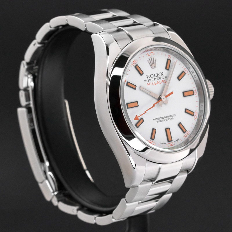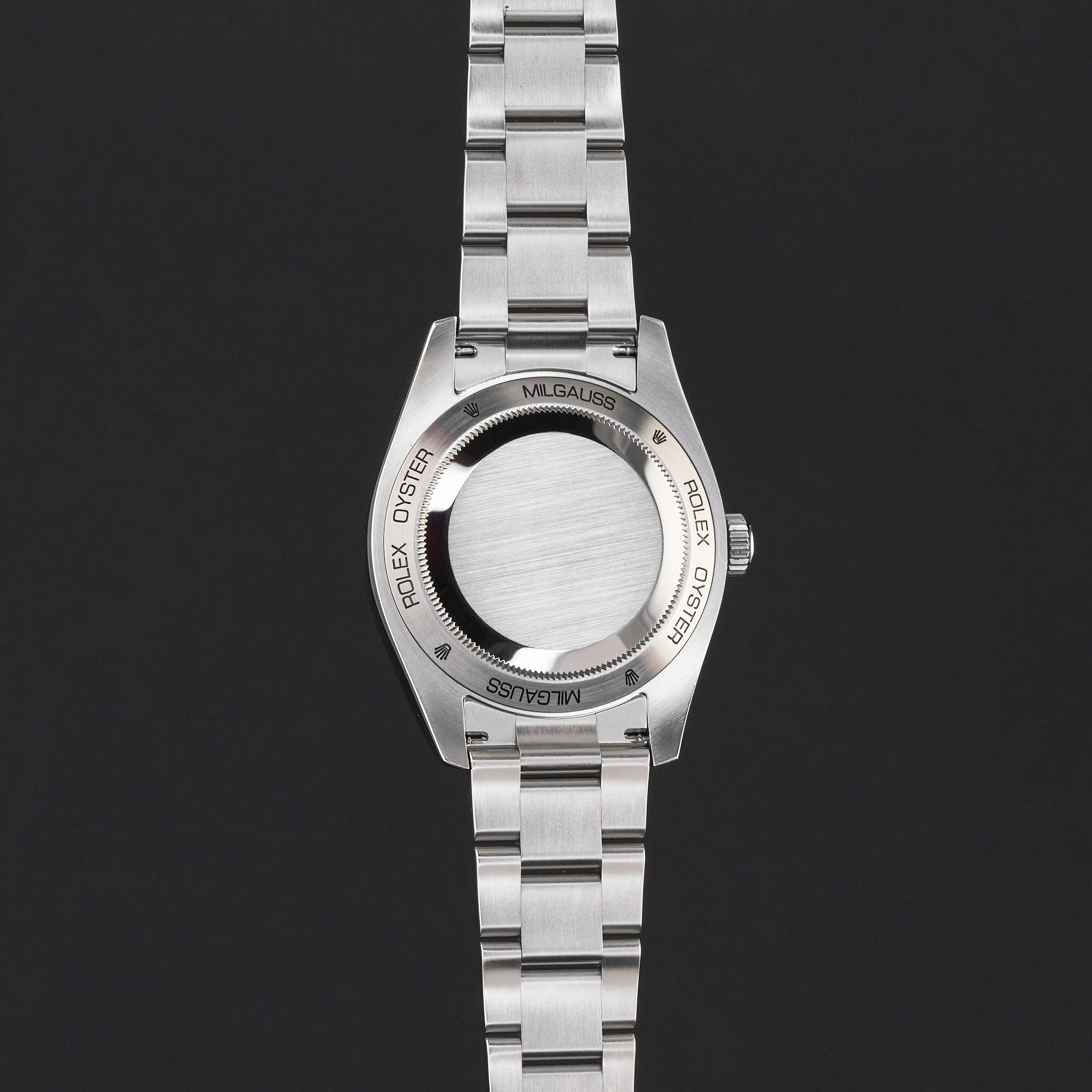 This Rolex Milgauss 116400 features a White dial and is crafted from from stainless steel, with a production year of 2010.
