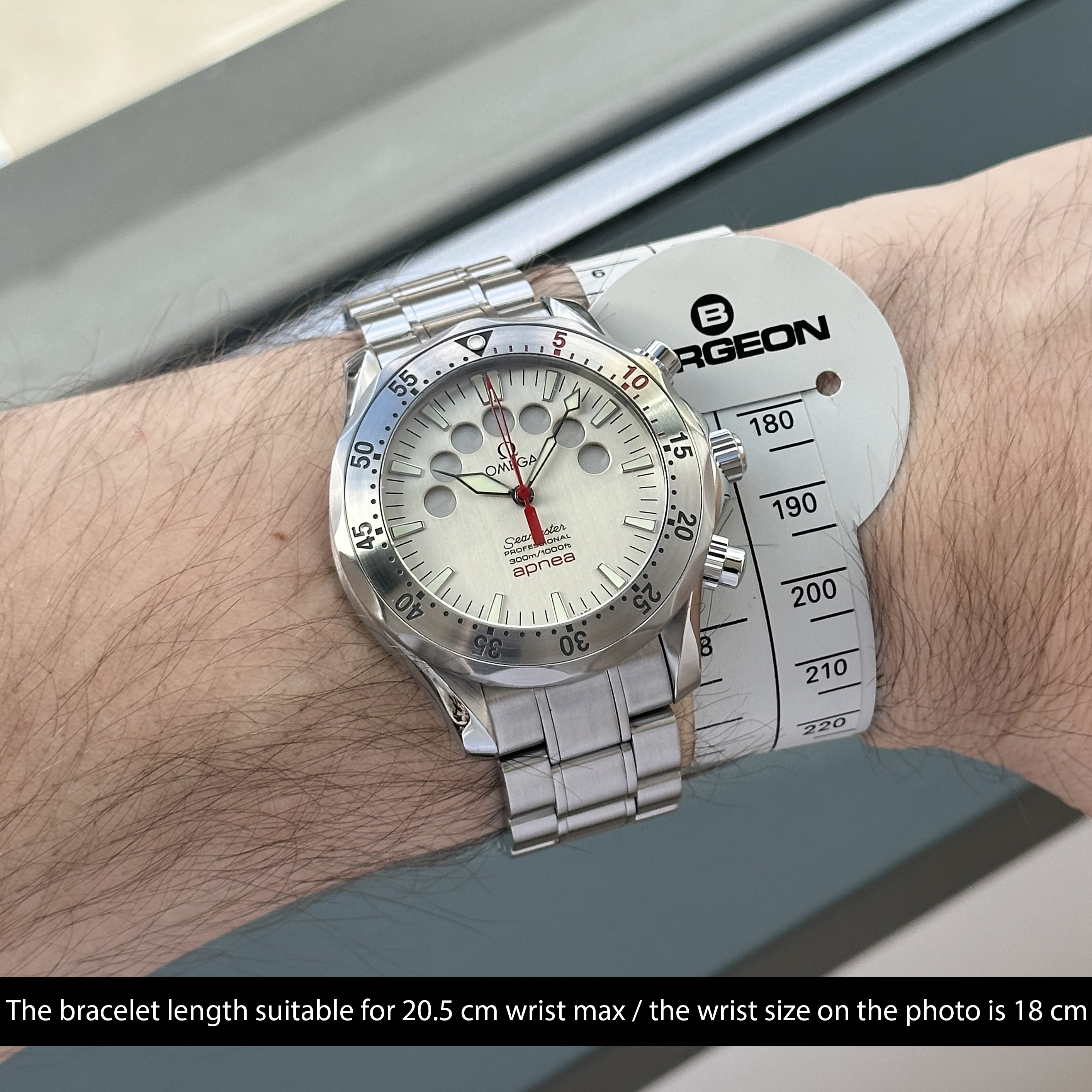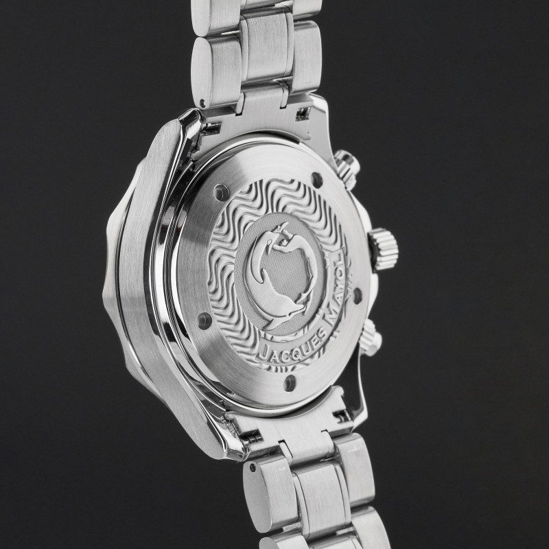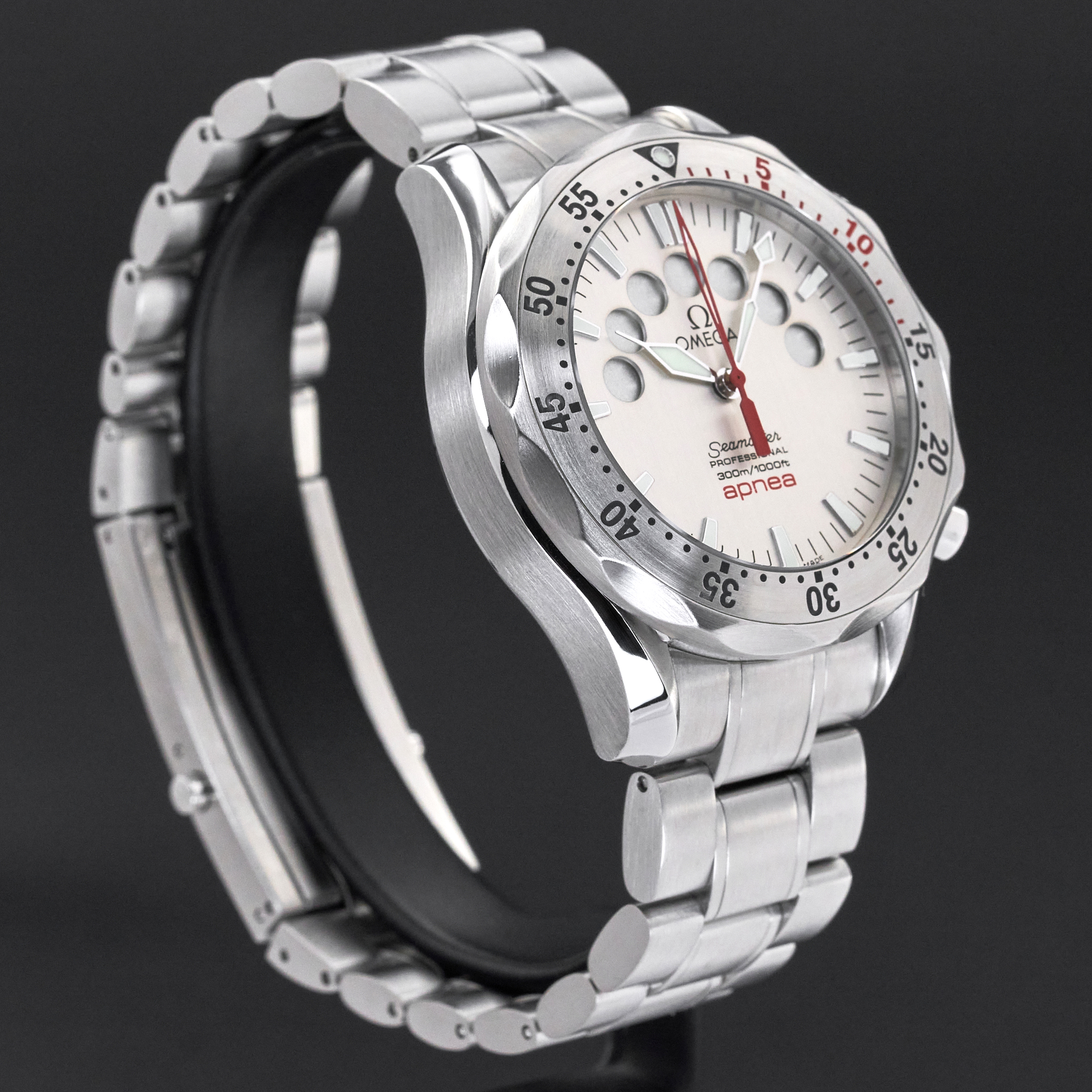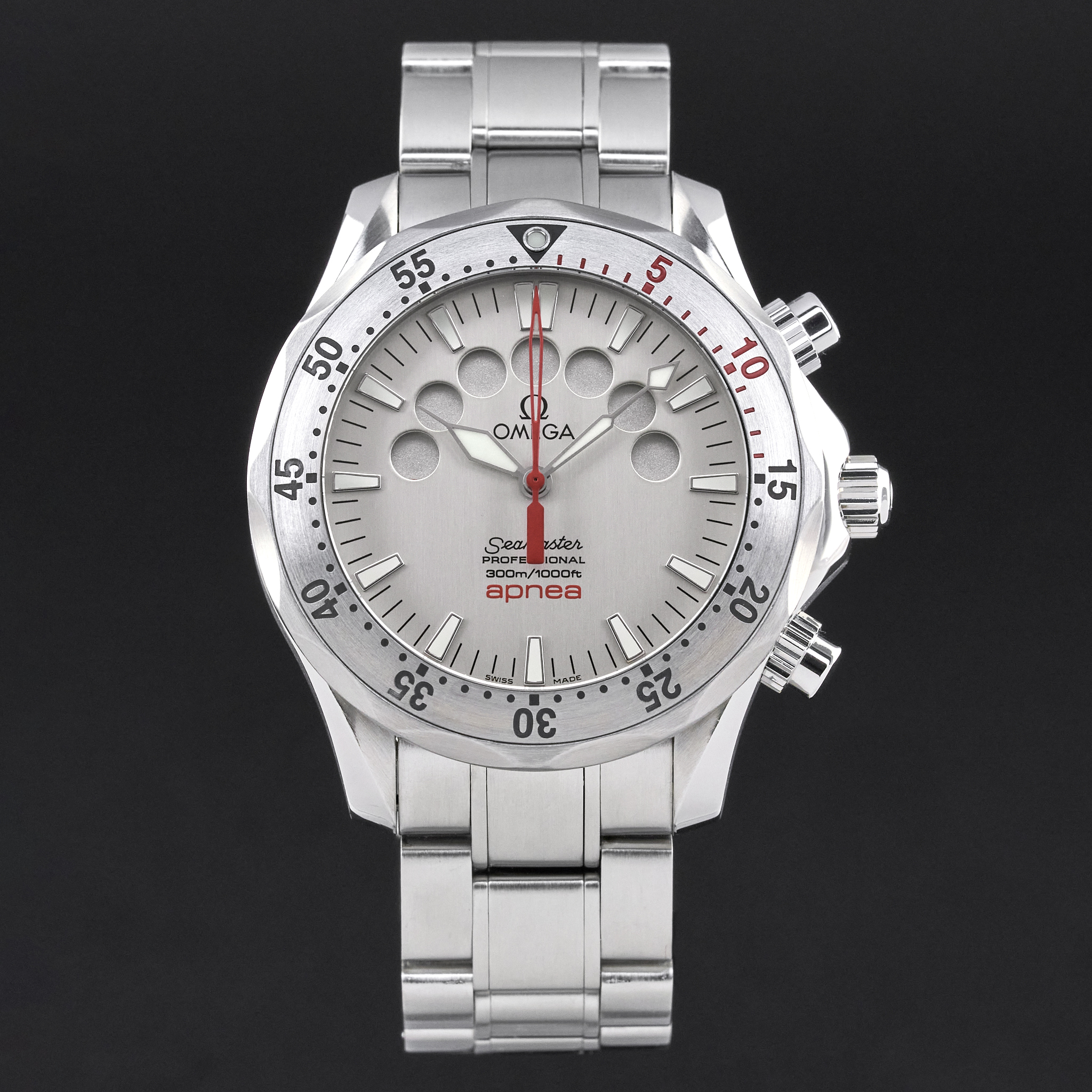 This Omega Seamaster Apnea Jacques Mayol 2595.30.00 features a Silver dial and is crafted from stainless steel, with a production year of 2000.