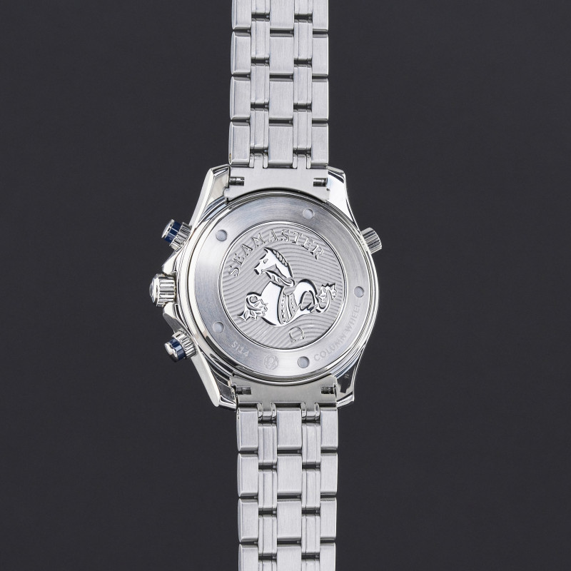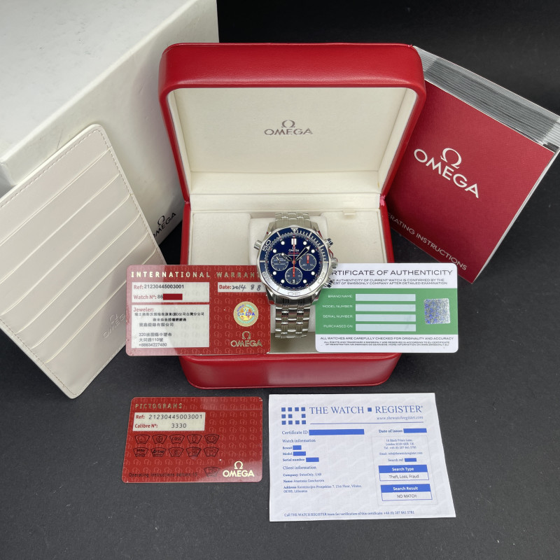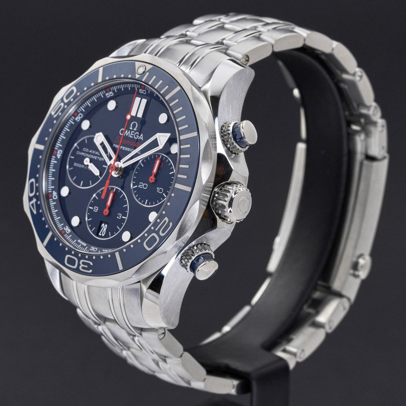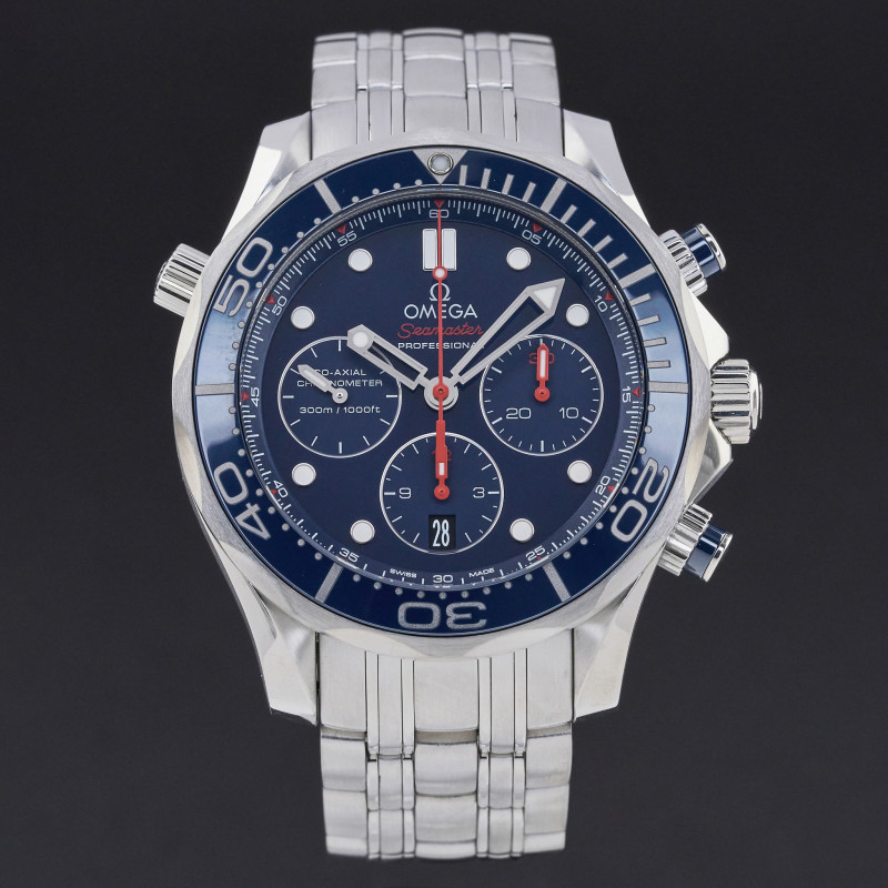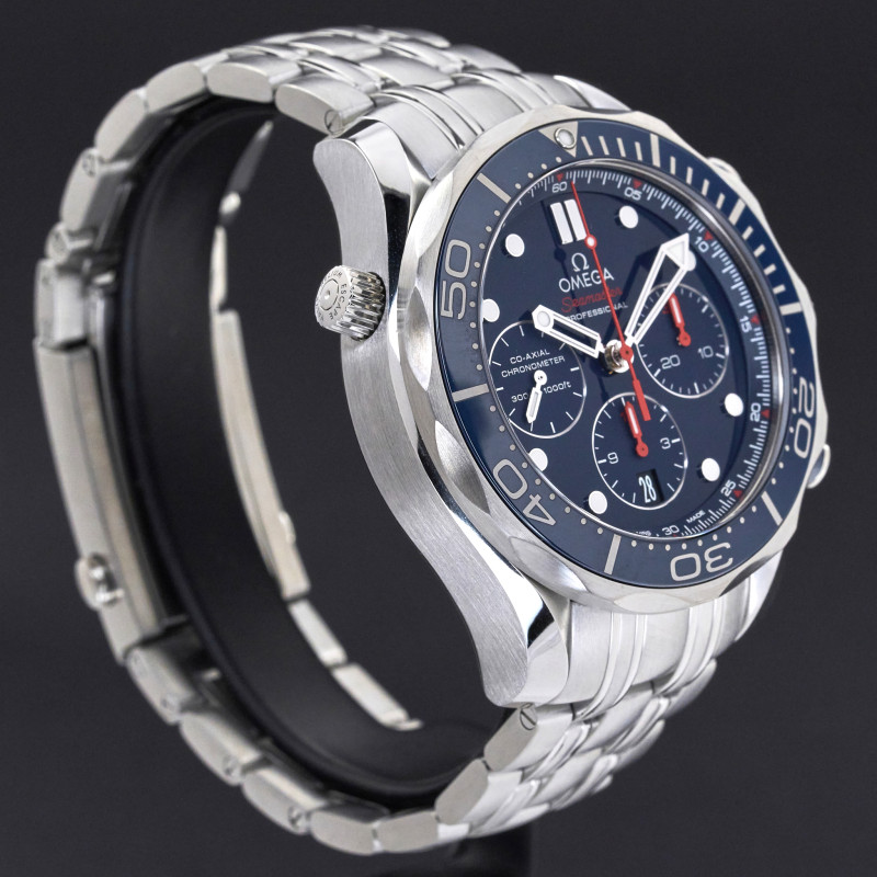 This Omega Seamaster Diver Chronograph 212.30.44.50.03.001 features a Blue dial and is crafted from stainless steel, with a production year of 2014.