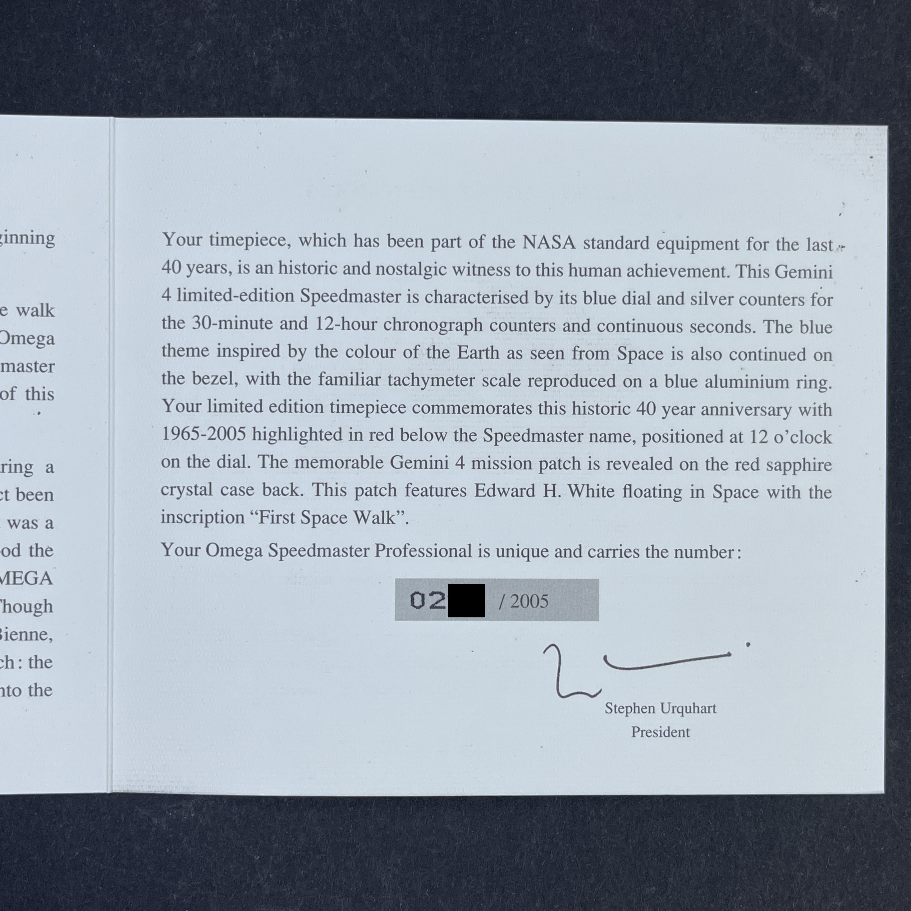 The OMEGA Speedmaster Professional Gemini IV is a prime example of what collectors often refer to as a "sleeper" limited edition. The watch's deep blue dial, paired with silvery-white subdials, gives it a distinctive "blue Panda" appearance, a rare and captivating combination both on the wrist and in the watch world. The Gemini IV mission, which took place from June 3 to June 7, 1965, was the second crewed mission of NASA's Gemini program. It featured astronauts James McDivitt and Edward White and included a 98-hour flight that encompassed 62 orbits around the Earth. Most notably, it marked a historic moment in space exploration: the first American spacewalk, performed by Edward White. This spacewalk also marked the first time an OMEGA Speedmaster ventured outside a spacecraft, strapped securely to White's wrist. Unlike other Speedmaster models that feature the famous "The First Watch Worn on the Moon" engraving, this Gemini IV 40th Anniversary Limited Edition has a sapphire caseback that proudly displays the mission patch, symbolizing the historic first American spacewalk. Interestingly, the tradition of astronauts designing mission patches began with the Gemini V mission, making the inclusion of the Gemini IV patch a meaningful nod to this early era of space exploration. Inside the watch, the calibre 1861 powers the timepiece, an evolution of the calibre 861 used in previous Moonwatch models. For this upgrade, the movement was enhanced with corrosion-resistant rhodium plating, ensuring greater longevity and durability. This limited edition Speedmaster was produced in only 2,005 pieces, a number that mirrors the year of its release. The watch’s blue dial, matching blue bezel, and the Gemini IV patch on the caseback make it not just a timepiece, but a celebration of a milestone in human space exploration. Today, the Speedmaster Professional Gemini IV is cherished by collectors and enthusiasts alike, a testament to its enduring appeal and the rich history it represents.