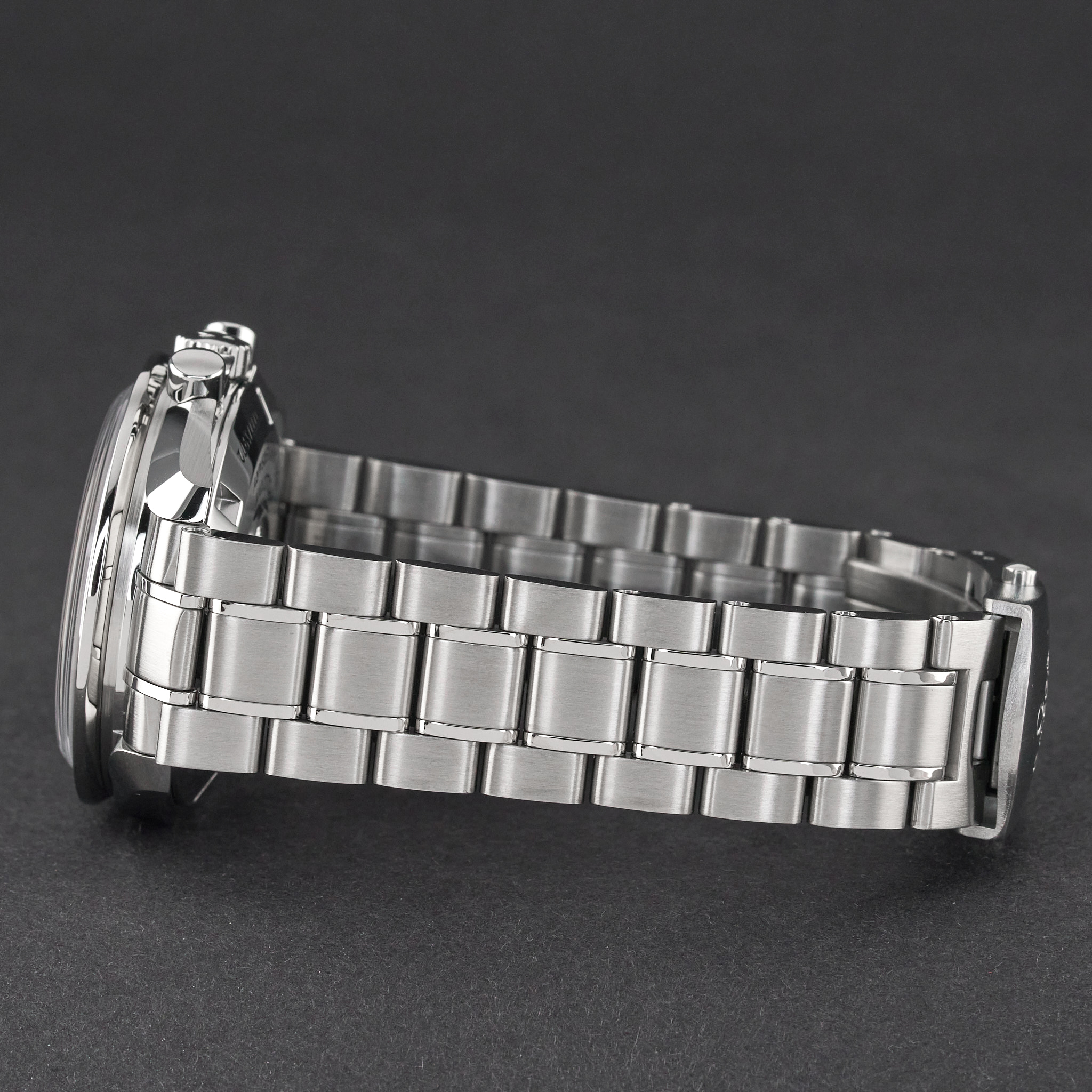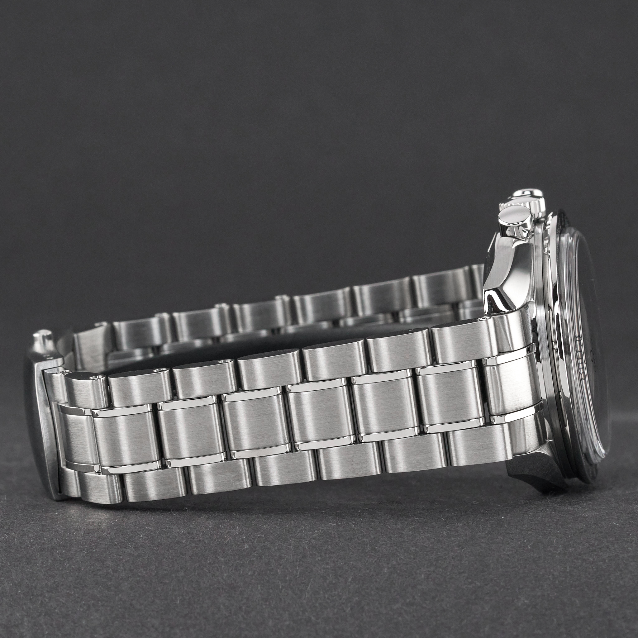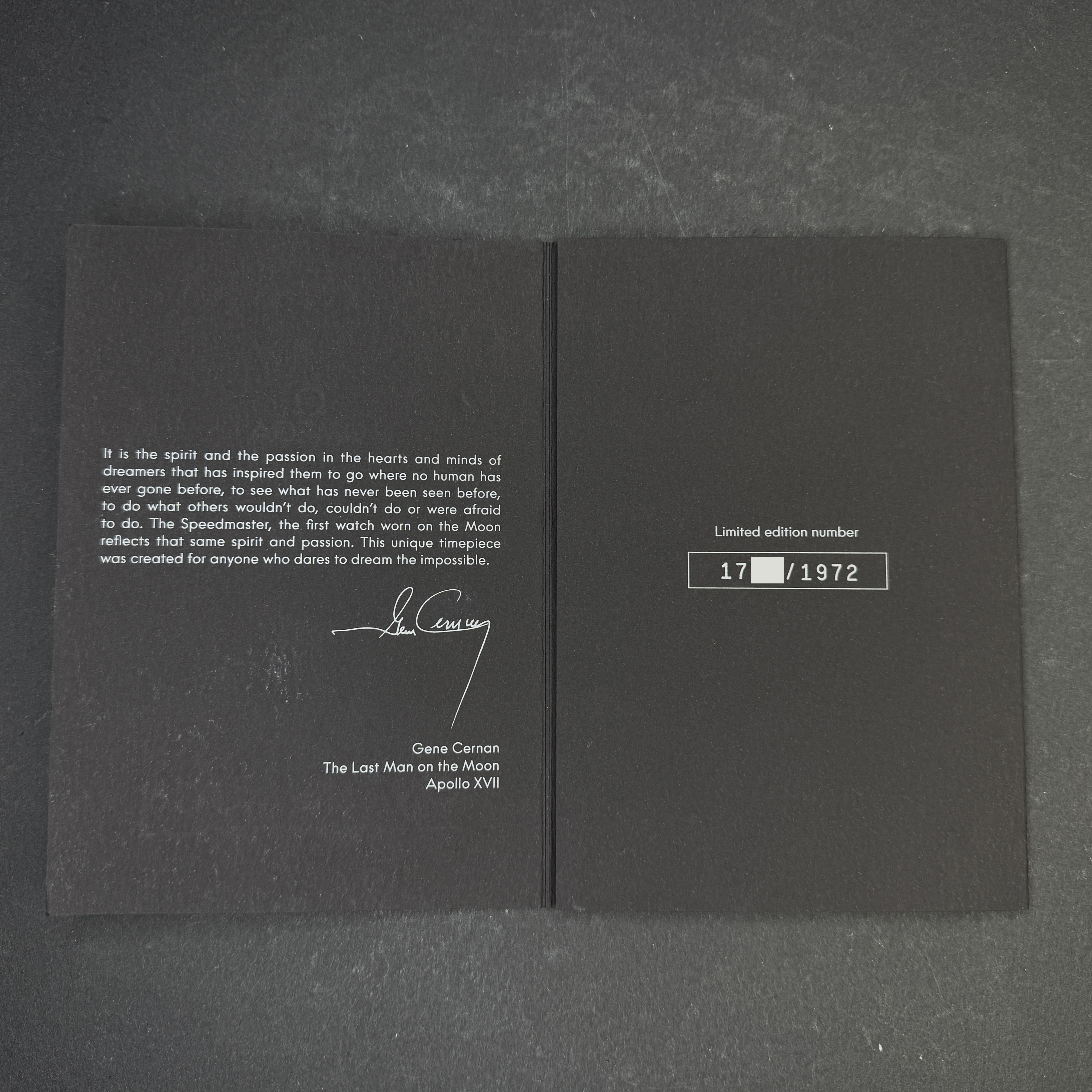 The Omega Speedmaster Professional Moonwatch Apollo XVII Limited Edition is a limited edition released in 2012 to commemorate the 40th anniversary of the final Apollo 17 lunar mission, with only 1 972 pieces made. The unique silver dial, resembling a medal, is adorned with the mission emblem at the 9 o'clock position, giving the watch an exceptional and memorable look. The case back is engraved with a tribute to the last man on the Moon, Eugene Cernan, highlighting the historical significance of the model. Our piece is the only one, in our opinion, that has remained new and unworn since its release in 2012. This is a true rarity, perfect for collectors who appreciate unique, unworn timepieces with a space legacy.