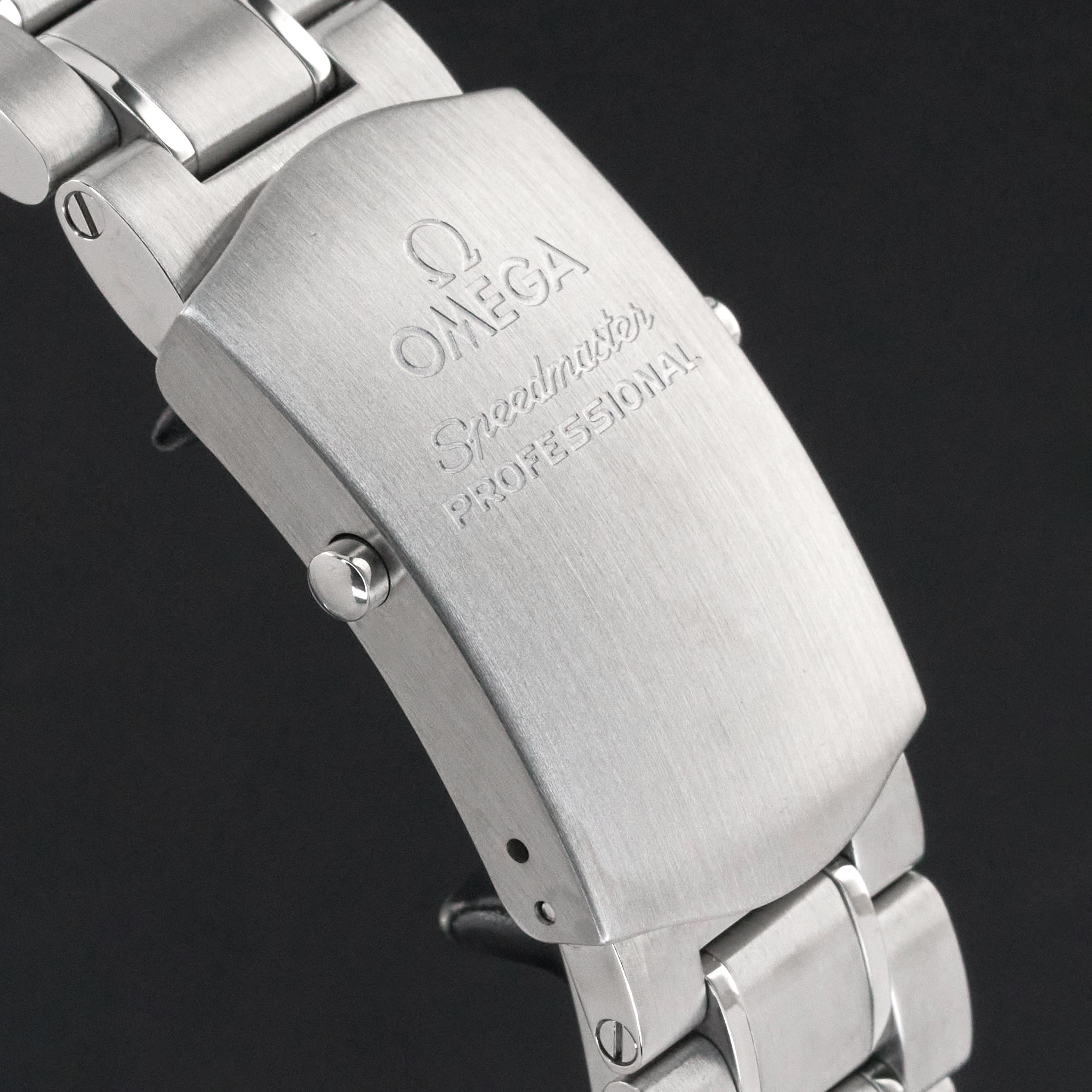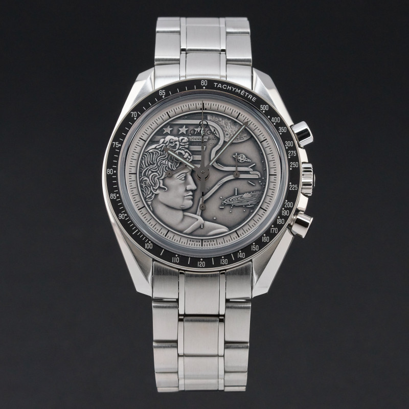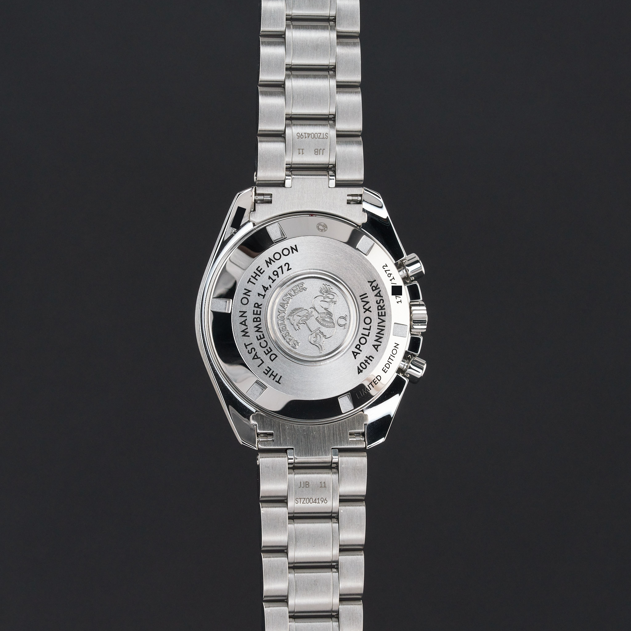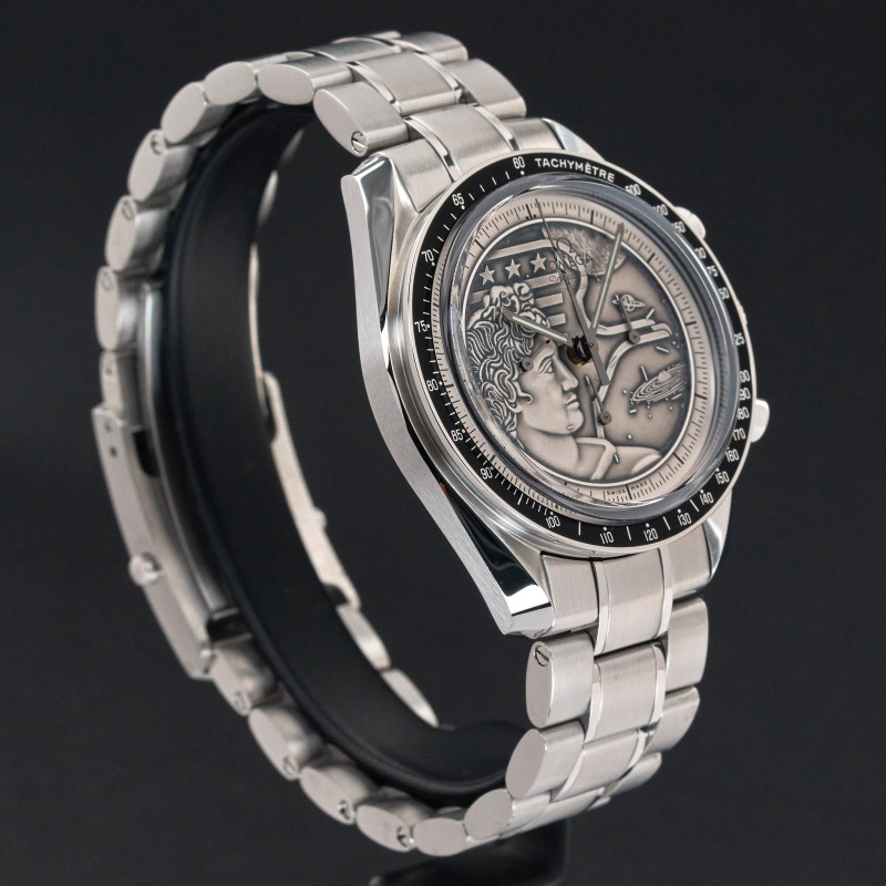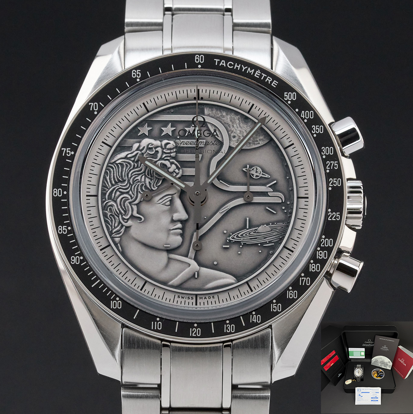 This Omega Speedmaster Professional Moonwatch 311.30.42.30.99.002 features a Silver Apollo XVII patch design dial and is crafted from stainless steel, with a production year of 2012.