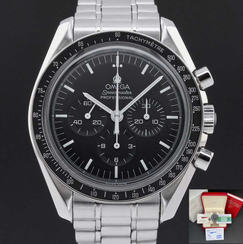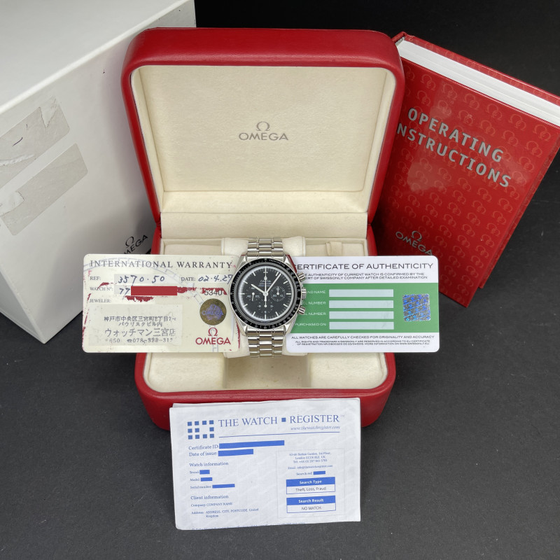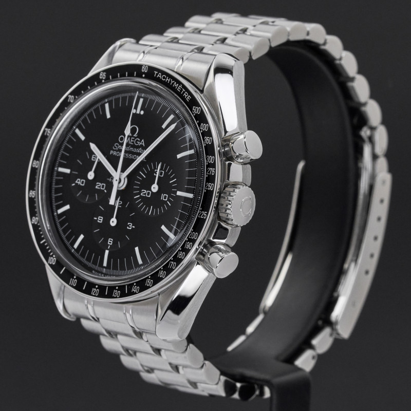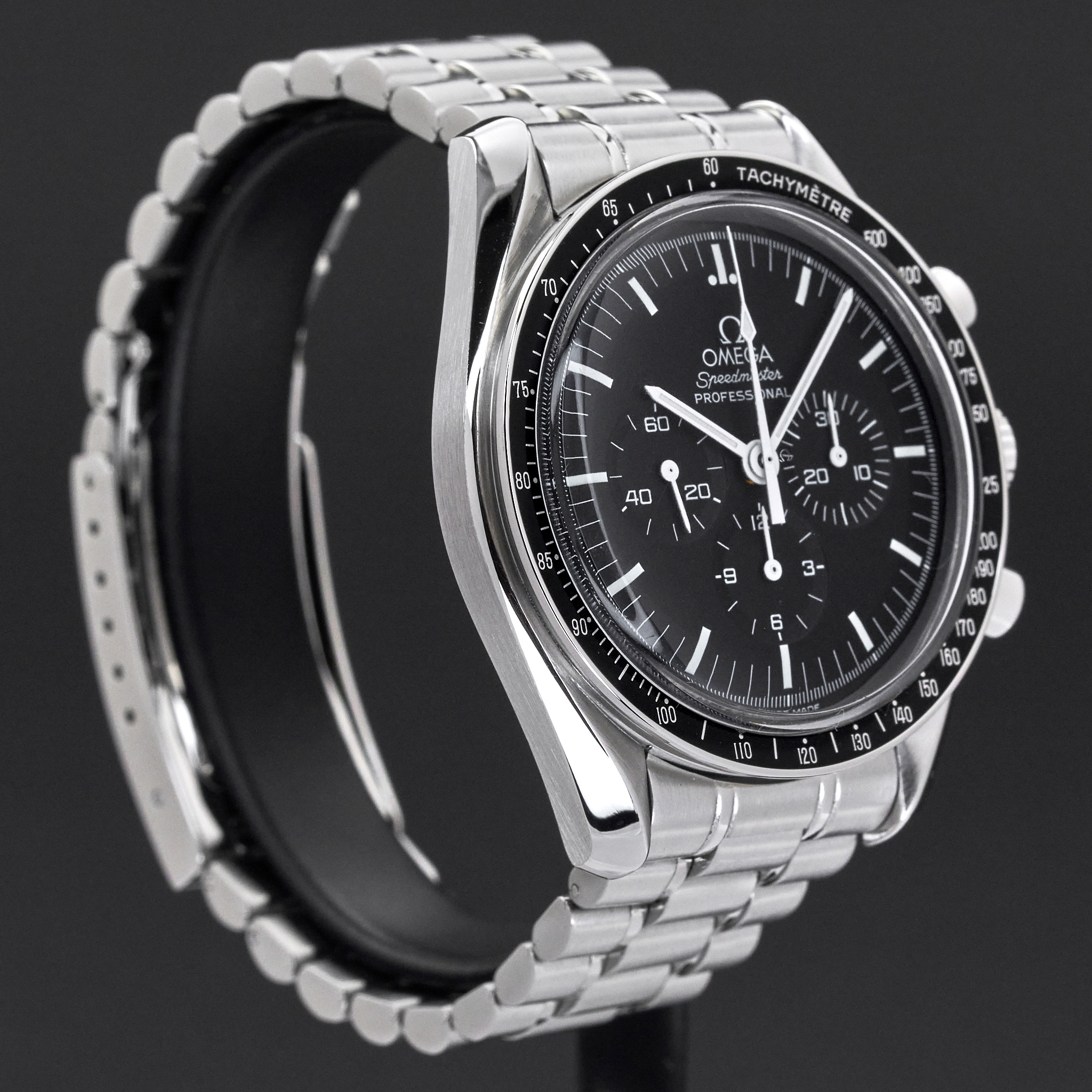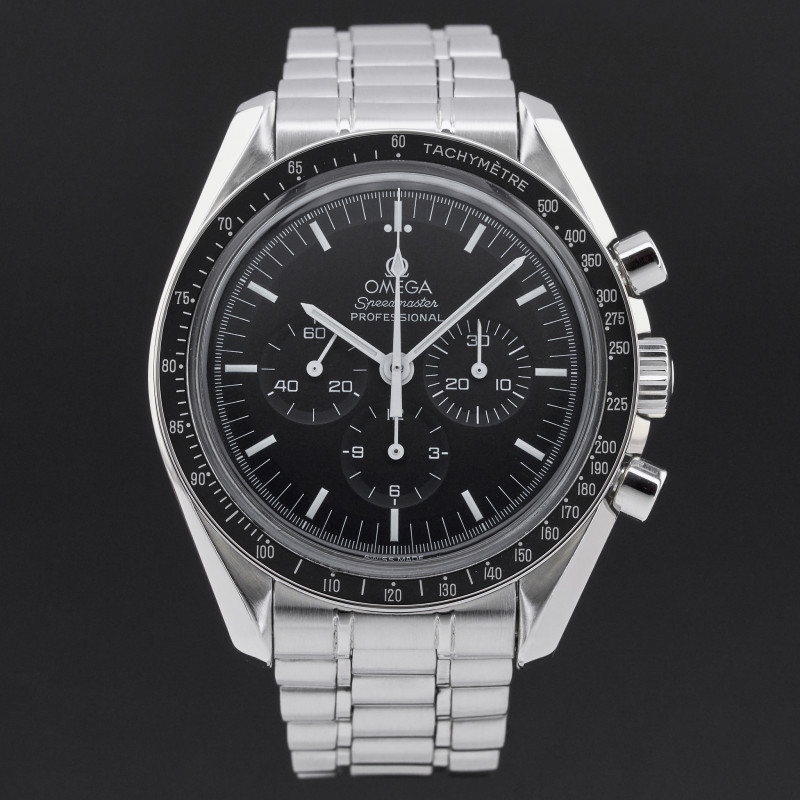 This Omega Speedmaster Professional Moonwatch 3570.50 features a Black dial and is crafted from stainless steel, with a production year of 2002.