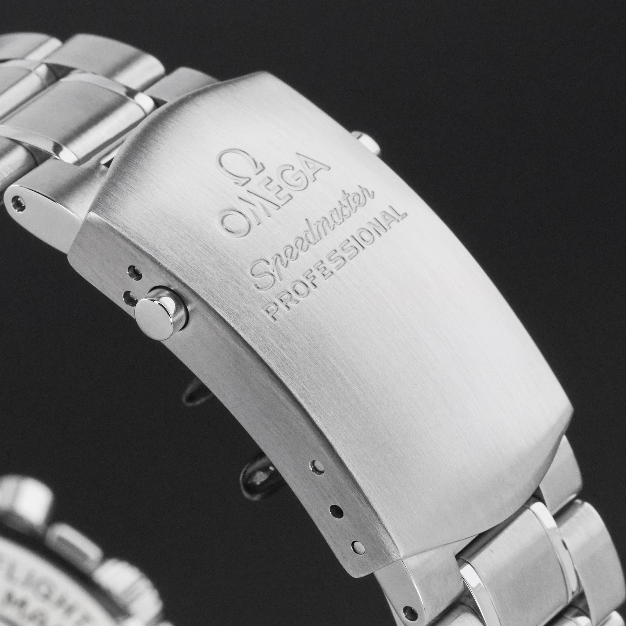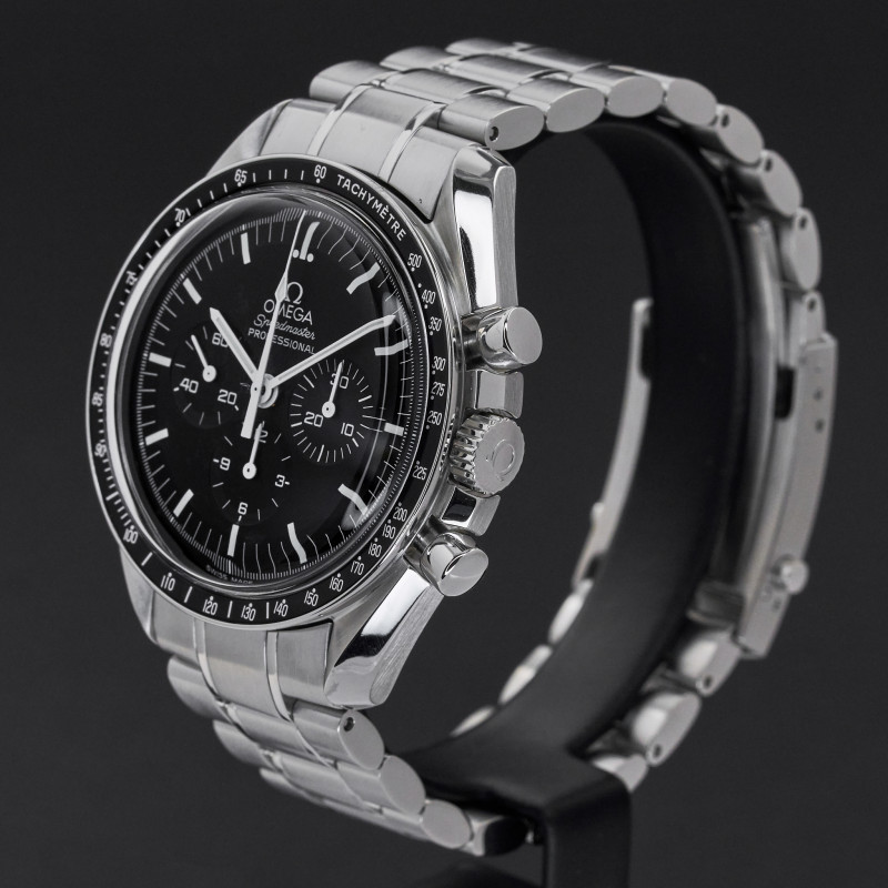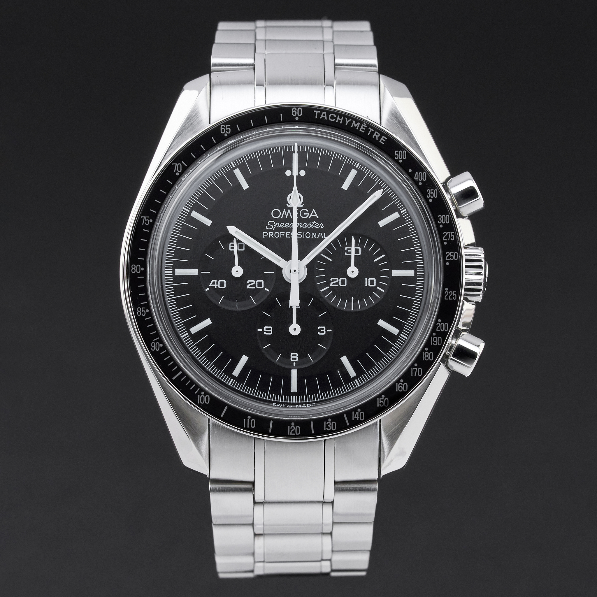 This Omega Speedmaster Professional Moonwatch 3570.50 features a Black dial and is crafted from stainless steel.
