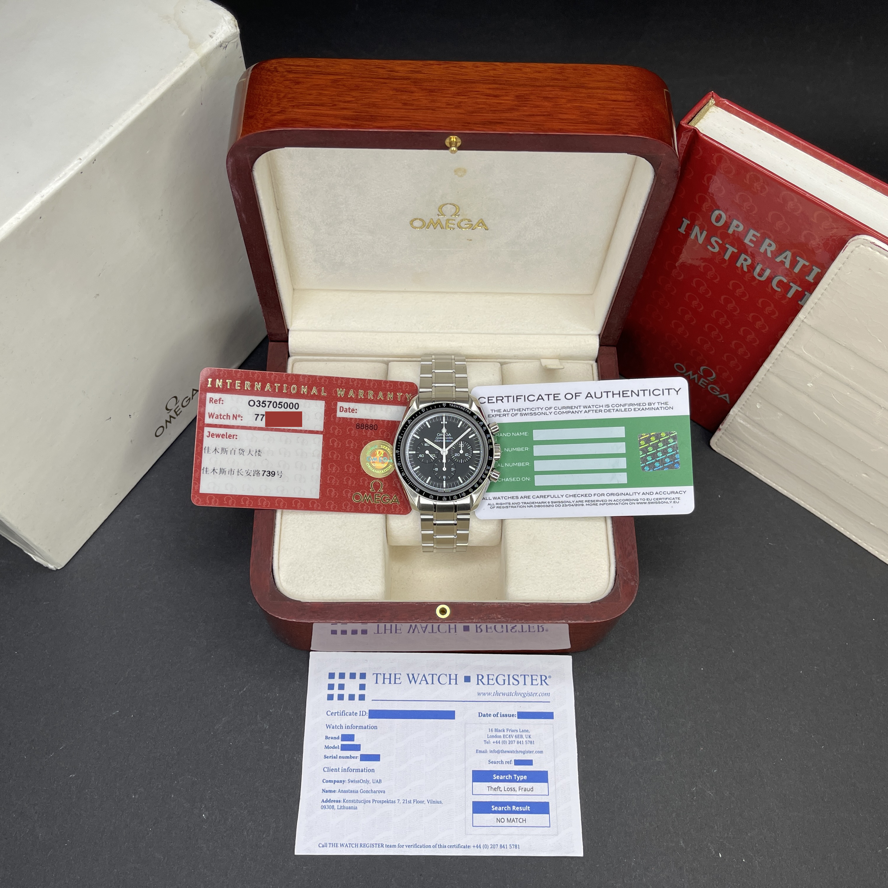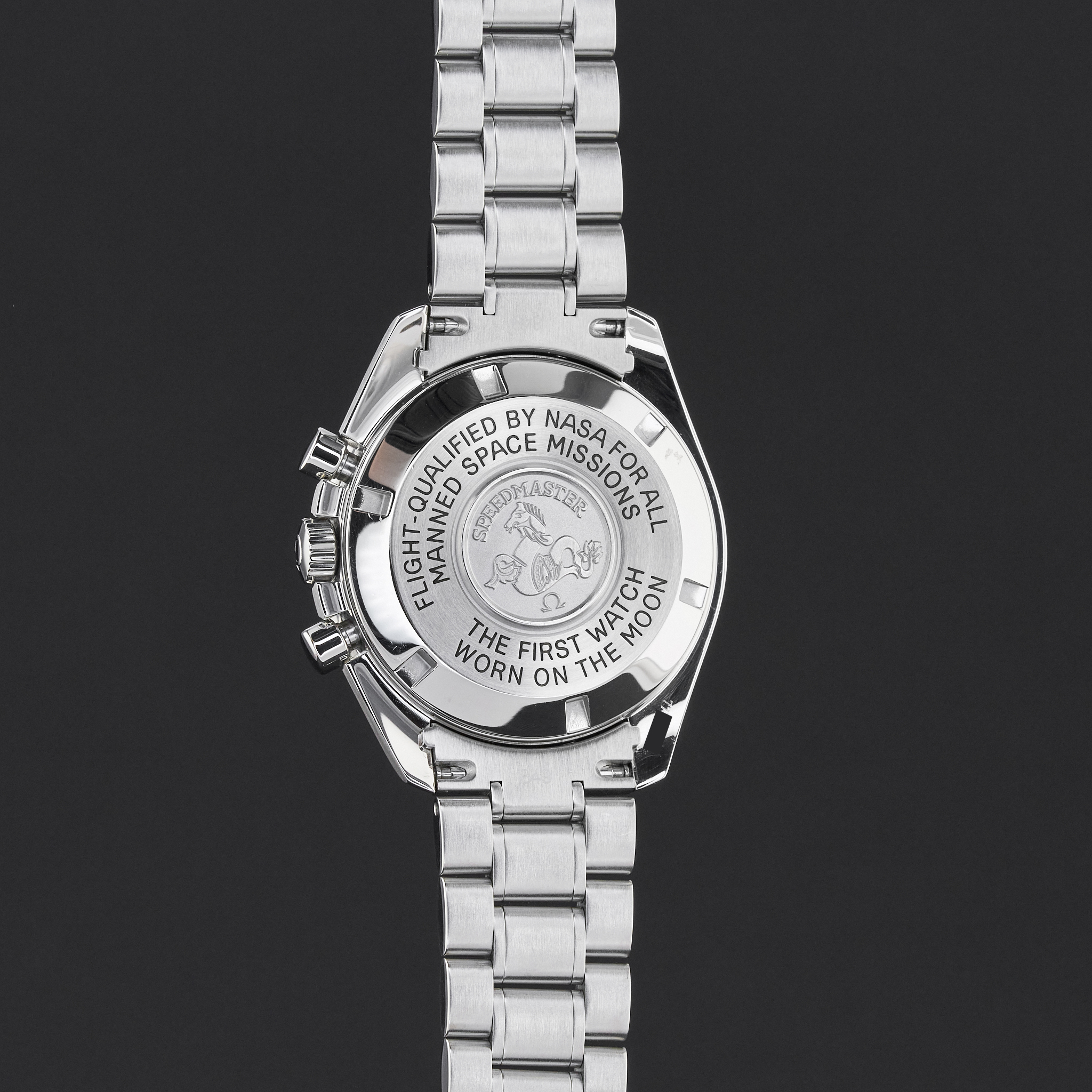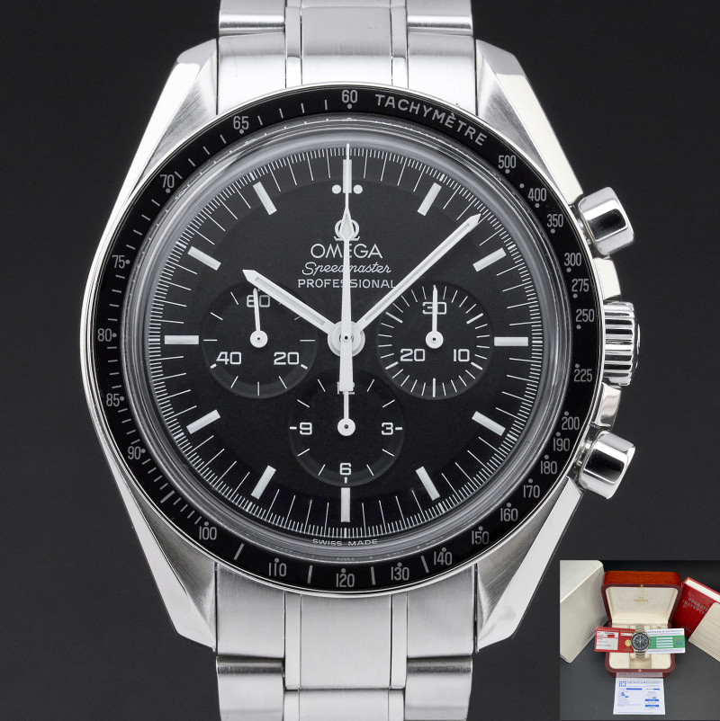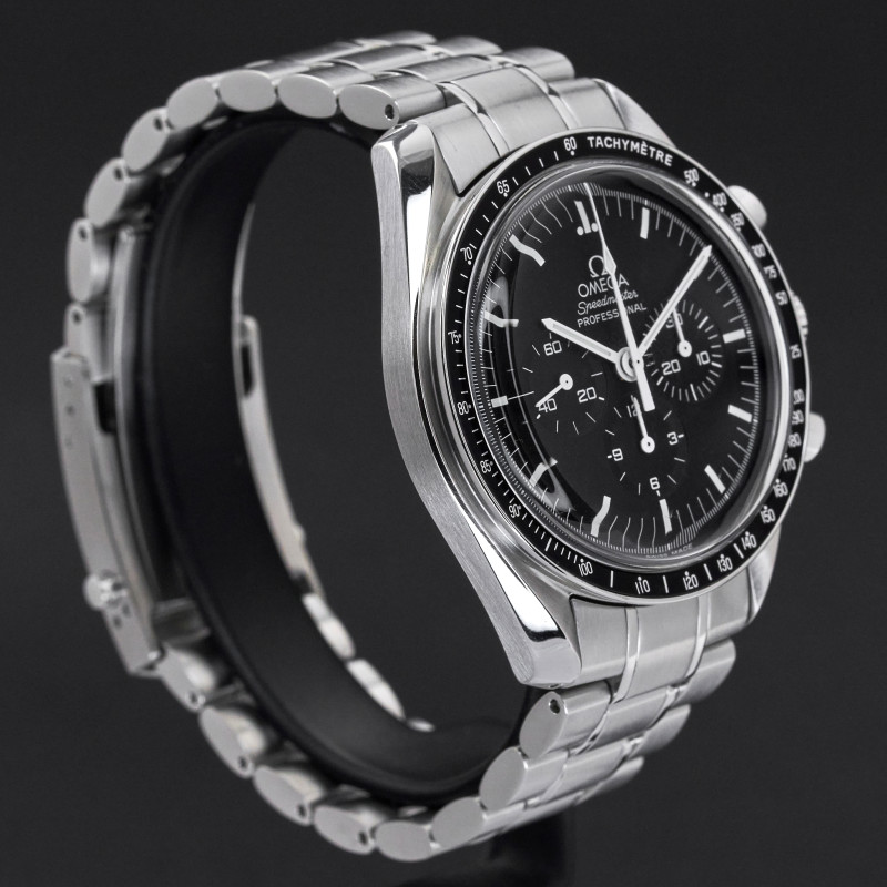 This Omega Speedmaster Professional Moonwatch 3570.50 features a Black dial and is crafted from stainless steel.
