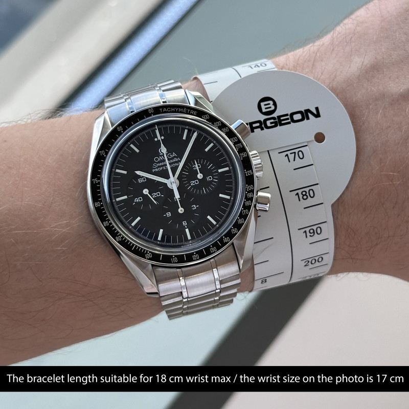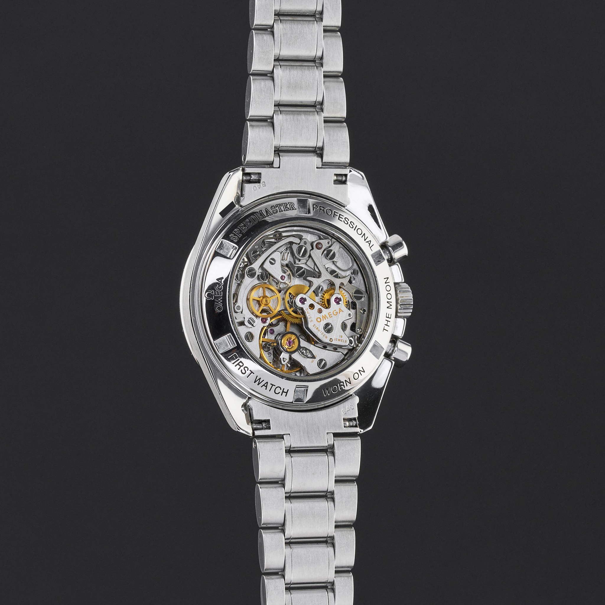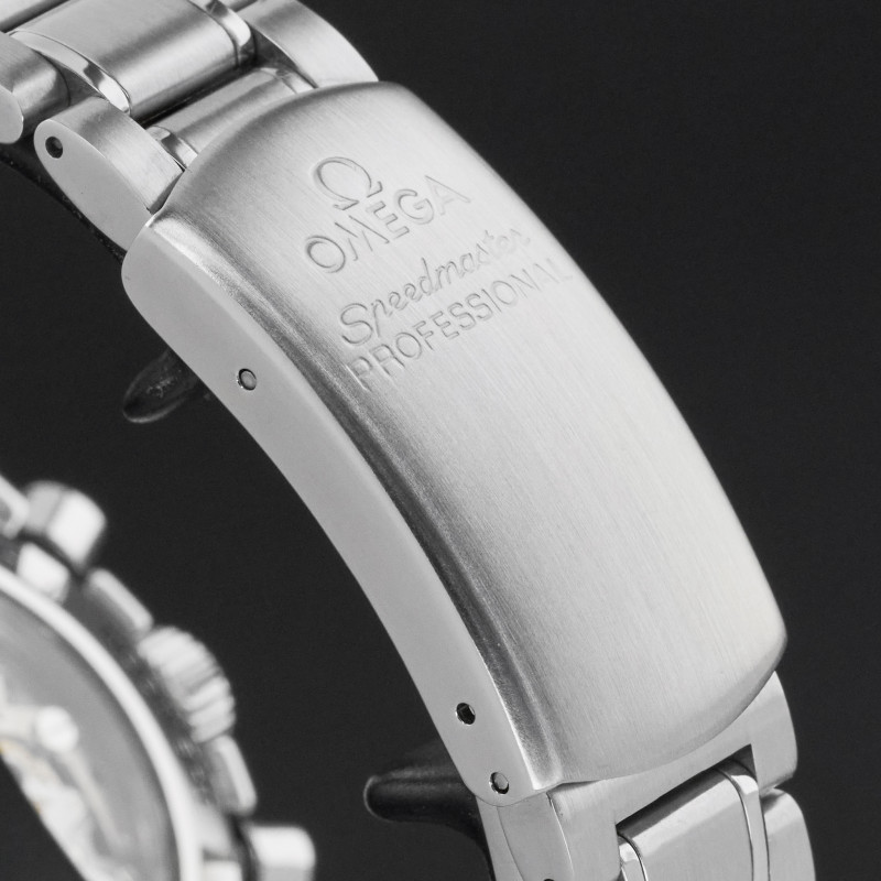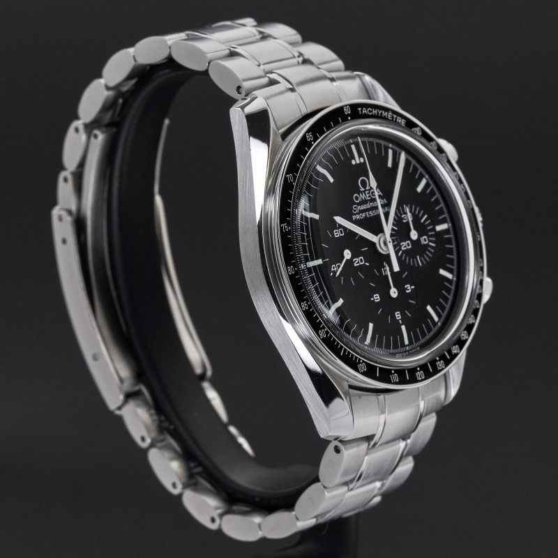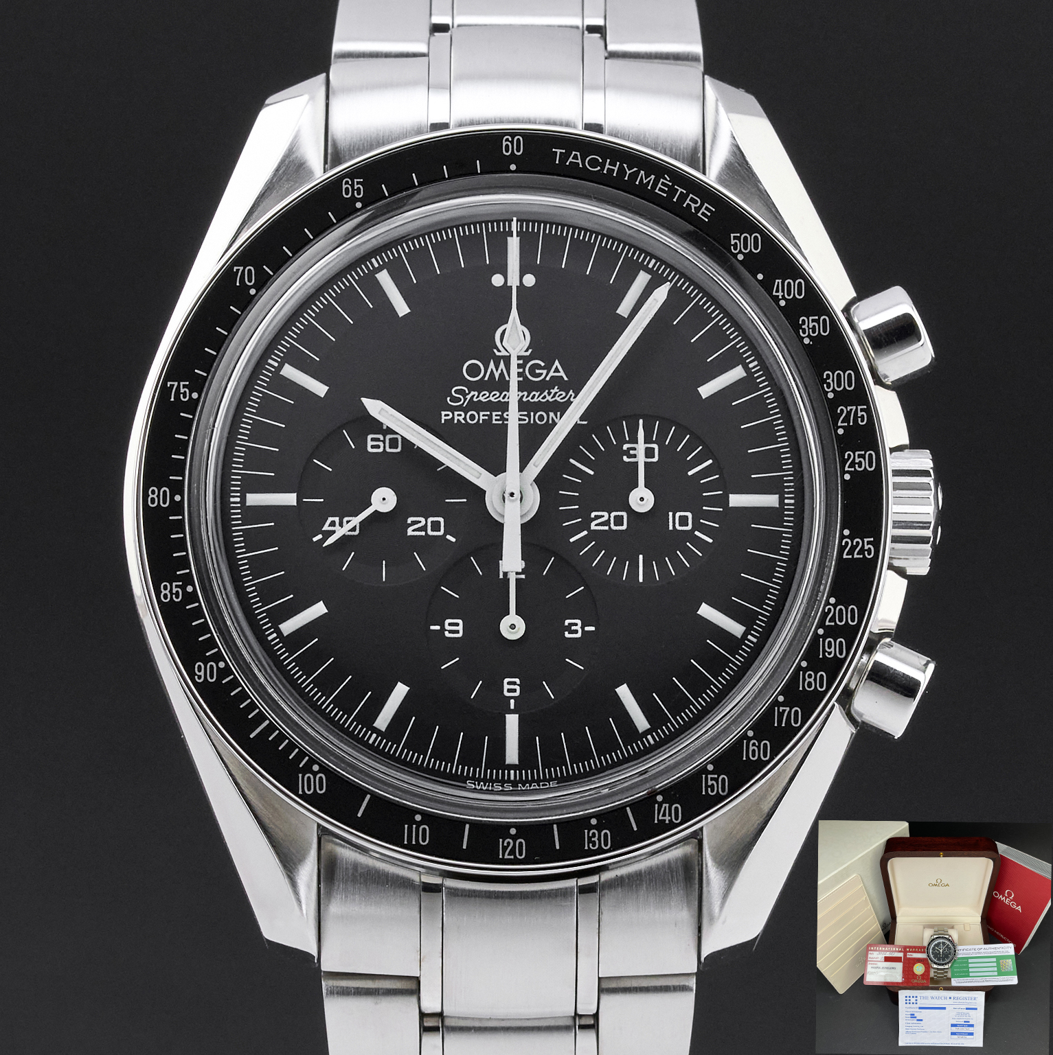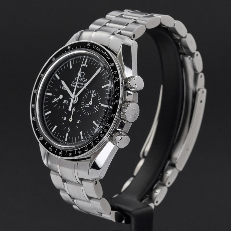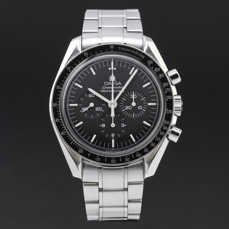 This Omega Speedmaster Professional Moonwatch 3572.50 features a Black dial and is crafted from stainless steel.
