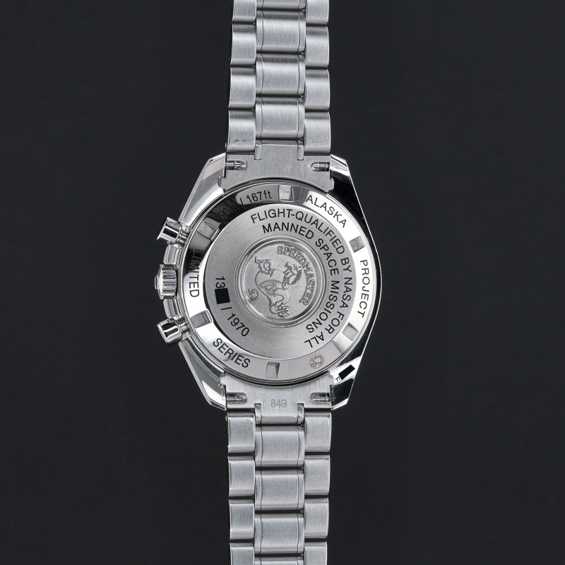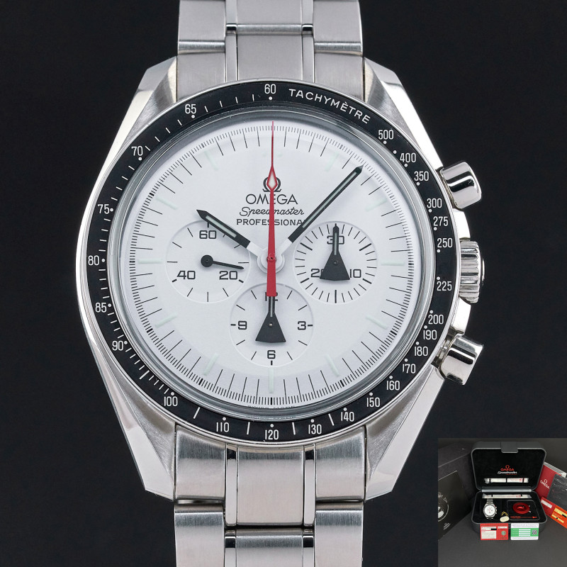 The Omega Speedmaster "Alaska Project" 311.32.42.30.04.001 is a distinctive timepiece that stands out with its rich history. This watch features a striking white dial, which contrasts beautifully with its three sub-dials, arranged in the classic Speedmaster layout. The sub-dials include the small seconds at 9 o’clock, a 30-minute recorder at 3 o’clock, and a 12-hour recorder at 6 o’clock. The luminous hands and markers ensure readability in low-light conditions, further emphasizing its practicality. Powered by the Omega Caliber 1861, the same manual-winding movement found in the legendary Moonwatch. Protecting the dial is a domed plexiglass crystal, chosen for its durability and resistance to shattering. The 42mm stainless steel case is robust and retains the classic Speedmaster silhouette. The watch is paired with a comfortable stainless steel bracelet, designed with a brushed finish that complements the case. One of the most unique features of this limited edition watch is the inclusion of a red anodized aluminum outer case, known as the "thermal shield," which was part of the original Alaska Project design. This outer case was engineered to protect the watch from extreme temperatures, making it a functional tool in addition to being a stylish accessory. The Omega logo and "Speedmaster" text are elegantly printed on the dial, maintaining the watch's iconic identity. Produced in a limited edition of just 1,970 pieces, the Omega Speedmaster "Alaska Project" 311.32.42.30.04.001 is not only a remarkable timepiece but also a tribute to Omega's legacy of innovation and exploration.