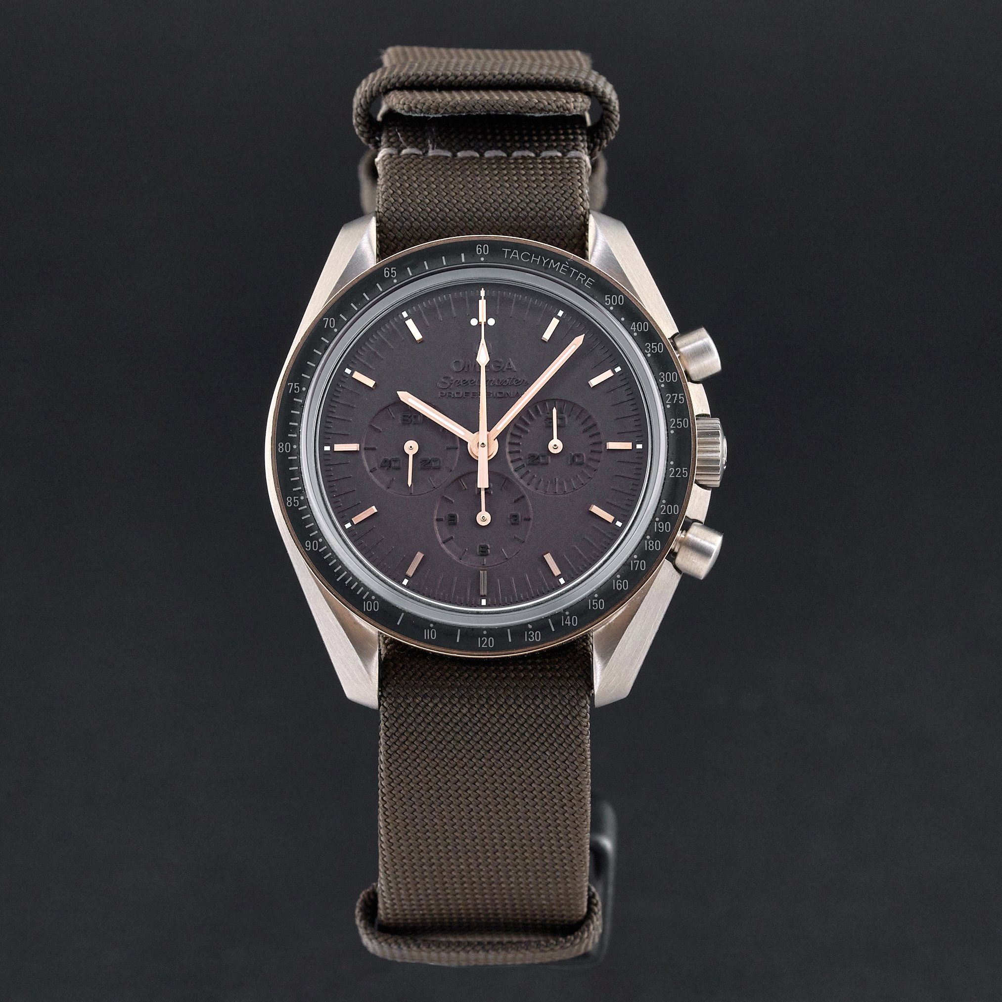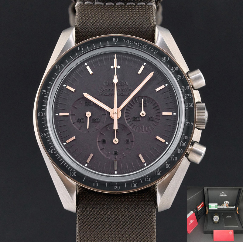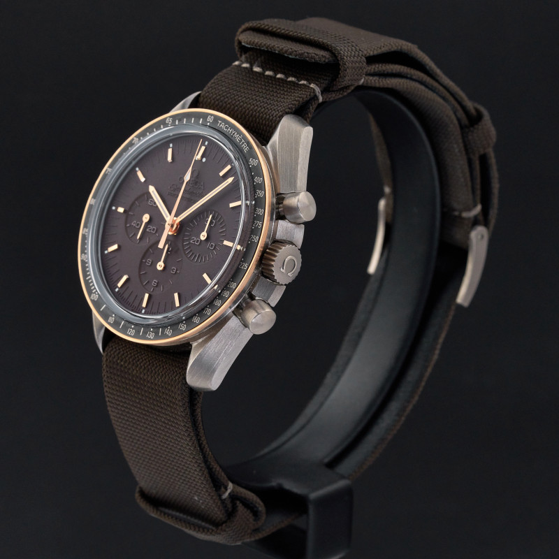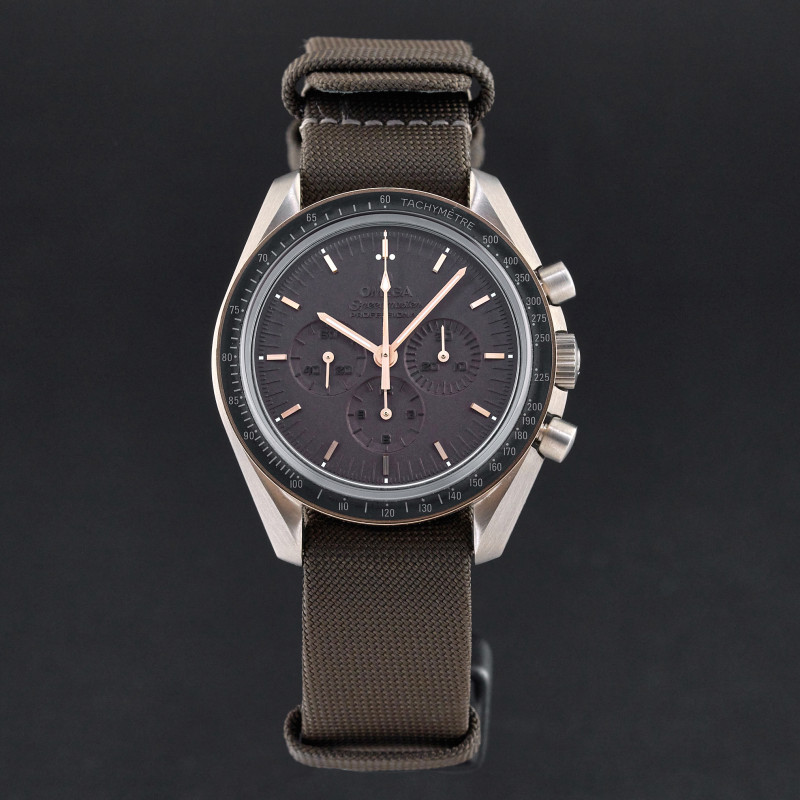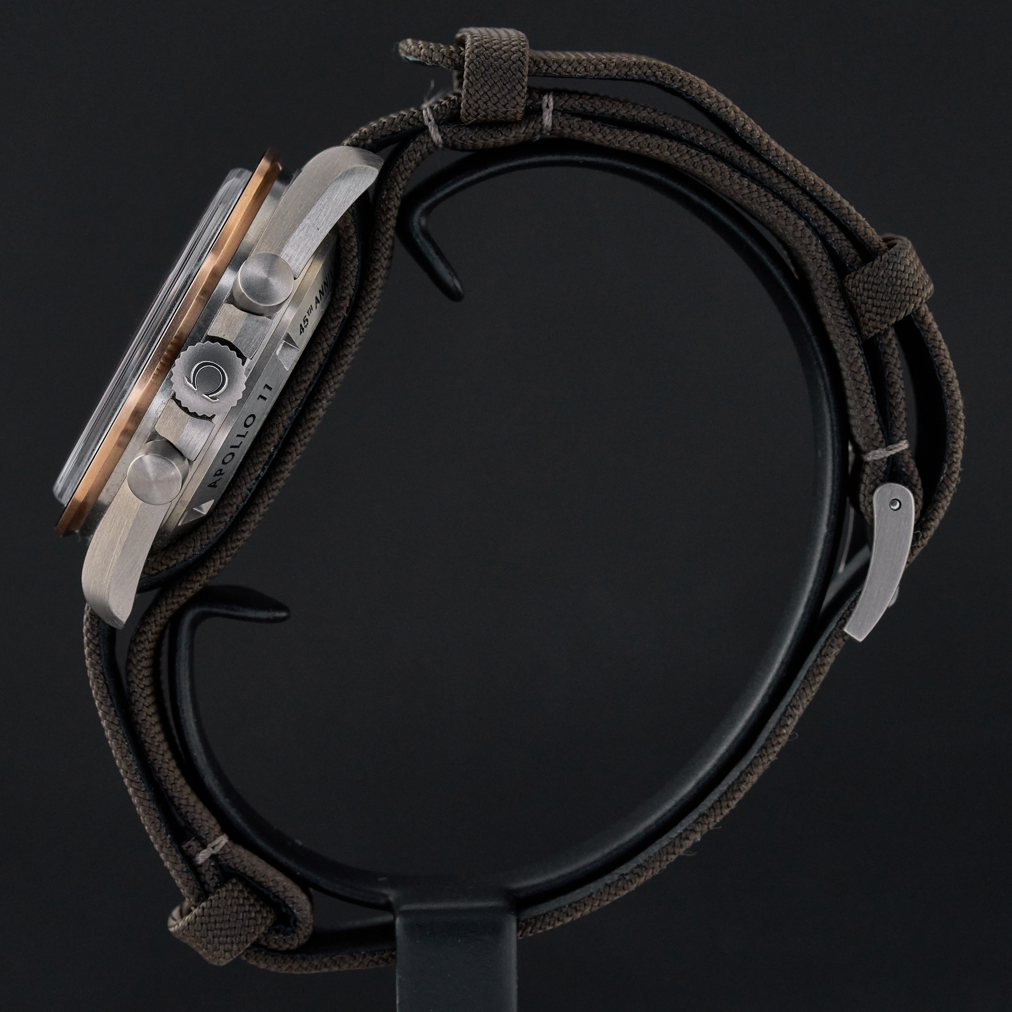 Introducing the OMEGA Speedmaster Professional Apollo 11 45th Anniversary Limited Edition wristwatch, a remarkable timepiece commemorating the first lunar landing and celebrating its enduring connection to space exploration. This watch, limited to just 1,969 pieces, honors the Apollo 11 mission with an innovative design and meticulous craftsmanship. The 42 mm case, made from lightweight grade 2 titanium, pays homage to the titanium ore found on the moon’s surface, providing a robust yet lightweight feel on the wrist. The brushed finish of the titanium case adds a contemporary aesthetic, while the 18K OMEGA Sedna gold bezel introduces a touch of elegance. This luxurious bezel is complemented by a matte brown ceramic ring featuring the iconic tachymeter scale—a hallmark of the Speedmaster collection. The grey PVD dial, produced using a special laser technique that removes material surrounding the design elements, creates a striking and unique face for this commemorative watch. The dial features three sub-dials: a 30-minute recorder, a 12-hour recorder, and a small seconds sub-dial. The watch is presented on a brown-coated nylon fabric NATO strap, inspired by the rugged straps used on military watches since the Second World War. This choice of strap not only enhances the vintage appeal of the watch but also ensures durability and comfort, suitable for everyday wear. The earthy brown tones of the strap and grey dial, combined with the brushed titanium and touches of gold, evoke the colors of the moon and the lunar and command modules. At its heart, the watch is powered by the OMEGA calibre 1861, an evolution of the calibre 861 that was used in many previous Moonwatch models. This movement, now upgraded with rhodium plating for improved corrosion resistance. The OMEGA Speedmaster remains the only flight-qualified watch that meets NASA's rigorous requirements for Extravehicular Activity (EVA), outperforming quartz watches with LCD displays that are prone to failure due to extreme temperature changes in space. The OMEGA Speedmaster Professional Apollo 11 45th Anniversary Limited Edition is more than just a watch—it is a tribute to human achievement and the pioneering spirit of space exploration.